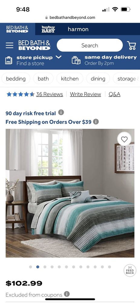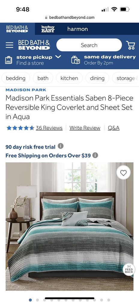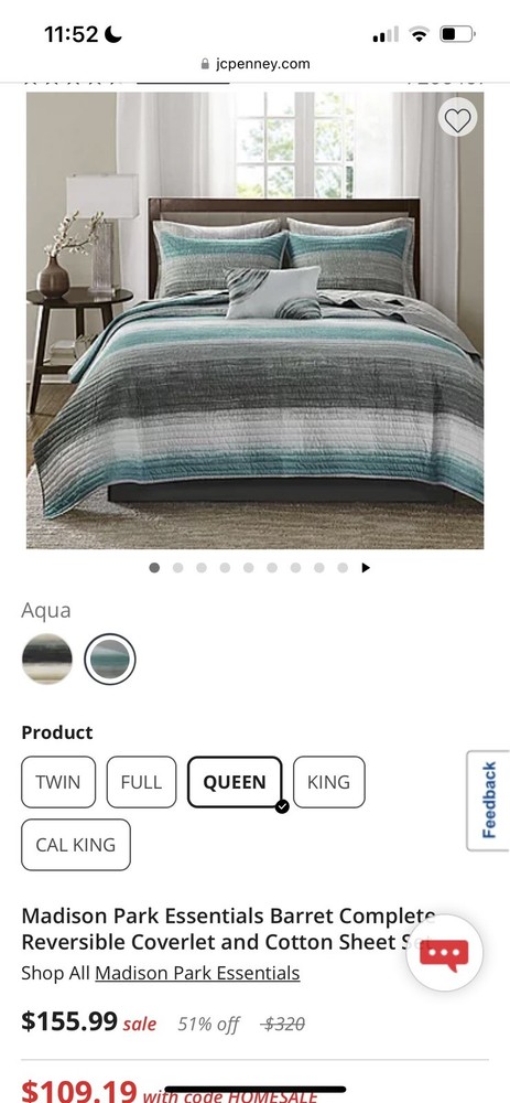 King size Madison Park Essentials set in a beautiful gradient teal, gray and white. Was sent the incorrect size, used this set once until my order was corrected. Includes a coverlet, 2 shams, 2 pillowcases, decorative pillow, flat and fitted sheet. Everything was washed and sanitized. From a smoke-free, minimally shedding dog’s home.