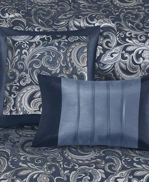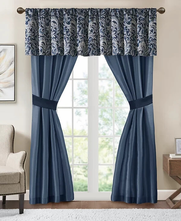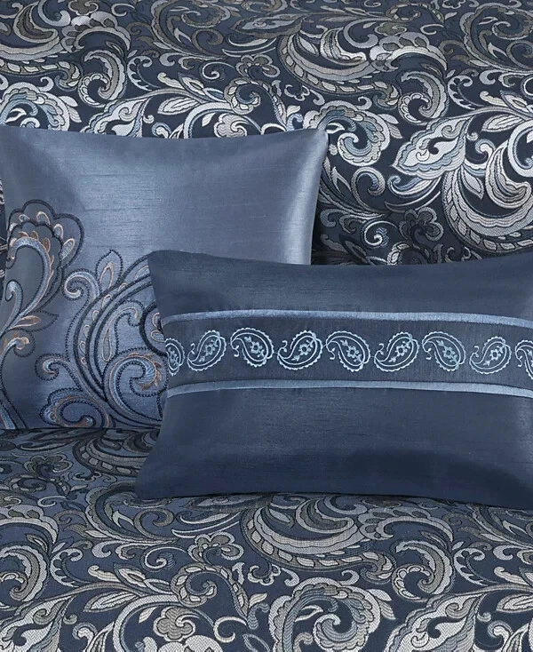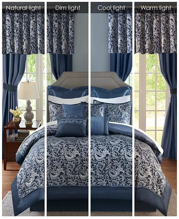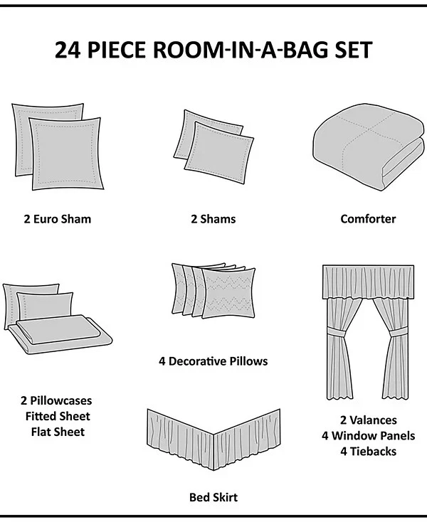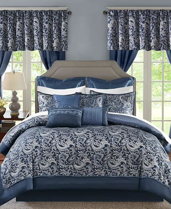 Update your entire room with the Essentials Eleni room in a bag from Madison Park, featuring an intricate paisley design for luxe style. Four decorative pillows use embroidery to create the perfect finishing touches to the top of the bed, while four window panels balance the two valances in matching bedding fabric. Four tiebacks, two European shams and a bedskirt complete this set in one cohesive look. Product Features Set includes: comforter (90" x 90"), bedskirt (60" x 80" x 15"), flat sheet (90" x 102"), fitted sheet (60" x 80" x 14"), two standard shams (20" x 26"), two European shams (26" x 26"), four decorative pillows (16" x 16", 12" x 18", 18" x 18", 12" x 16"), two pillowcases (20" x 30"), four window curtains (42" x 84"), two window valances (18" x 54") and four tiebacks (4" x 23") Comforter/sham/European sham/sheets: polyester 85 grams per square meter; bedskirt/decorative pillow/window panels/tiebacks/valance: polyester; comforter fill: polyester 270 grams per square meter; decorative pillow fill: polyester Machine washable. Spot clean pillows. Imported Please feel free to contact me with any que stions. I would rather provide you with more information now than have you be disappointed when your item arrives. (Smoke Free storage/environment.) Returns are only allowed on items that are not as described or damaged. This is how I am able to keep my prices low and offer free shipping. Please be sure that you genuinely want the item before purchasing.