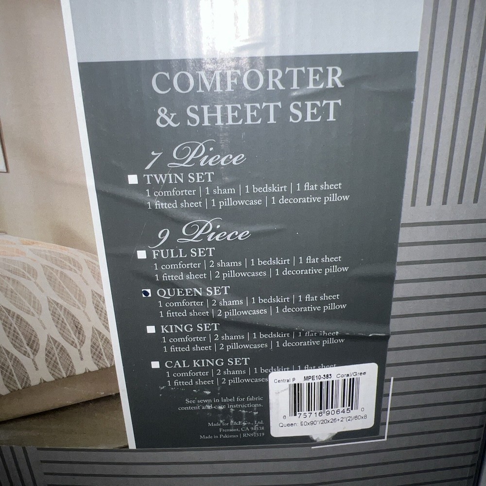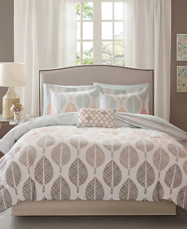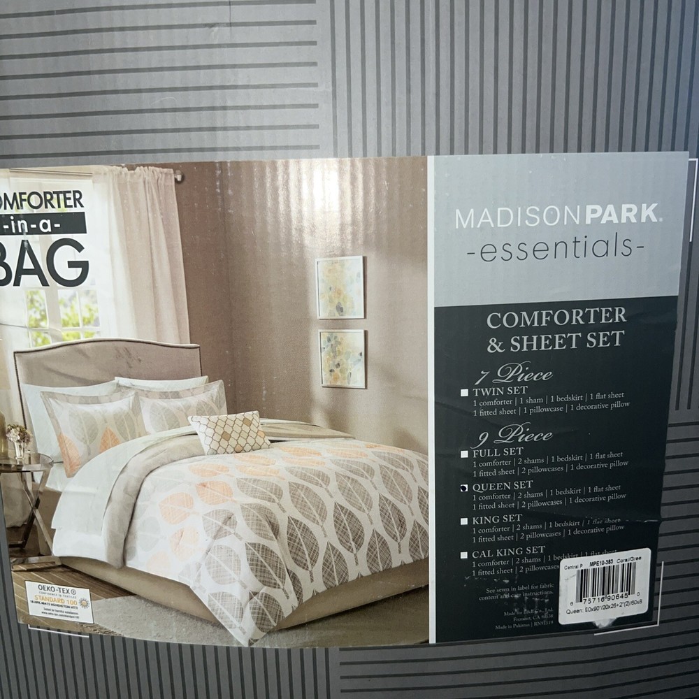 Add color and comfort to your bedroom with the Essentials Central Park comforter set from Madison Park. The comforter features a charming printed leaf that reverses to a solid. Matching shams bring the leaf motif to the head of the bed, while the sheet set harmonizes beautifully with the rest of the ensemble. An embroidered decorative pillow adds the finishing touch to the look. Set includes: comforter (90" x 90"), bedskirt (60" x 80" x 15"), flat sheet (90" x 102"), fitted sheet (60" x 80" x 14"), two standard pillowcases (20" x 30"), two standard shams (20" x 26") and one decorative pillow (12" x 18") Printed leaf design Asian American & Pacific Islander Owned, Woman Owned Comforter/sham/bedskirt: polyester 85 grams per square meter; pillow (cover): polyester; sheets: cotton; Thread count: 180; comforter fill: polyester 250 grams per square meter; pillow fill: polyester Machine washable. Spot clean pillows. Imported OEKO-TEX® Standard 100 Item will be shipped in a poly mailer with no box