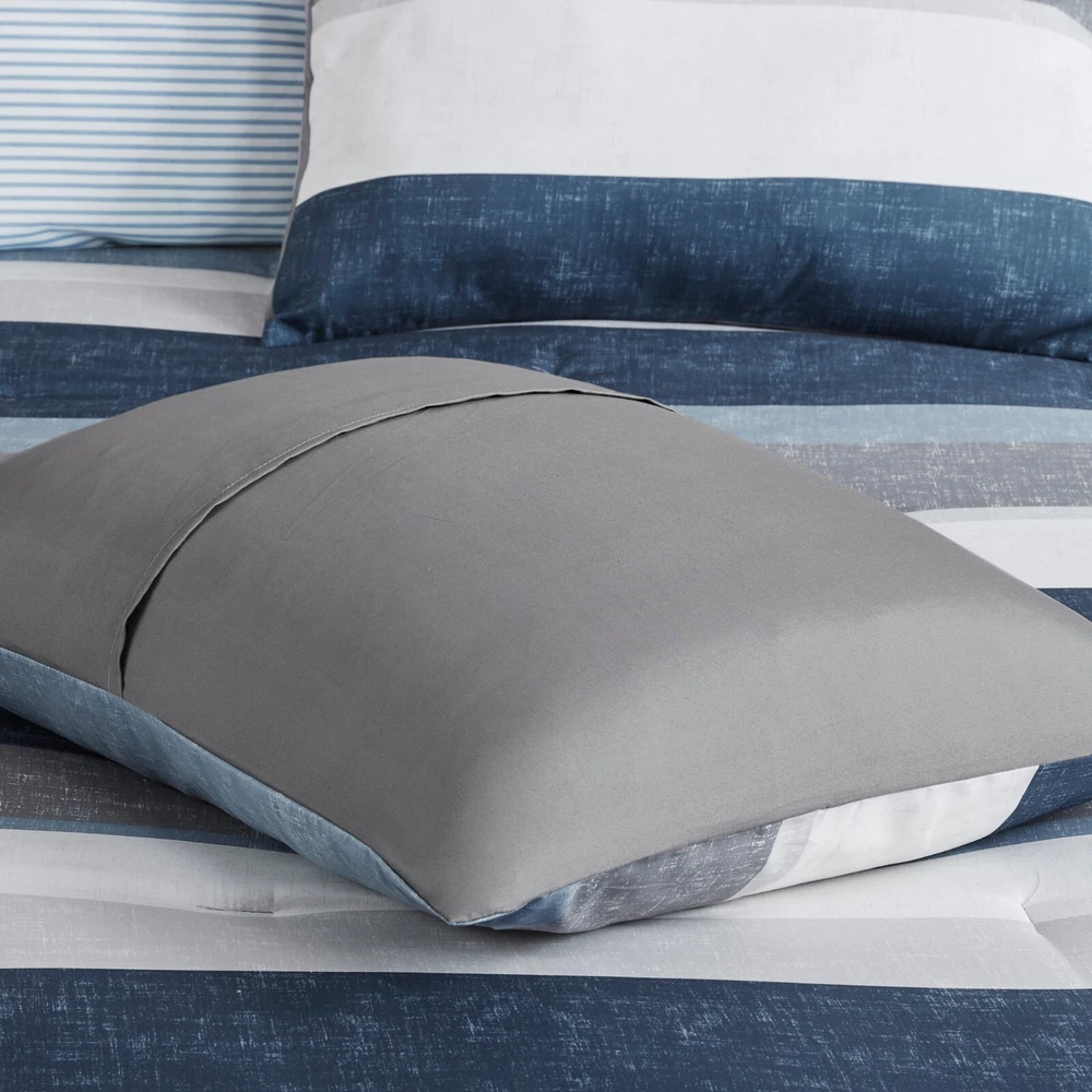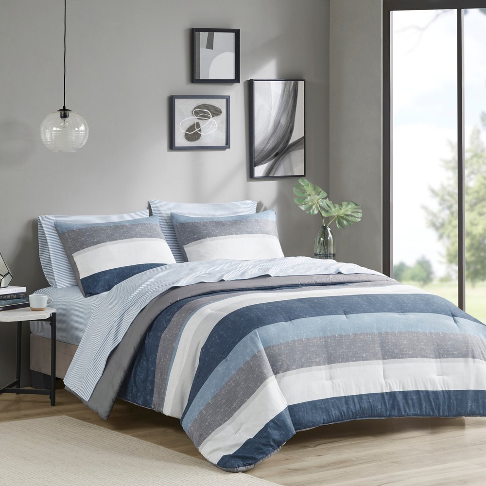 Madison Park Essentials Comforter Set with Bed Sheets Twin Full Queen King Size DESCRIPTION Revamp your bedroom style with the Madison Park Essentials Jaxon bed in a bag. This modern comforter set features a stripe pattern in alternating grey, navy, and blue colors that’s pair with a solid grey reverse to create a casual vibe. The included sheet set has a coordinating stripe design to complement the soft and cozy comforter’s look. Included in the set is 1 comforter, 2 shams (1 in Twin), 1 flat sheet, 1 fitted sheet, and 2 pillowcases (1 in Twin). The fitted sheet fits up to 14"(12"for Twin size) mattress depth. This machine washable bedding set is OEKO-TEX certified and features an antimicrobial treatment, which inhibits bacteria growth and keeps the bedding fresher for longer. Totally refresh your space without breaking the bank with this complete comforter set with bed sheets. FEATURES • Complete comforter bed set includes coordinating microfiber printed sheet set • Stripe comforter look in grey, navy, blue for casual and modern bedroom style with simple coordinating stripe design on sheet set • Set includes comforter, 2 shams (1 in Twin), 1 flat sheet, 1 fitted sheet, 2 pillowcases (1 in Twin) • Fitted sheet fits up to 14"(12"for Twin size) mattress depth • Hypoallergenic polyester filling in the comforter and pillows (filling contains no allergens and is treated to be dustproof) • Items in this set may come in rolled or compressed packaging and will need to be fluffed up • Machine washable in large capacity commercial washer/dryer; Steam iron to remove wrinkles from vacuum packaging • OEKO-TEX labeled textile certified as safe on skin • Antimicrobial treatment to keep the bedding/linen fresher for longer by inhibiting bacteria growth MATERIAL Comforter/Shams: 100% Polyester soft brushed microfiber, printed. Filling: 100% Polyester Sheet set: 100% Polyester microfiber, printed Available Sizes: Twin Comforter Set includes: 1 Comforter: 68"W x 86"L 1 Standard Sham: 20"W x 26"L 1 Flat Sheet: 66"W x 96"L 1 Fitted Sheet: 39"W x 75"L + 12"D 1 Standard Pillowcase: 20"W x 30"L Full Comforter Set includes: 1 Comforter: 78"W x 86"L 2 Standard Shams: 20"W x 26"L 1 Flat Sheet: 81"W x 96"L 1 Fitted Sheet: 54"W x 75"L + 14"D 2 Standard Pillowcases: 20"W x 30"L Queen Comforter Set includes: 1 Comforter: 90"W x 90"L 2 Standard Shams: 20"W x 26"L 1 Flat Sheet: 90"W x 102"L 1 Fitted Sheet: 60"W x 80"L + 14"D 2 Standard Pillowcases: 20"W x 30"L King Comforter Set includes: 1 Comforter: 104"W x 92"L 2 King Shams: 20"W x 36"L 1 Flat Sheet: 108"W x 102"L 1 Fitted Sheet: 78"W x 80"L + 14"D 2 King Pillowcases: 20"W x 40"L California King Comforter Set includes: 1 Comforter: 104"W x 92"L 2 King Shams: 20"W x 36"L 1 Flat Sheet: 108"W x 102"L 1 Fitted Sheet: 72"W x 84"L + 14"D 2 King Pillowcases: 20"W x 40"L