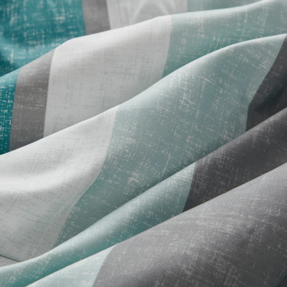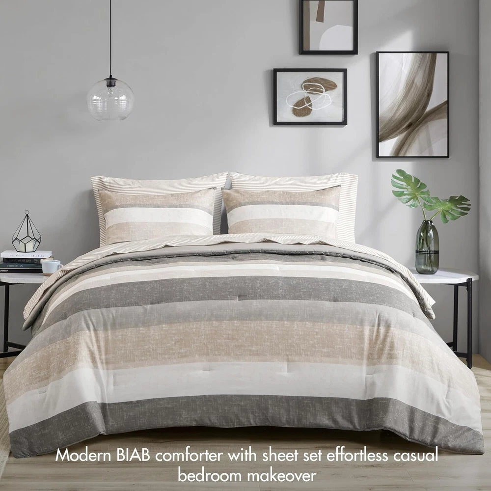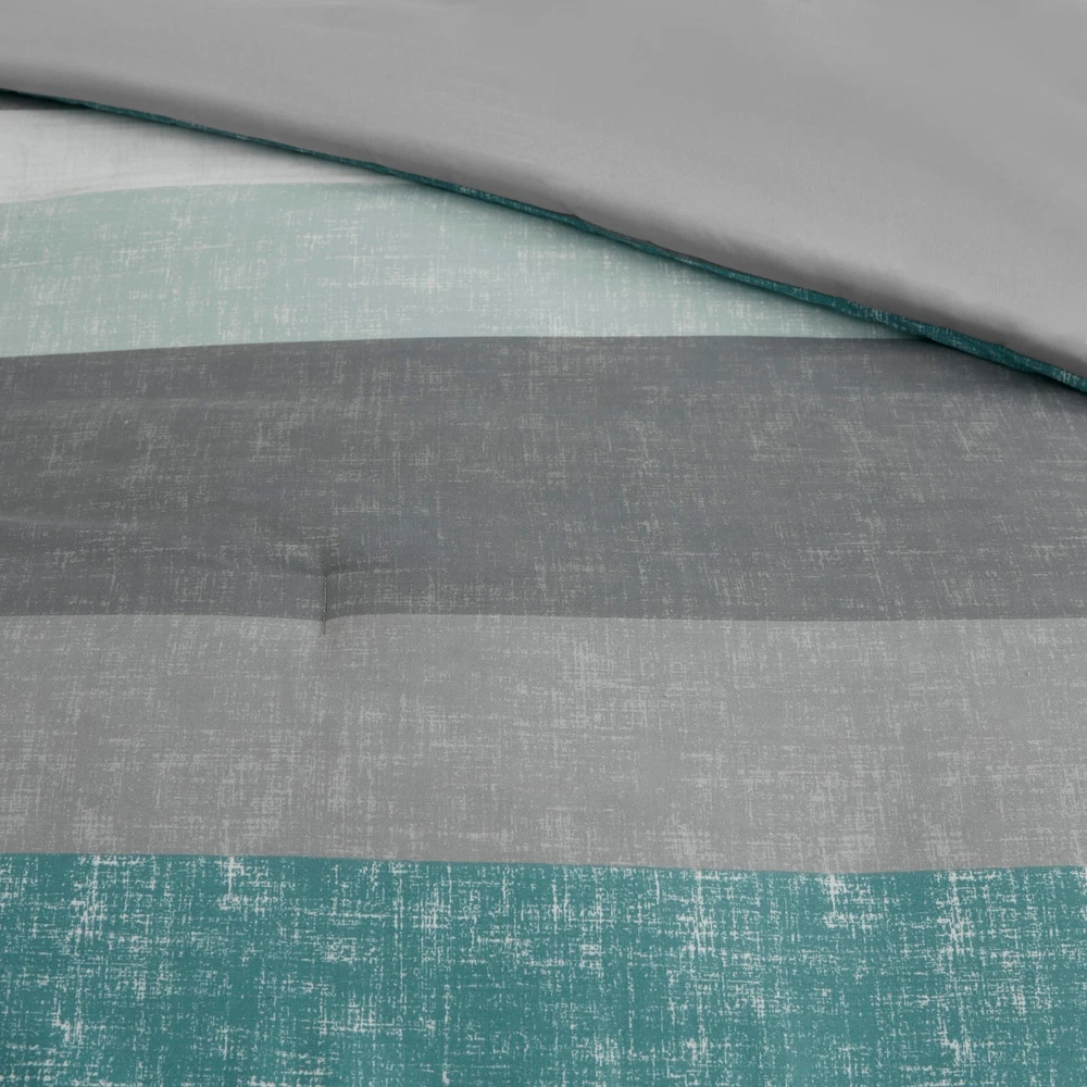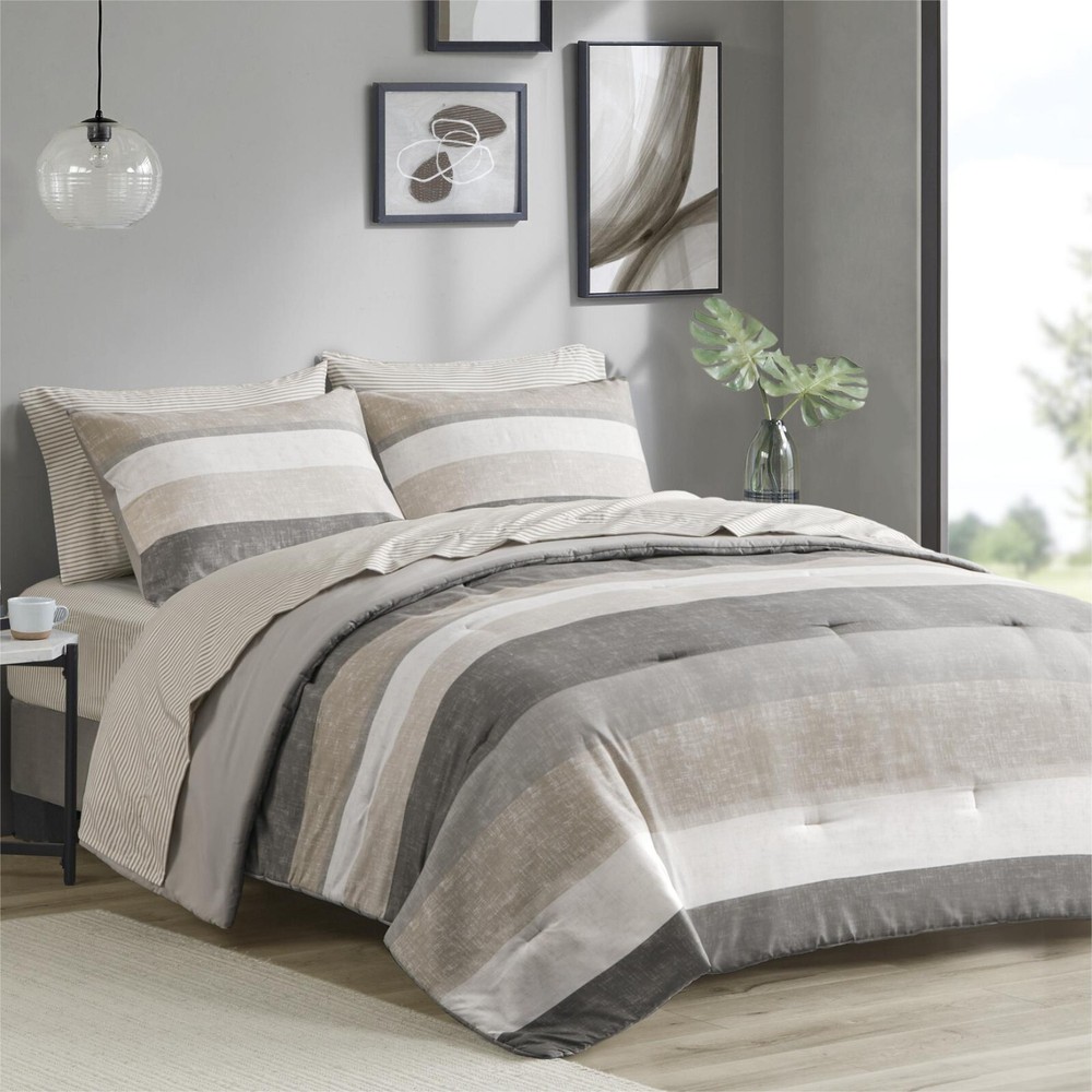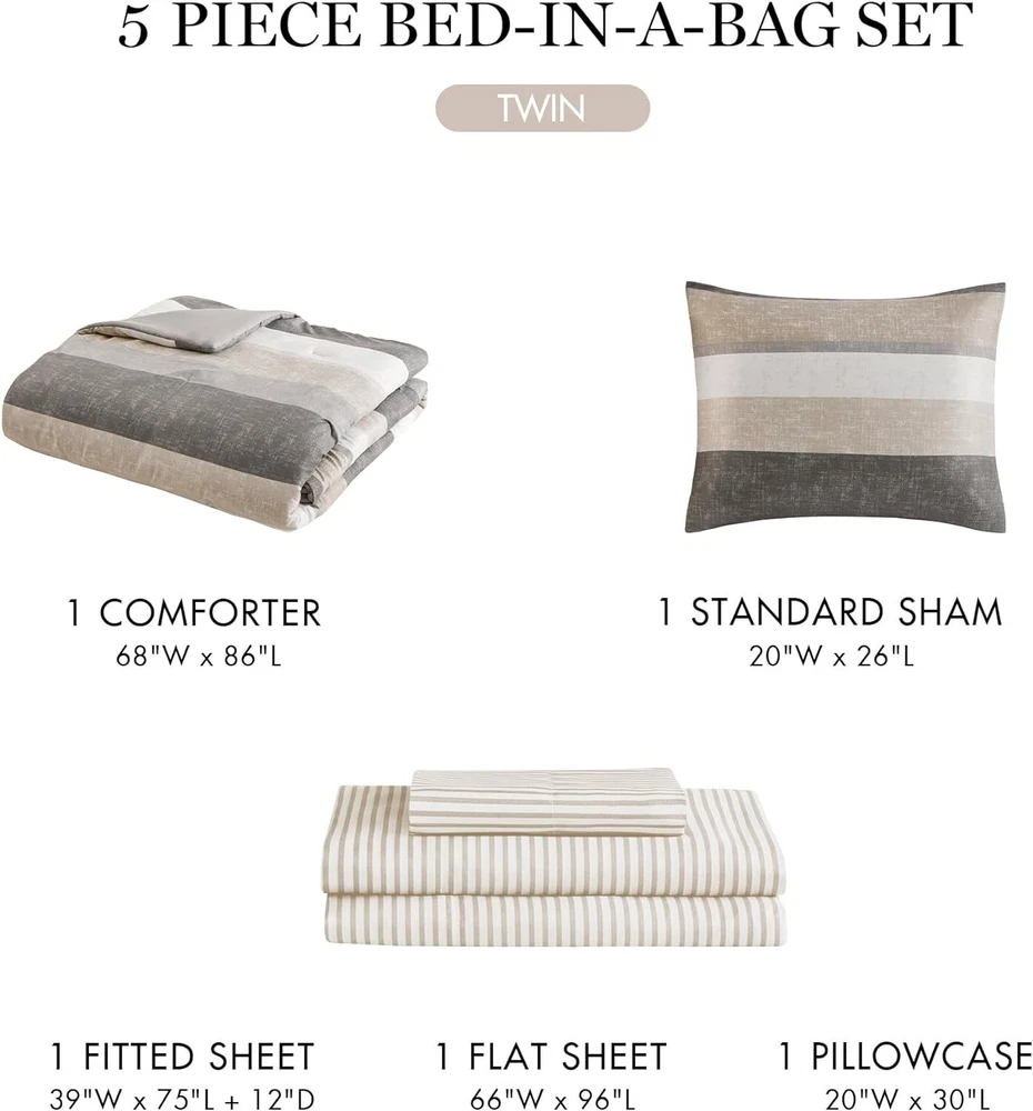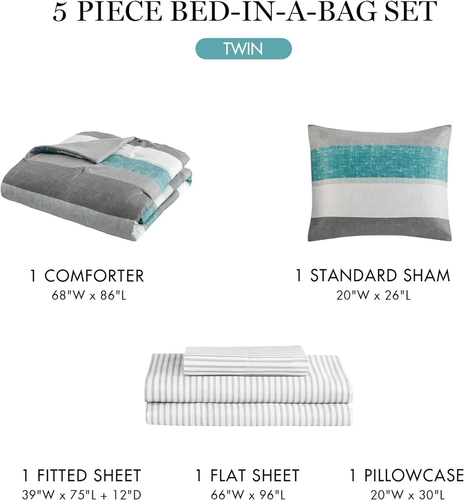 Madison Park Essentials Comforter Set with Bed Sheets Twin King Queen Full Size DESCRIPTION Revamp your bedroom style with the Madison Park Essentials Jaxon bed in a bag. This modern comforter set features a stripe pattern in alternating grey, white, and aqua colors that’s pair with a solid grey reverse to create a casual vibe. The included sheet set has a coordinating stripe design to complement the soft and cozy comforter’s look. Included in the set is 1 comforter, 2 shams (1 in Twin), 1 flat sheet, 1 fitted sheet, and 2 pillowcases (1 in Twin). The fitted sheet fits up to 14"(12"for Twin size) mattress depth. This machine washable bedding set is OEKO-TEX certified and features an antimicrobial treatment, which inhibits bacteria growth and keeps the bedding fresher for longer. Totally refresh your space without breaking the bank with this complete comforter set with bed sheets. FEATURES • Bed in a Bag Set includes comforter, 2 shams (1 in Twin), 1 flat sheet, 1 fitted sheet, 2 pillowcases (1 in Twin) • Soft brushed microfiber print comforter and shams; 100% Polyester filling • Stripe comforter look in aqua, greys and white for casual and modern bedroom style with simple coordinating stripe design on sheet set • Fitted sheet fits up to 16"(14"for Twin size) mattress depth, comes fully elasticized for better coverage and fit • Machine washable and spot clean fabric (See care label) • Commercial washer and dryer recommended to provide ample room for movement • Items may come in compressed packaging to ensure efficient shipping • Items will need to be fluffed up and steam ironed if compressed • Hypoallergenic polyester comforter filling contains no allergens and is dust proof • OEKO-TEX labeled textile certified as safe on skin • Antimicrobial treatment to keep the bedding/linen fresher for longer by inhibiting bacteria growth MATERIAL Comforter/Shams: 100% Polyester soft brushed microfiber, printed. Filling: 100% Polyester Sheet Set: 100% Polyester microfiber, printed Available Sizes: Twin Comforter Set includes: 1 Comforter: 68"W x 86"L 1 Standard Sham: 20"W x 26"L 1 Flat Sheet: 66"W x 96"L 1 Fitted Sheet: 39"W x 75"L + 12"D 1 Pillowcase: 20"W x 30"L Full Comforter Set includes: 1 Comforter: 78"W x 86"L 2 Standard Shams: 20"W x 26"L 1 Flat Sheet: 81"W x 96"L 1 Fitted Sheet: 54"W x 75"L + 14"D 2 Pillowcases: 20"W x 30"L Queen Comforter Set includes: 1 Comforter: 90"W x 90"L 2 Standard Shams: 20"W x 26"L 1 Flat Sheet: 90"W x 102"L 1 Fitted Sheet: 60"W x 80"L + 14"D 2 Pillowcases: 20"W x 30"L King Comforter Set includes: 1 Comforter: 104"W x 92"L 2 King Shams: 20"W x 36"L 1 Flat Sheet: 108"W x 102"L 1 Fitted Sheet: 78"W x 80"L + 14"D 2 Pillowcases: 20"W x 40"L California King Comforter Set includes: 1 Comforter: 104"W x 92"L 2 King Shams: 20"W x 36"L 1 Flat Sheet: 108"W x 102"L 1 Fitted Sheet: 72"W x 84"L + 14"D 2 Pillowcases: 20"W x 40"L