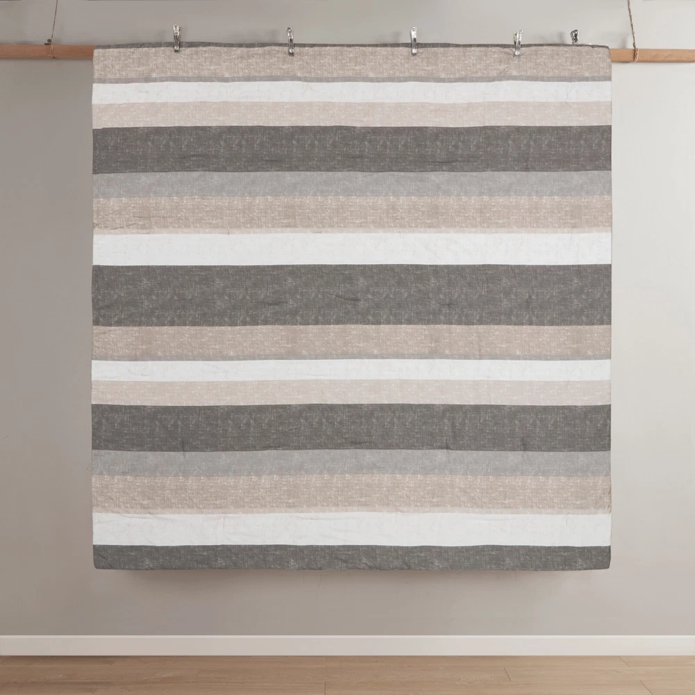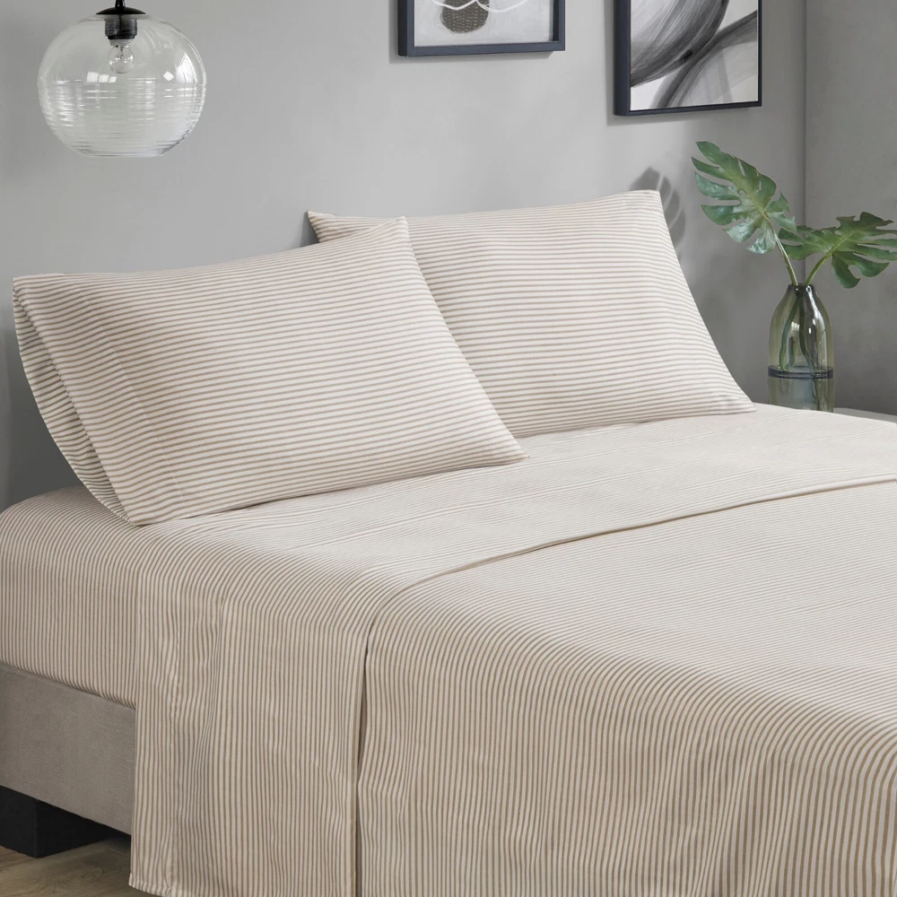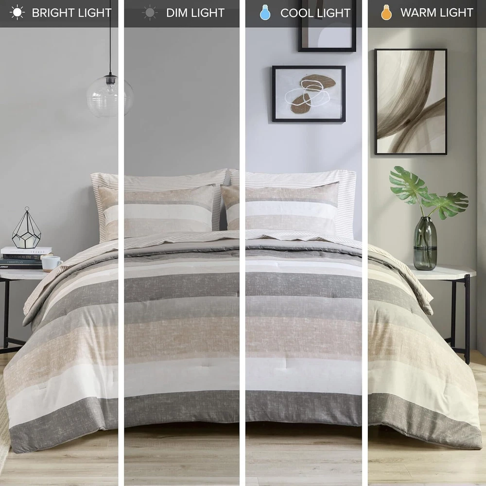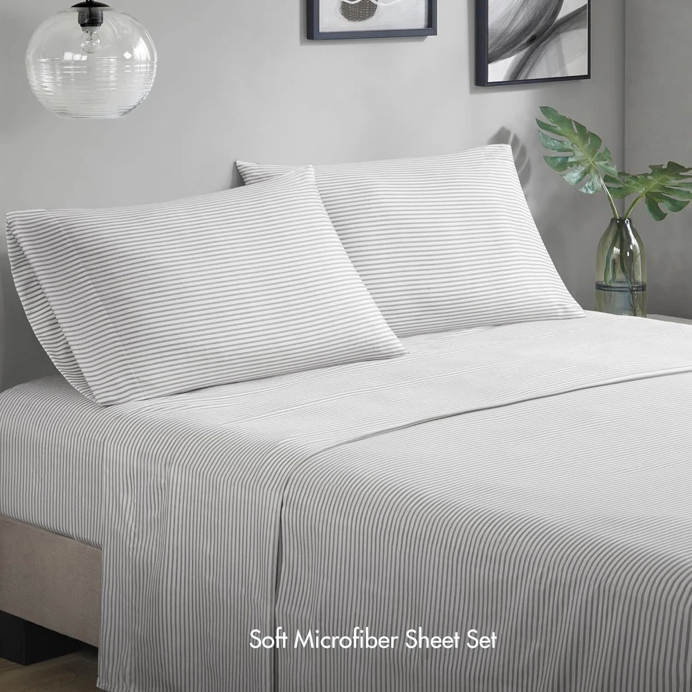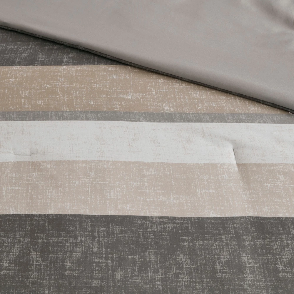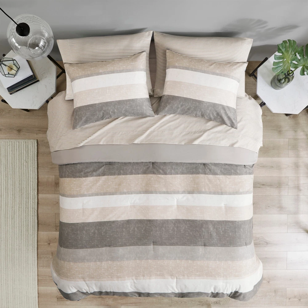 Madison Park Essentials Comforter Set with Bed Sheets Twin King Queen Full Size DESCRIPTION Revamp your bedroom style with the Madison Park Essentials Jaxon bed in a bag. This modern comforter set features a stripe pattern in alternating grey, white, and aqua colors that’s pair with a solid grey reverse to create a casual vibe. The included sheet set has a coordinating stripe design to complement the soft and cozy comforter’s look. Included in the set is 1 comforter, 2 shams (1 in Twin), 1 flat sheet, 1 fitted sheet, and 2 pillowcases (1 in Twin). The fitted sheet fits up to 14"(12"for Twin size) mattress depth. This machine washable bedding set is OEKO-TEX certified and features an antimicrobial treatment, which inhibits bacteria growth and keeps the bedding fresher for longer. Totally refresh your space without breaking the bank with this complete comforter set with bed sheets. FEATURES • Bed in a Bag Set includes comforter, 2 shams (1 in Twin), 1 flat sheet, 1 fitted sheet, 2 pillowcases (1 in Twin) • Soft brushed microfiber print comforter and shams; 100% Polyester filling • Stripe comforter look in aqua, greys and white for casual and modern bedroom style with simple coordinating stripe design on sheet set • Fitted sheet fits up to 16"(14"for Twin size) mattress depth, comes fully elasticized for better coverage and fit • Machine washable and spot clean fabric (See care label) • Commercial washer and dryer recommended to provide ample room for movement • Items may come in compressed packaging to ensure efficient shipping • Items will need to be fluffed up and steam ironed if compressed • Hypoallergenic polyester comforter filling contains no allergens and is dust proof • OEKO-TEX labeled textile certified as safe on skin • Antimicrobial treatment to keep the bedding/linen fresher for longer by inhibiting bacteria growth MATERIAL Comforter/Shams: 100% Polyester soft brushed microfiber, printed. Filling: 100% Polyester Sheet Set: 100% Polyester microfiber, printed Available Sizes: Twin Comforter Set includes: 1 Comforter: 68"W x 86"L 1 Standard Sham: 20"W x 26"L 1 Flat Sheet: 66"W x 96"L 1 Fitted Sheet: 39"W x 75"L + 12"D 1 Pillowcase: 20"W x 30"L Full Comforter Set includes: 1 Comforter: 78"W x 86"L 2 Standard Shams: 20"W x 26"L 1 Flat Sheet: 81"W x 96"L 1 Fitted Sheet: 54"W x 75"L + 14"D 2 Pillowcases: 20"W x 30"L Queen Comforter Set includes: 1 Comforter: 90"W x 90"L 2 Standard Shams: 20"W x 26"L 1 Flat Sheet: 90"W x 102"L 1 Fitted Sheet: 60"W x 80"L + 14"D 2 Pillowcases: 20"W x 30"L King Comforter Set includes: 1 Comforter: 104"W x 92"L 2 King Shams: 20"W x 36"L 1 Flat Sheet: 108"W x 102"L 1 Fitted Sheet: 78"W x 80"L + 14"D 2 Pillowcases: 20"W x 40"L California King Comforter Set includes: 1 Comforter: 104"W x 92"L 2 King Shams: 20"W x 36"L 1 Flat Sheet: 108"W x 102"L 1 Fitted Sheet: 72"W x 84"L + 14"D 2 Pillowcases: 20"W x 40"L