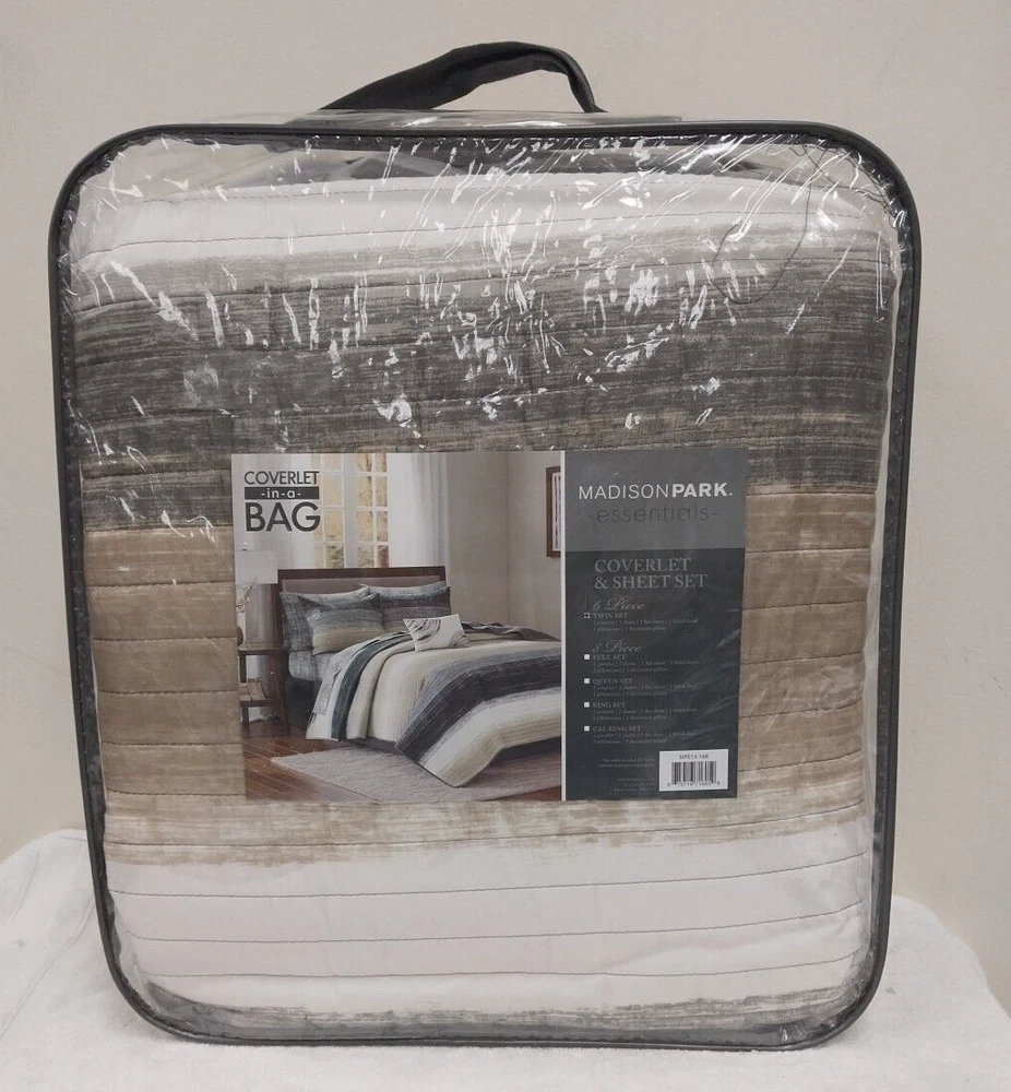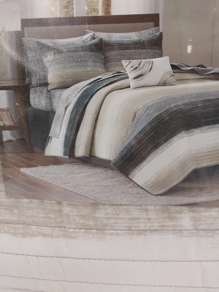 Transitional bedding ensembles featuring water color print Quilt and cotton sheet set Set includes Quilt quilt, 2 shams (1 in Twin), cotton flat and fitted sheets, 2 pillowcases (1 in Twin) Twin fitted sheet fits up to 12 inches pocket depth, other size fitted sheet fits up to 14 inches pocket depth Embroidered oblong decorative pillow included Hypoallergenic polyester filling in the Quilt quilt and decorative pillow Features an anti-microbial treatment that helps reduce the growth of odor # Pieces In Set: 6 Included: 1 Quilt(s) Features: Reversible, Embroidered Bed Size: Twin Fiber Content: Cotton, Polyester Fabric Description: Microfiber Filling Content: Polyfill Decor Styles: Contemporary, Modern Certifications And Listings: Made In Green by Oeko-Tex Bedding Sets Type: Quilt Sets