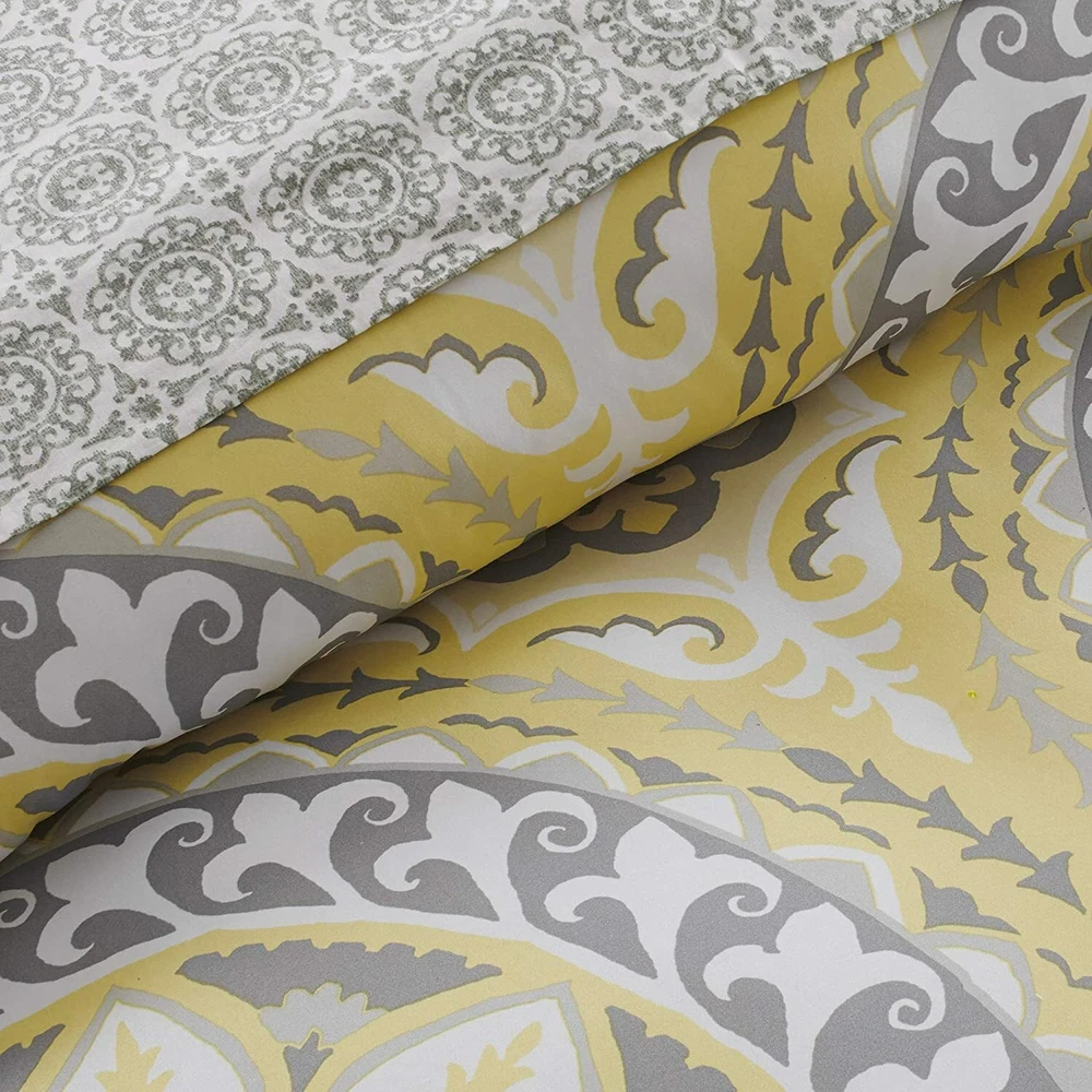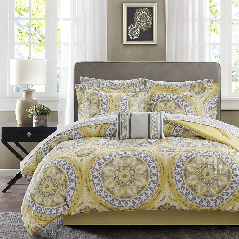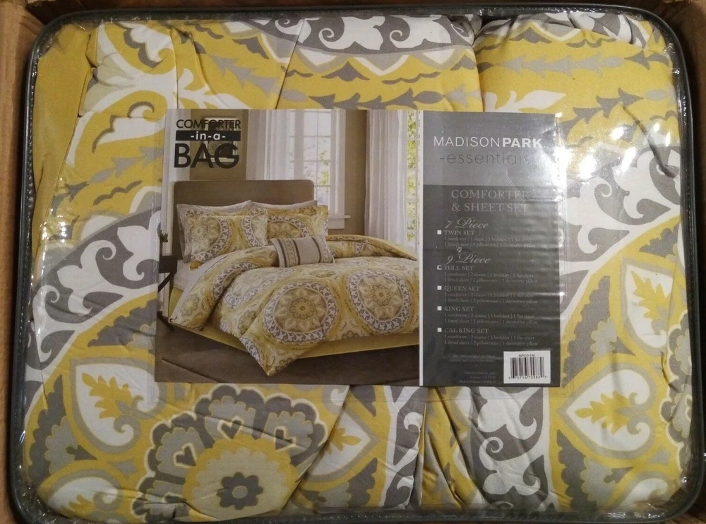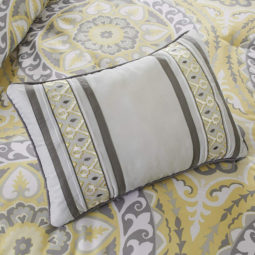 Madison Park Essentials Cozy Bag Comforter, Medallion Damask Design All Season Down Alternative Complete Sheet Set, Bed Skirt, Full(78"x86"), Serenity Yellow, 9 Piece Madison Park Essentials Serenity Complete Bed In a Bag can provide a whole new look with warm colors. An intricate medallion pattern of damask design complemented with subtle color contrast for calming ambiance Microfiber fabric is a really soft fabric that is naturally wrinkle and shrinkage resistant. Set includes: 1 Comforter: 78"W x 86"L, 2 Standard Shams: 20"W x 26"L + 2"D, 1 Bed Skirt: 54"W x 75"L + 15"D, 1 Flat Sheet: 81"W x 96"L, 1 Fitted Sheet: 54"W x 75"L + 14"D, 2 Standard Pillowcases: 20"W x 30"L + 2"D, 1 Decorative Pillow: 12"W x 18"L Care instructions: machine wash cold, gentle cycle, and separately. Do not bleach. Tumble dry low, remove promptly, do not iron. If there is no free movement in the washer or dryer, use large capacity commercial washer/dryer. The Madison Park Essentials Serenity Complete Comforter and Cotton Sheet Set provides a fresh globally inspired look for your bedroom. An intricate medallion pattern repeats across the top of bed in brilliant shades of complementary colors to play up the oversized print. An oblong pillow uses decorative embroidery and piecing to create texture on the top of bed. Also included is a complete cotton sheet set that features a coordinating medallion print to complete the look. This bedding set is also OEKO-TEX certified, meaning it does not contain any harmful substances