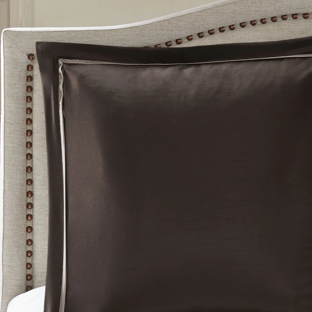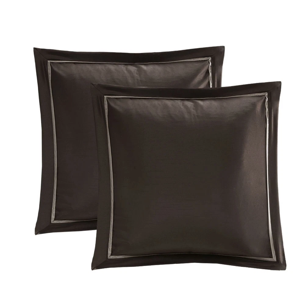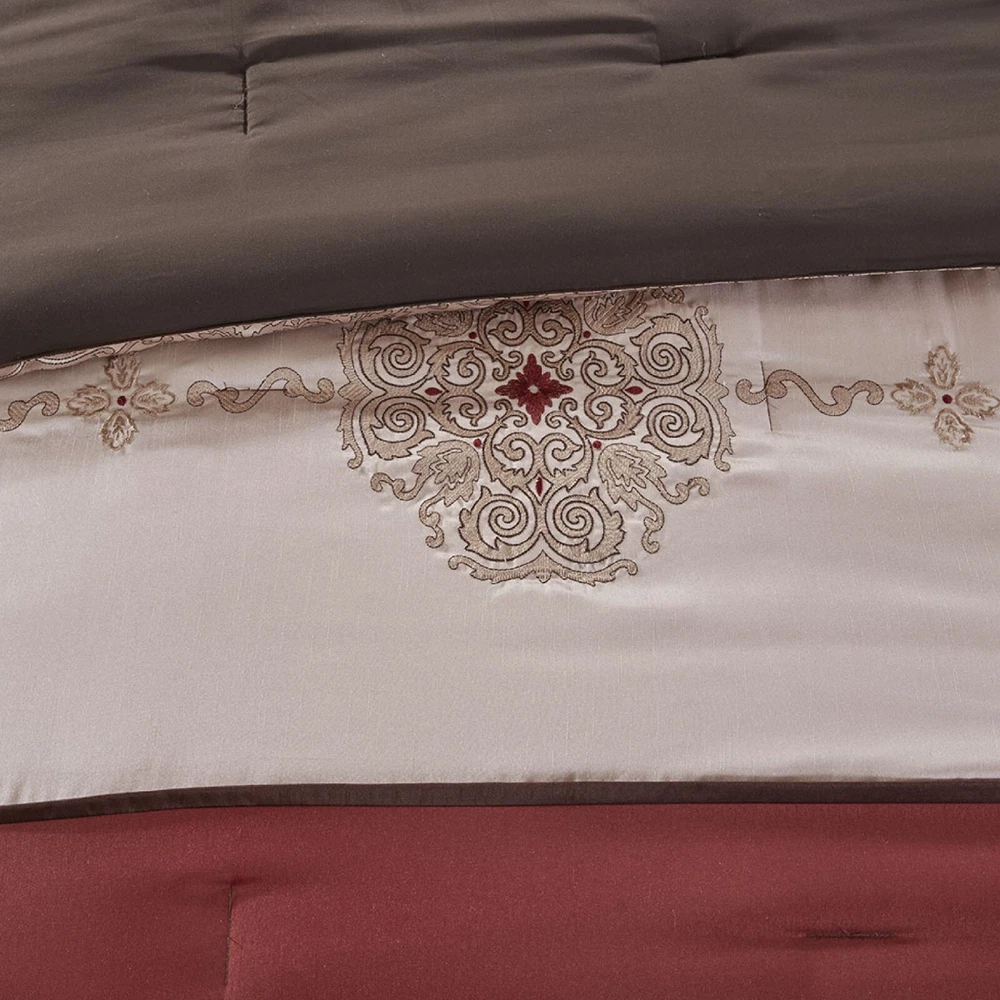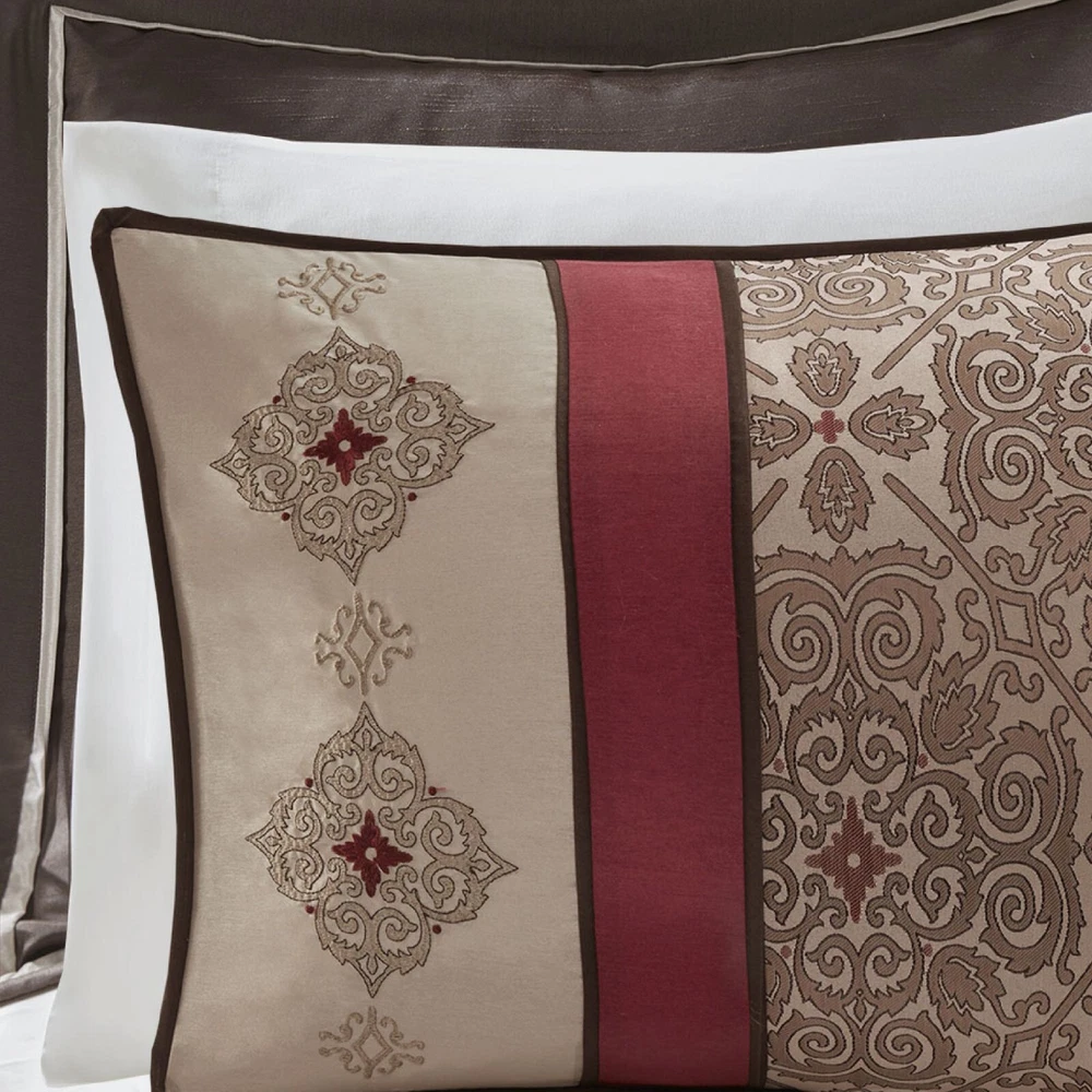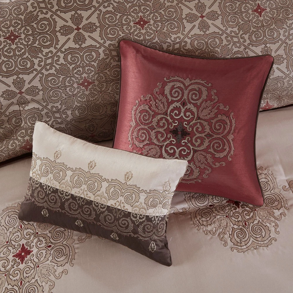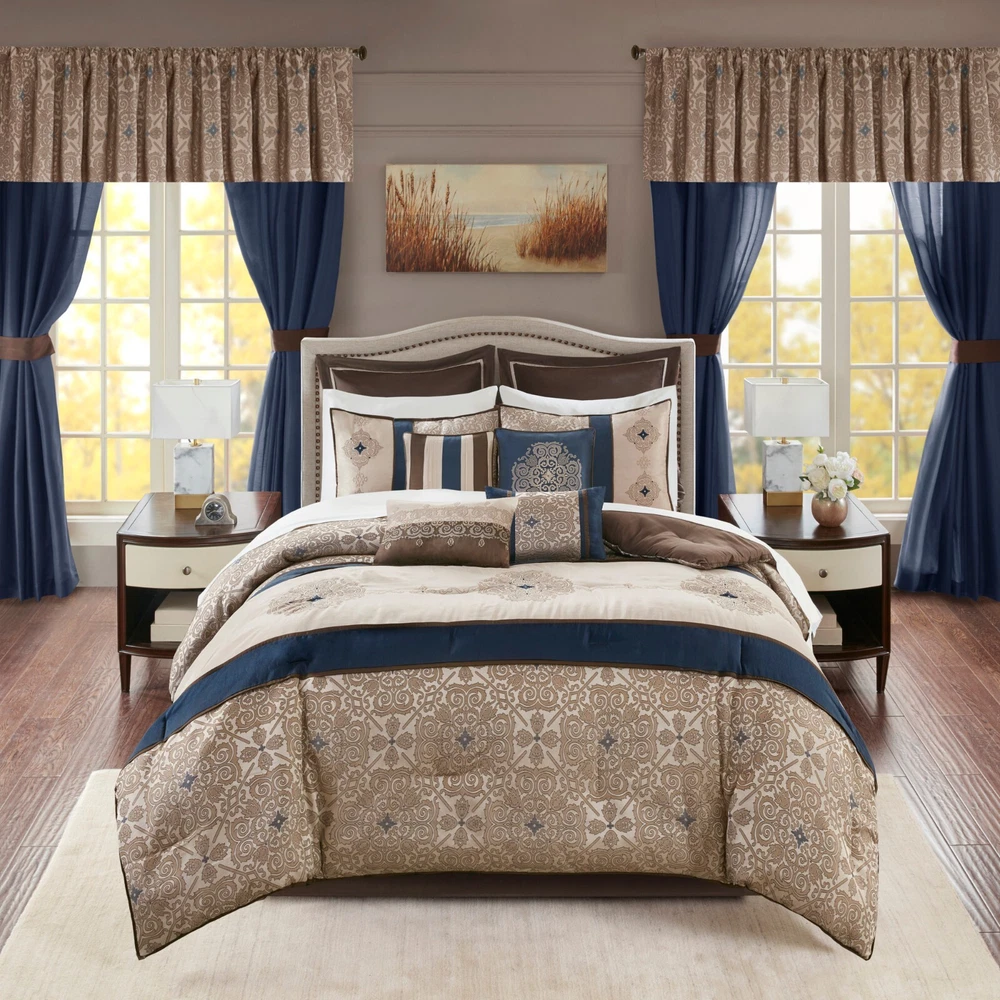 Store Categories Store Categories Bedding Comforters Decorative Pillows Duvet Covers Quilts & Coverlets Sheets Blankets & Throws Mattress Pads Pillows Home Decor Window Treatments Wall Art Home Accents Furniture Beds Dining Seating Ottomans & Benches Accent Chairs Accent Tables Dining Tables Sofas Bath Bath Robes Shower Curtains Towels Bath Rugs Bath Accessories Apparel Pajama Sets Nightgowns Rugs Rugs & Carpets Lighting Lamp Pendant Other Product Overview Details DESCRIPTION The Madison Park Essentials Delaney 24 Piece Room in a Bag offers a refined traditional update to your bedroom decor. The jacquard details flaunted on the pieced faux silk comforter, shams, and window valances deliver an elegant statement, in rich navy and natural hues. Large medallion embroidery is displayed off-center on the luxurious comforter, adding charm and dimension to the bedding set, while matching shams echo the motif seen on top of the bed to create an elegant look in your space. An included microfiber sheet set and bed skirt complements the bedding collection and offers exceptional comfort and style. Two Euro shams and four decorative pillows help to complete the bedding set, giving it a finished look. Accompanying this bedroom set are four window panels with four tie backs to keep curtains drawn open, while two jacquard valances provide the finishing touches to your bedroom. This bedding set may come in rolled or compressed packing and will need to be fluffed up. Use a steam iron to help remove wrinkles easier. FEATURES • Elegant 24 piece room in a bag features pieced medallion bedding and matching ensembles for the entire bedroom • Set includes comforter, bedskirt, 2 shams, 2 square and 2 oblong decorative pillows, 2 euro shams, 4 piece sheet set, 4 window curtains, 4 tiebacks, 2 valances • Hypoallergenic polyester filling in the comforter and pillow (filling contains no allergens and is treated to be dustproof) • Decorative pillows have embroidery and pleating details • Solid coordinating Euro shams 26x26 with 2 inches flange • Each curtain panel is 42x84 inches with coordinating tieback and valance •15" drop bedskirt • Fitted sheet fits up to 14 inches mattress depth (with additional 2 inch of stretch) • Machine washable for easy care; Spot Clean decorative pillow •Items in this set may come in rolled or compressed packaging and will need to be fluffed up MATERIAL Poly Jacquard pieced with emb comforter and shams, 8oz/sq yard polyester filling; polyoni bedskirt, pillows and euro shams, soft brushed microfiber sheets , Jacquard valance and polyoni panels Available Sizes: Queen Comforter Set includes: 1 Queen Comforter 90"W x 90"L 2 Standard Shams 20"W x 26"L 1 Bedskirt 60"W x 80"L + 15"D 2 Euro Shams 26"W x 26"L + 2"D 1 Flat Sheet 90"W x 102"L 2 Standard Pillowcases 20"W x 30"L 1 Fitted Sheet 60"W x 80"L + 14"D 4 Window Panels 42"W x 84"L 4 Tie Backs 4"W x 23"L 2 Valances 18"W x 54"L 1 Decorative Pillow 16"W x 16"L 1 Decorative Pillow 12"W x 18"L 1 Decorative Pillow 18"W x 18"L 1 Decorative Pillow 12"W x 16"L King Comforter Set includes: 1 King Comforter 104"W x 92"L 2 King Shams 20"W x 36"L 1 Bedskirt 78"W x 80"L + 15"D 2 Euro Shams 26"W x 26"L + 2"D 1 Flat Sheet 108"W x 102"L 2 King Pillowcases 20"W x 40"L 1 Fitted Sheet 78"W x 80"L + 14"D 4 Window Panels 42"W x 84"L 4 Tie Backs 4"W x 23"L 2 Valances 18"W x 54"L 1 Decorative Pillow 16"W x 16"L 1 Decorative Pillow 12"W x 18"L 1 Decorative Pillow 18"W x 18"L 1 Decorative Pillow 12"W x 16"L California King Comforter Set includes: 1 Cal King Comforter 104"W x 92"L 2 King Shams 20"W x 36"L 1 Bedskirt 72"W x 84"L + 15"D 2 Euro Shams 26"W x 26"L + 2"D 1 Flat Sheet 108"W x 102"L 2 King Pillowcases 20"W x 40"L 1 Fitted Sheet 72"W x 84"L + 14"D 4 Window Panels 42"W x 84"L 4 Tie Backs 4"W x 23"L 2 Valances 18"W x 54"L 1 Decorative Pillow 16"W x 16"L 1 Decorative Pillow 12"W x 18"L 1 Decorative Pillow 18"W x 18"L 1 Decorative Pillow 12"W x 16"L Bedding Comforters Decorative Pillows Duvet Covers Quilts & Coverlets Sheets Blankets & Throws Mattress Pads Pillows Home Decor Window Treatments Wall Art Home Accents Furniture Beds Dining Seating Ottomans & Benches Accent Chairs Accent Tables Dining Tables Sofas Bath Bath Robes Shower Curtains Towels Bath Rugs Bath Accessories Rugs Rugs & Carpets Lighting Lamp Pendant Product Overview Product Details DESCRIPTION The Madison Park Essentials Delaney 24 Piece Room in a Bag offers a refined traditional update to your bedroom decor. The jacquard details flaunted on the pieced faux silk comforter, shams, and window valances deliver an elegant statement, in rich navy and natural hues. Large medallion embroidery is displayed off-center on the luxurious comforter, adding charm and dimension to the bedding set, while matching shams echo the motif seen on top of the bed to create an elegant look in your space. An included microfiber sheet set and bed skirt complements the bedding collection and offers exceptional comfort and style. Two Euro shams and four decorative pillows help to complete the bedding set, giving it a finished look. Accompanying this bedroom set are four window panels with four tie backs to keep curtains drawn open, while two jacquard valances provide the finishing touches to your bedroom. This bedding set may come in rolled or compressed packing and will need to be fluffed up. Use a steam iron to help remove wrinkles easier. FEATURES • Elegant 24 piece room in a bag features pieced medallion bedding and matching ensembles for the entire bedroom • Set includes comforter, bedskirt, 2 shams, 2 square and 2 oblong decorative pillows, 2 euro shams, 4 piece sheet set, 4 window curtains, 4 tiebacks, 2 valances • Hypoallergenic polyester filling in the comforter and pillow (filling contains no allergens and is treated to be dustproof) • Decorative pillows have embroidery and pleating details • Solid coordinating Euro shams 26x26 with 2 inches flange • Each curtain panel is 42x84 inches 