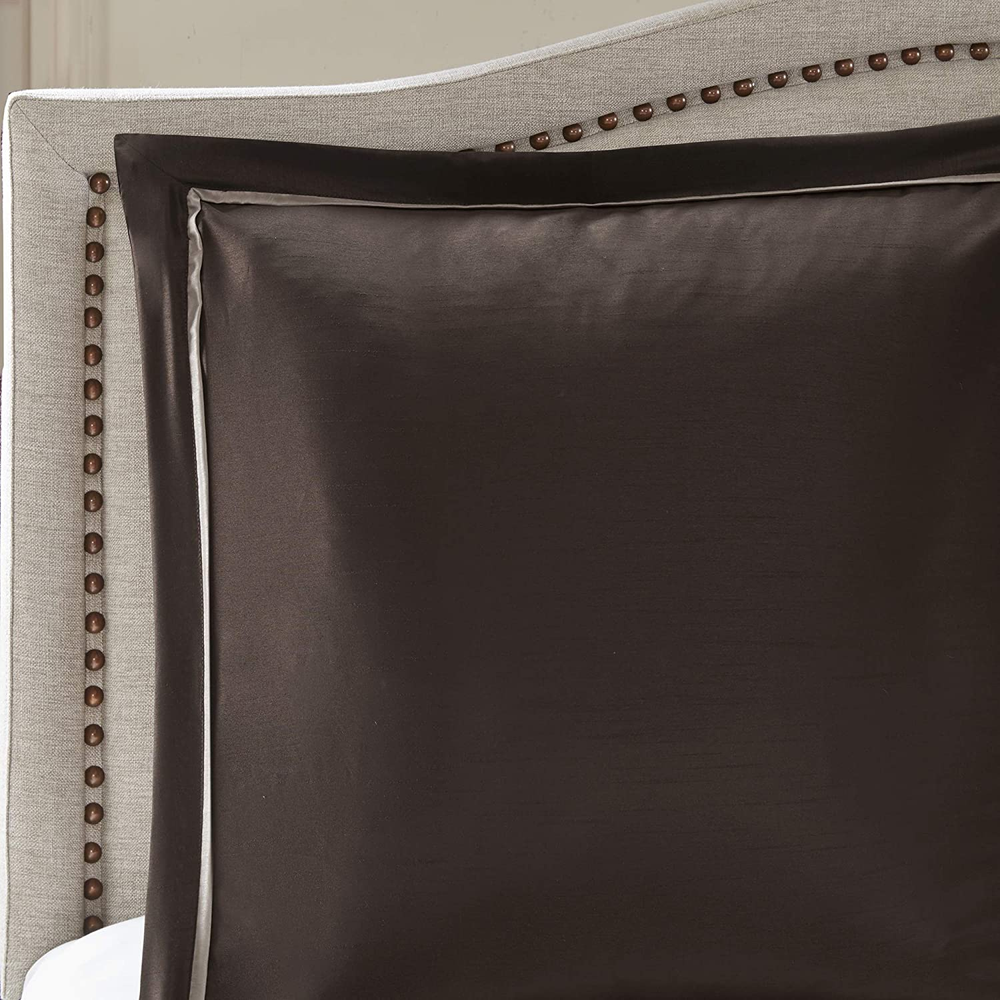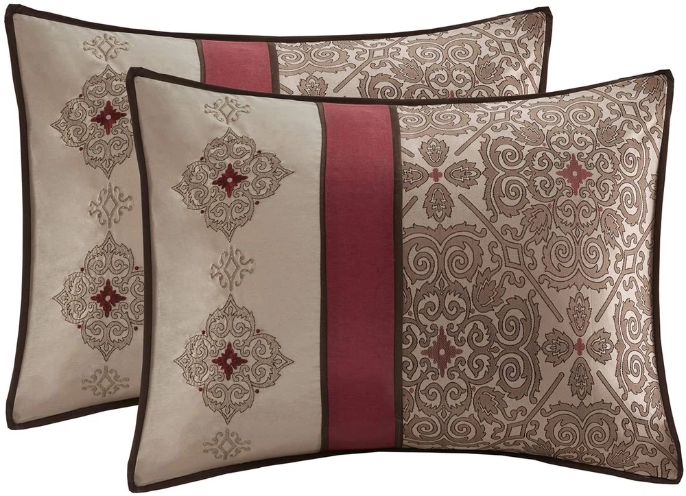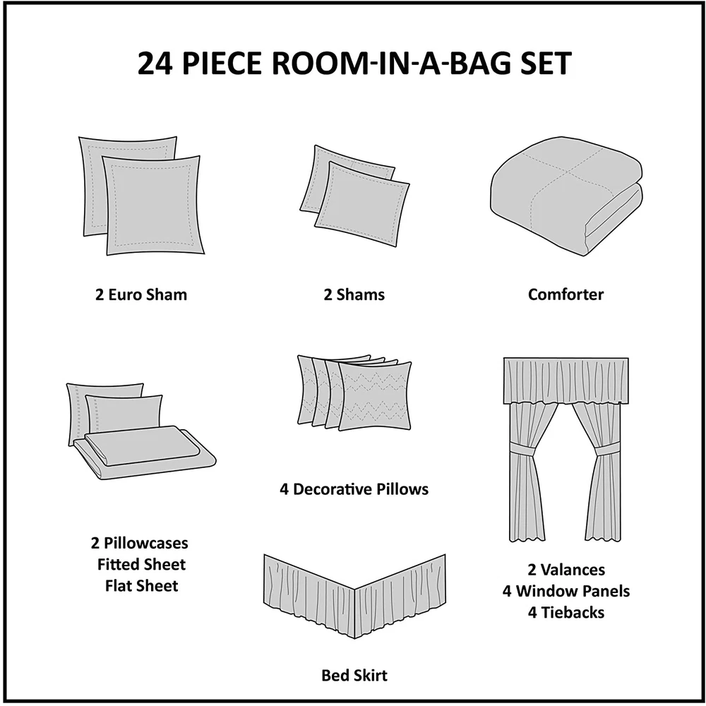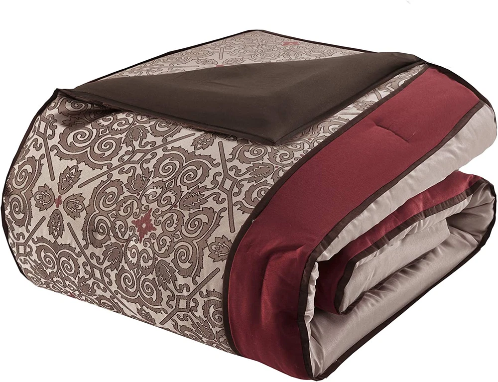 Faux Silk Jacquard Embroidered Pieced Microfiber sheet set Embroidered pillows 15" drop bedskirt Fitted sheet fits up to 16" mattress Set includes: comforter, 2 shams, bedskirt, 2 euro shams, 4 decorative pillows, flat sheet, fitted sheet, 2 pillowcases, 4 window panels, 2 valances, 4 tie backs Jacquard, pieced faux silk, embroidered, 8 oz/sq yard polyester filling, microfiber sheet set 1 Comforter:90"W x 90"L 2 Standard Shams:20"W x 26"L (2) 1 Bedskirt:60"W x 80"L plus 15"D 2 Euro Shams:26"W x 26"L plus 2"D (2) 4 Decorative Pillows:18"W x 18"L/16"W x 16"L/12"W x 18"L/12"W x 16"L 1 Flat Sheet:90"W x 102"L 2 Standard Pillowcases:20"W x 30"L (2) 1 Fitted Sheet:60"W x 80"L plus 14"D 4 Window Panels:42"W x 84"L (4) 4 Tie Backs:4"W x 23"L (4) 2 Valances:18"W x 54"L (2) Machine washable, spot clean pillows The Madison Park Essentials Delaney 24 Piece Room in a Bag offers a refined traditional update to your bedroom decor. The jacquard details flaunted on the pieced faux silk comforter, shams, and window valances deliver an elegant statement, in rich red and natural hues. Large medallion embroidery is displayed off-center on the luxurious comforter, adding charm and dimension to the bedding set, while matching shams echo the motif seen on top of the bed to create an elegant look in your space. An included microfiber sheet set and bed skirt complements the bedding collection and offers exceptional comfort and style. Two Euro shams and four decorative pillows help to complete the bedding set, giving it a finished look. Accompanying this bedroom set are four window panels with four tie backs to keep curtains drawn open, while two jacquard valances provide the finishing touches to your bedroom. This bedding set may come in rolled or compressed packing and will need to be fluffed up. Use a steam iron to help remove wrinkles easier.