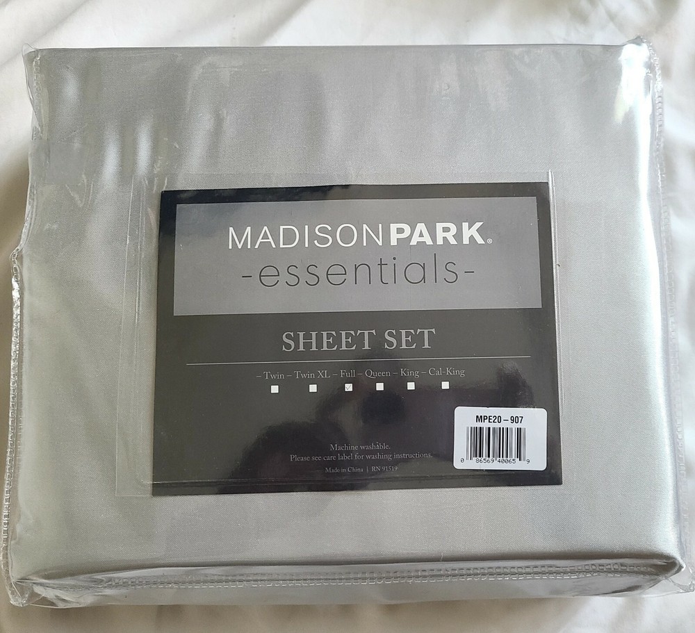 The Madison Park Essentials Full Size 6 Piece Gray Satin Sheet Set is a stylish and modern addition to any bedroom. Made from luxurious satin material, these sheets are not only comfortable but also wrinkle-free and easy to care for with machine washable instructions. The solid gray color adds a touch of elegance, while the full size and 102-inch length ensure a perfect fit for a standard full-size bed. The brand's reputation for quality and the set's features make it a great choice for both teens and adults looking to upgrade their bedding. Madison Park essentials 6 piece Gray Satin Sheet Set. Wrinkle free, 4 pillowcases, 1 flat sheet, 1 fitted sheet. Opened pack; Never used. Flat Sheet 96" x 81". Fitted Sheet 75" x 54", 14" deep. Pillowcase 30" x 20". Measurements are approximate.