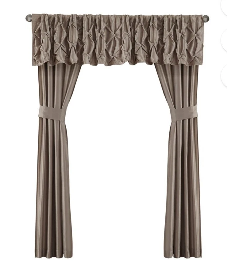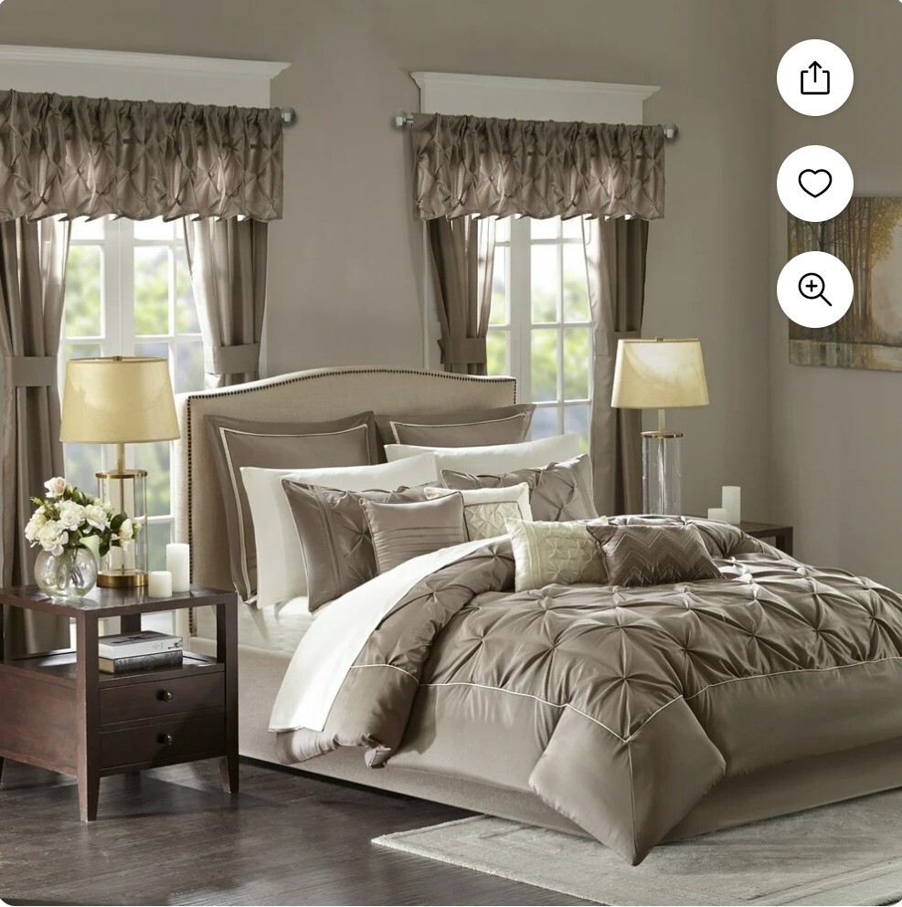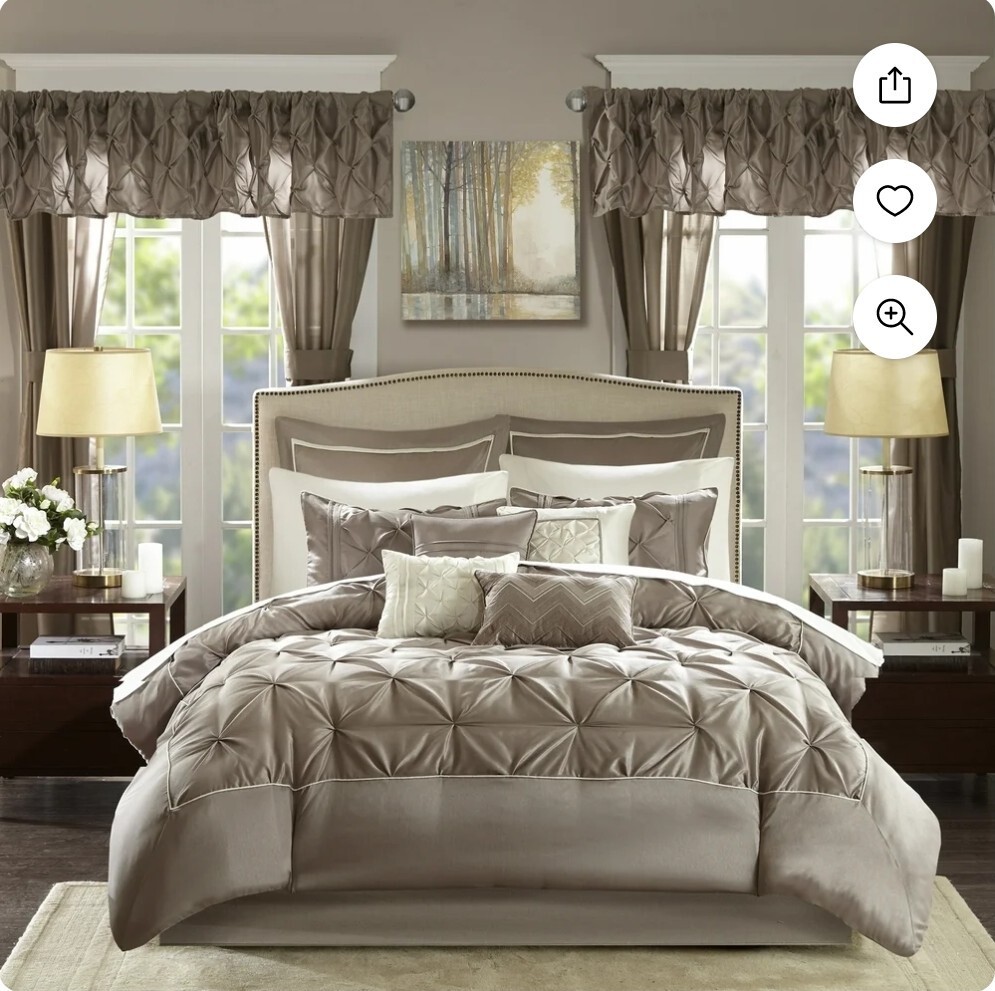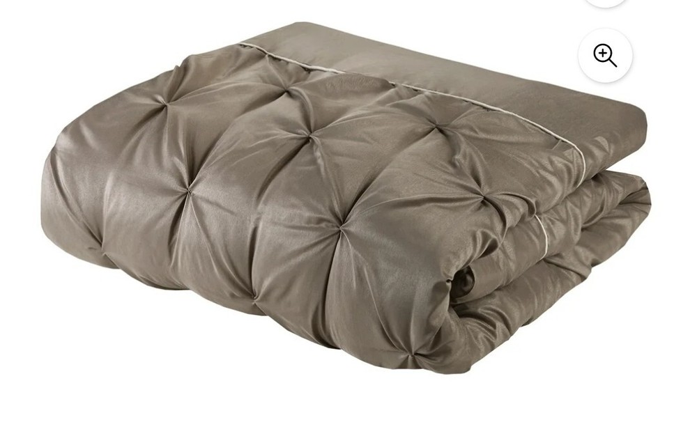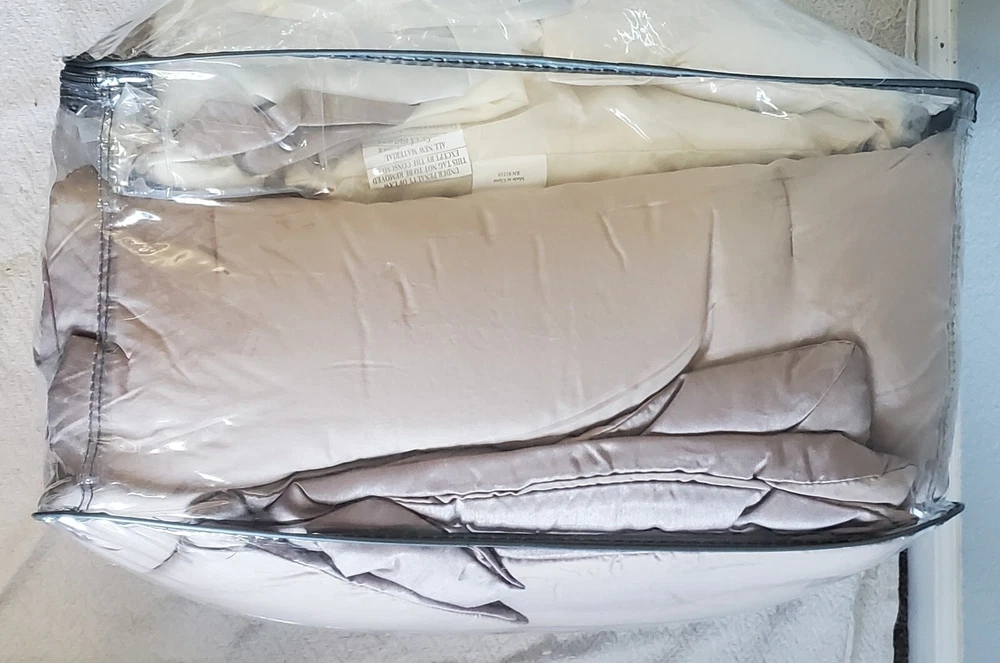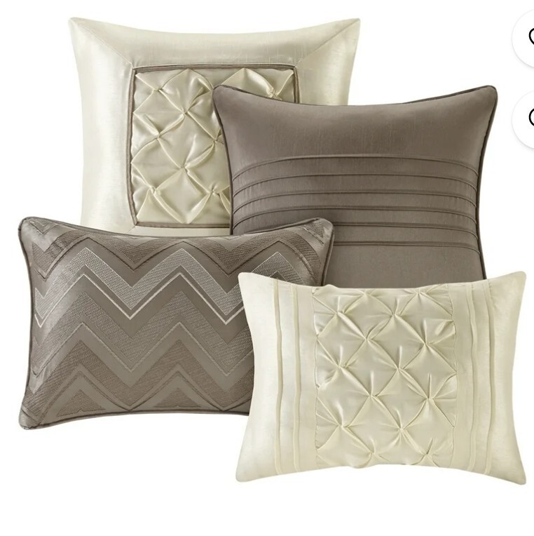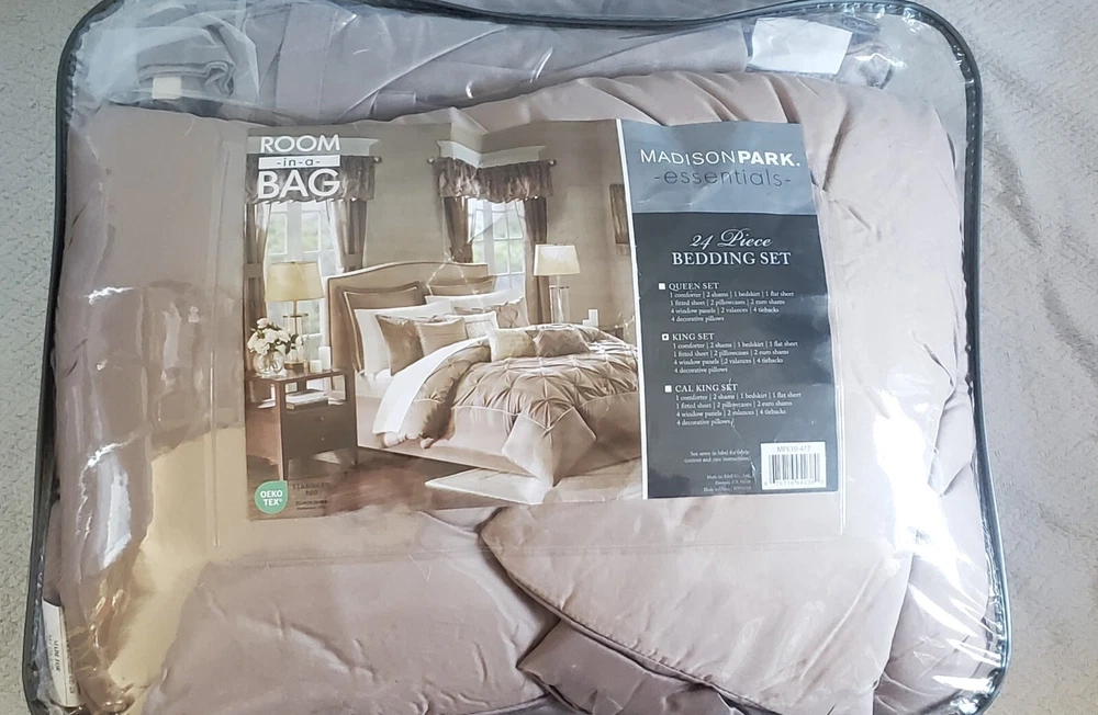 The Madison Park Essentials Joella 24 Piece Room In A Bag is a luxurious and complete bedding set in a beautiful beige color. This King-sized comforter set includes curtains, pillow shams, decorative pillows, fitted sheet, bed skirt, and flat sheet, all made of polyester material. The set is ideal for adults and perfect for winter season use in a bedroom. With its solid pattern and elegant design, this Madison Park set offers a convenient and stylish solution for dressing up a bedroom with a coordinated look. Bag coming apart, see pictures. New, taken out of bag and put back in