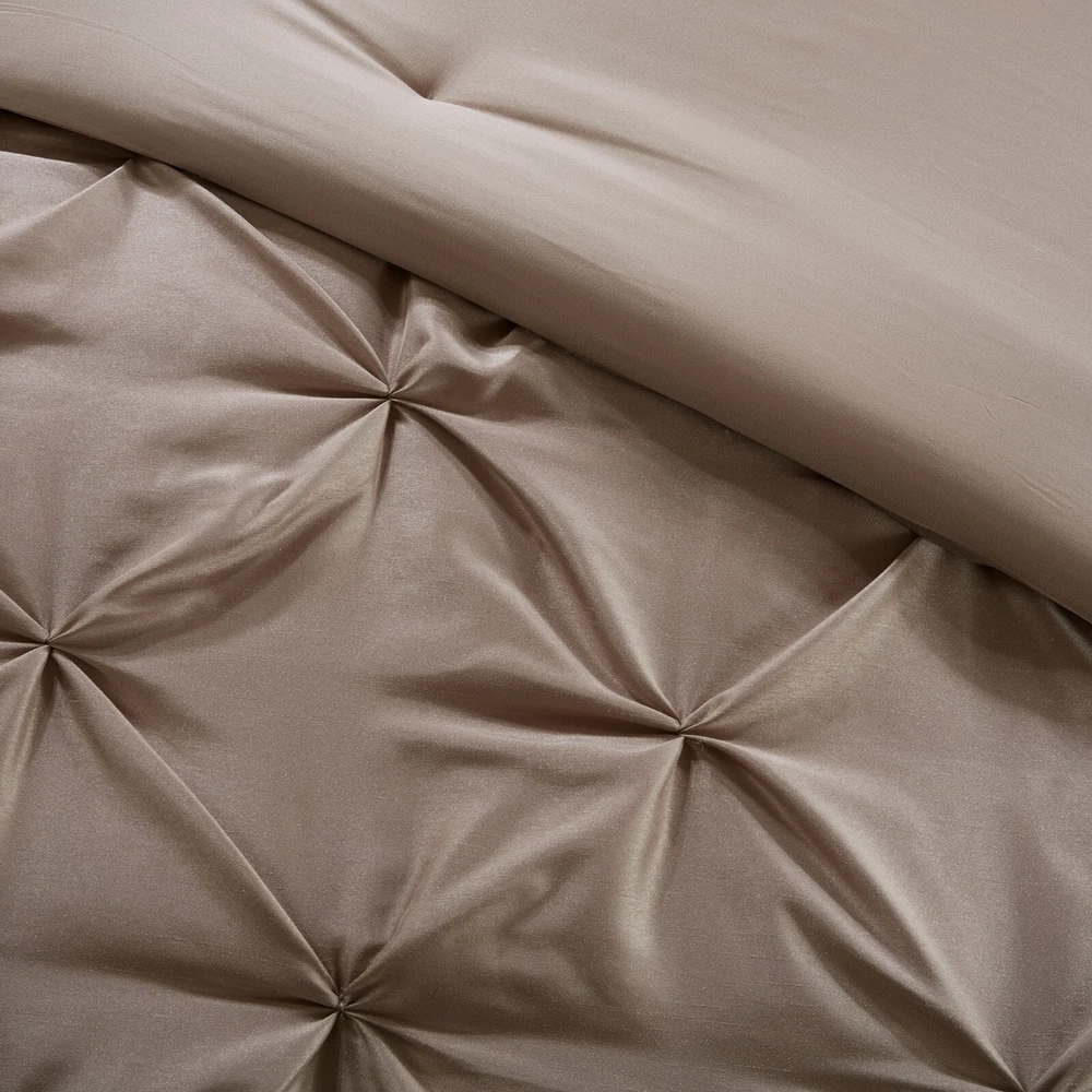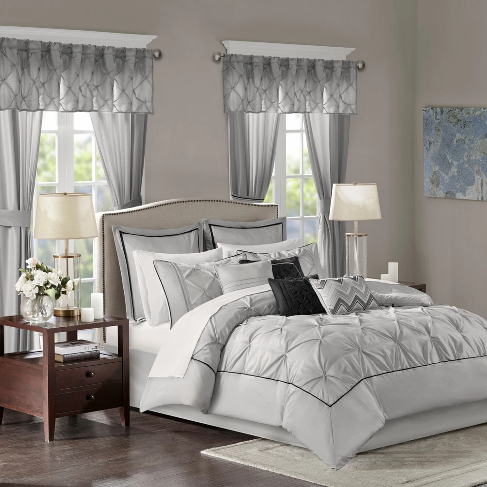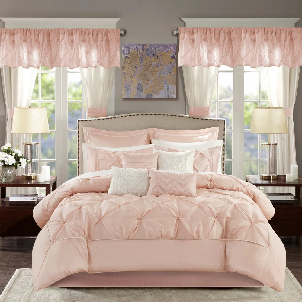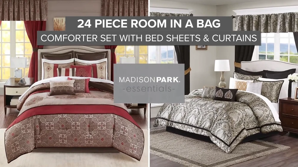Store Categories Store Categories Bedding Comforters Decorative Pillows Duvet Covers Quilts & Coverlets Sheets Blankets & Throws Mattress Pads Pillows Home Decor Window Treatments Wall Art Home Accents Furniture Beds Dining Seating Ottomans & Benches Accent Chairs Accent Tables Dining Tables Sofas Bath Bath Robes Shower Curtains Towels Bath Rugs Bath Accessories Apparel Pajama Sets Nightgowns Rugs Rugs & Carpets Lighting Lamp Pendant Other Product Overview Details DESCRIPTION Invigorate your space with the Madison Park Essentials Joella 24 Piece Room in a Bag. The lavish tufted details flaunted on the comforter, shams, and window valances deliver an elegant statement in bold, natural hues. A large border frames the luxurious comforter, adding charm and dimension to the bedding set. Matching shams echo the motif seen on top of the bed, creating an elegant look in your space. An included microfiber sheet set and bed skirt complements the bedding collection and offers exceptional comfort and style. Two Euro shams and four embroidered decorative pillows help to complete the bedding set, giving it a finished look. Accompanying this bedroom set are four window panels with four tie backs to keep curtains drawn open, while two tufted valances provide the finishing touches to your bedroom. This bedding set may come in rolled or compressed packing and will need to be fluffed up. Use a steam iron to help remove wrinkles easier. FEATURES • Transitional 24 piece room in a bag features faux silk polyoni tufted with border frame • Set includes comforter, bedskirt, 2 shams, 2 square and 2 oblong decorative pillows, 2 euro shams, 4 piece sheet set, 4 window curtains, 4 tiebacks, 2 valances • Hypoallergenic polyester filling in the comforter and pillow (filling contains no allergens and is treated to be dustproof) • Each curtain panel is 42x84 inches with coordinating tieback and valance • 15" drop bedskirt • Fitted sheet fits up to 14 inches mattress depth (with additional 2 inch of stretch) • Decorative pillows have embroidery and pleating details • Solid coordinating Euro shams 26x26 with 2 inches flange • Machine washable for easy care; Spot Clean decorative pillow •Items in this set may come in rolled or compressed packaging and will need to be fluffed up MATERIAL Polyoni Comforter and Shams, 100% Polyester Filling; Polyoni Bedskirt, Pillows, and Euro Shams, Soft Brushed Microfiber Sheets, Polyoni Window Set Available Sizes: Queen Comforter Set includes: 1 Comforter: 90"W x 90"L 2 Standard Shams: 20"W x 26"L 1 Bedskirt: 60"W x 80"L + 15"D 2 Euro Shams: 26"W x 26"L + 2"D 1 Flat Sheet: 90"W x 102"L 2 Standard Pillowcases: 20"W x 30"L 1 Fitted Sheet: 60"W x 80"L + 14"D 4 Window Panels: 42"W x 84"L 4 Tie Backs: 4"W x 23"L 2 Valances: 54"W x 18"L 1 Decorative Pillow: 16"W x 16"L 1 Decorative Pillow: 12"W x 18"L 1 Decorative Pillow: 18"W x 18"L 1 Decorative Pillow: 12"W x 16"L King Comforter Set includes: 1 Comforter: 104"W x 92"L 2 King Shams: 20"W x 36"L 1 Bedskirt: 78"W x 80"L + 15"D 2 Euro Shams: 26"W x 26"L + 2"D 1 Flat Sheet: 108"W x 102"L 2 King Pillowcases: 20"W x 40"L 1 Fitted Sheet: 78"W x 80"L + 14"D 4 Window Panels: 42"W x 84"L 4 Tie Backs: 4"W x 23"L 2 Valances: 54"W x 18"L 1 Decorative Pillow: 16"W x 16"L 1 Decorative Pillow: 12"W x 18"L 1 Decorative Pillow: 18"W x 18"L 1 Decorative Pillow: 12"W x 16"L California King Comforter Set includes: 1 Comforter: 104"W x 92"L 2 King Shams: 20"W x 36"L 1 Bedskirt: 72"W x 84"L + 15"D 2 Euro Shams: 26"W x 26"L + 2"D 1 Flat Sheet: 108"W x 102"L 2 King Pillowcases: 20"W x 40"L 1 Fitted Sheet: 72"W x 84"L + 14"D 4 Window Panels: 42"W x 84"L 4 Tie Backs: 4"W x 23"L 2 Valances: 54"W x 18"L 1 Decorative Pillow: 16"W x 16"L 1 Decorative Pillow: 12"W x 18"L 1 Decorative Pillow: 18"W x 18"L 1 Decorative Pillow: 12"W x 16"L Bedding Comforters Decorative Pillows Duvet Covers Quilts & Coverlets Sheets Blankets & Throws Mattress Pads Pillows Home Decor Window Treatments Wall Art Home Accents Furniture Beds Dining Seating Ottomans & Benches Accent Chairs Accent Tables Dining Tables Sofas Bath Bath Robes Shower Curtains Towels Bath Rugs Bath Accessories Rugs Rugs & Carpets Lighting Lamp Pendant Product Overview Product Details DESCRIPTION Invigorate your space with the Madison Park Essentials Joella 24 Piece Room in a Bag. The lavish tufted details flaunted on the comforter, shams, and window valances deliver an elegant statement in bold, natural hues. A large border frames the luxurious comforter, adding charm and dimension to the bedding set. Matching shams echo the motif seen on top of the bed, creating an elegant look in your space. An included microfiber sheet set and bed skirt complements the bedding collection and offers exceptional comfort and style. Two Euro shams and four embroidered decorative pillows help to complete the bedding set, giving it a finished look. Accompanying this bedroom set are four window panels with four tie backs to keep curtains drawn open, while two tufted valances provide the finishing touches to your bedroom. This bedding set may come in rolled or compressed packing and will need to be fluffed up. Use a steam iron to help remove wrinkles easier. FEATURES • Transitional 24 piece room in a bag features faux silk polyoni tufted with border frame • Set includes comforter, bedskirt, 2 shams, 2 square and 2 oblong decorative pillows, 2 euro shams, 4 piece sheet set, 4 window curtains, 4 tiebacks, 2 valances • Hypoallergenic polyester filling in the comforter and pillow (filling contains no allergens and is treated to be dustproof) • Each curtain panel is 42x84 inches with coordinating tieback and valance • 15" drop bedskirt • Fitted sheet fits up to 14 inches mattress depth (with additional 2 inch of stretch) • Decorative pillows have embroidery and pleating details • Solid coordinating Euro shams 26x26 with 2 inches flange • Machine washable for easy care; Spot Clean decorative pillow •Items in this 