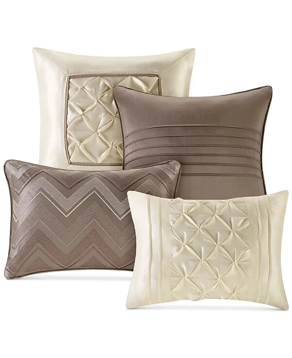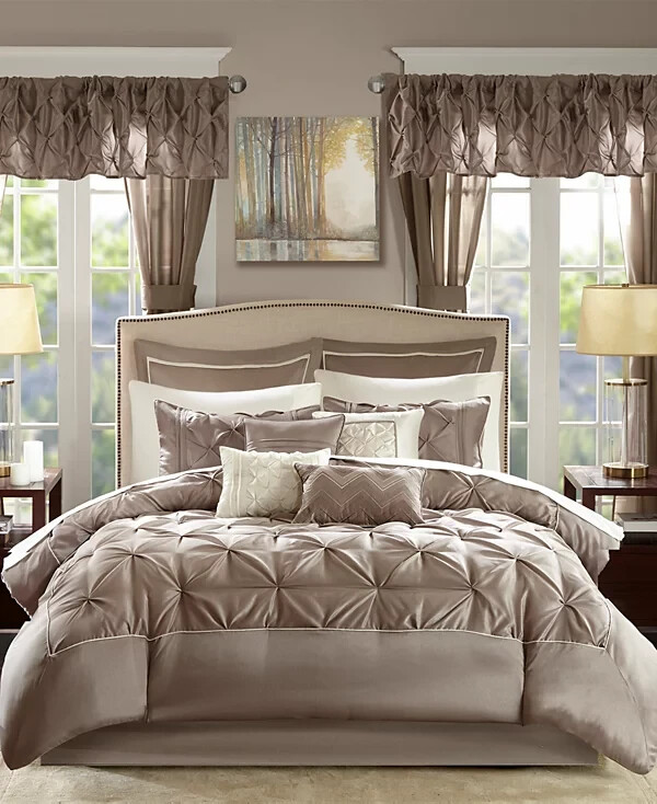 Invigorate your space with the Essentials Joella room in a bag from Madison Park. The lavish tufted details flaunted on the comforter, shams and window valances deliver an elegant statement in bold, natural hues. A large border frames the luxurious comforter, adding charm and dimension to the bedding set. Matching shams echo the motif seen on top of the bed. A sheet set and bedskirt, two European shams and four embroidered decorative pillows, as well as four window panels with four tiebacks and two tufted valances provide the finishing touches to your bedroom. Product Features Set includes: comforter (104" x 92"), two king shams (20" x 36"), bedskirt (78" x 80" x 15"), four decorative pillows (16" x 16", 12" x 18", 18" x 18", 12" x 16"), two European shams (26" x 26"), flat sheet (108" x 102"), fitted sheet (78" x 80" x 14"), two pillowcases (20" x 40"), four window curtains (42" x 84"), two window valances (18" x 54") and four tiebacks (4" x 23") Tufted detail on comforter, shams and window valances Asian American & Pacific Islander Owned, Woman Owned Comforter/sham/bedskirt/European sham/pillow cover/window panels/tiebacks/window valance: polyester; sheet set: polyester 85 grams per square meter; comforter fill: polyester 270 grams per square meter; pillow: polyester fill Machine washable. Spot clean pillows. Imported This item will be shipped in a compression bag with all tags-no original bag will be included