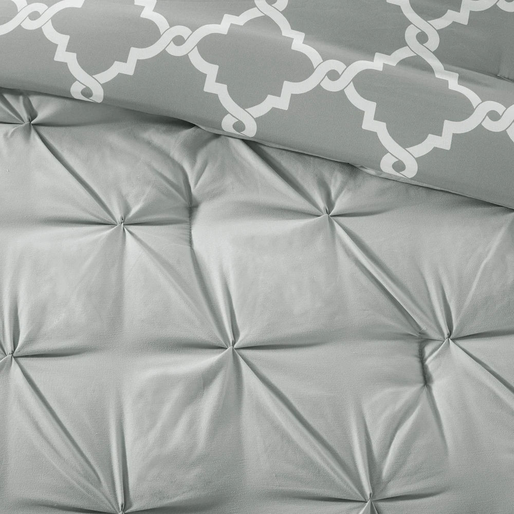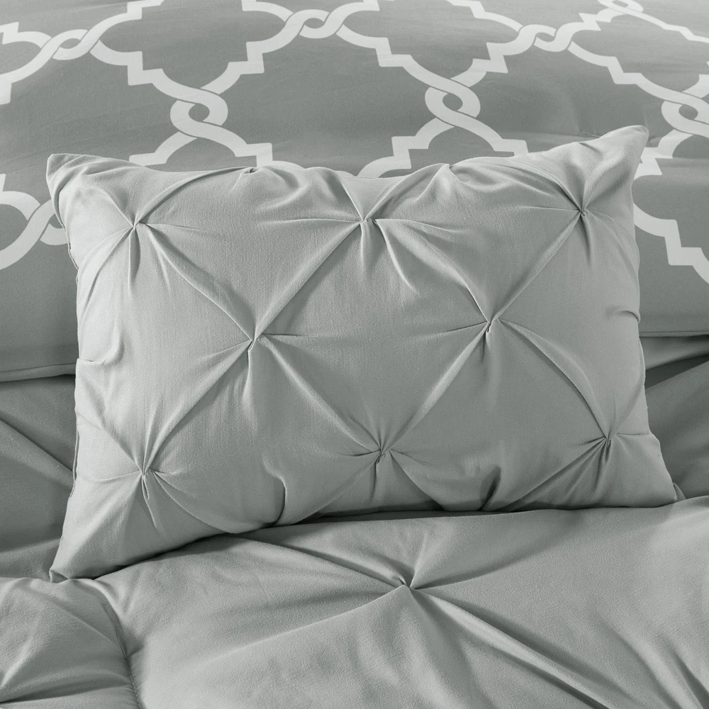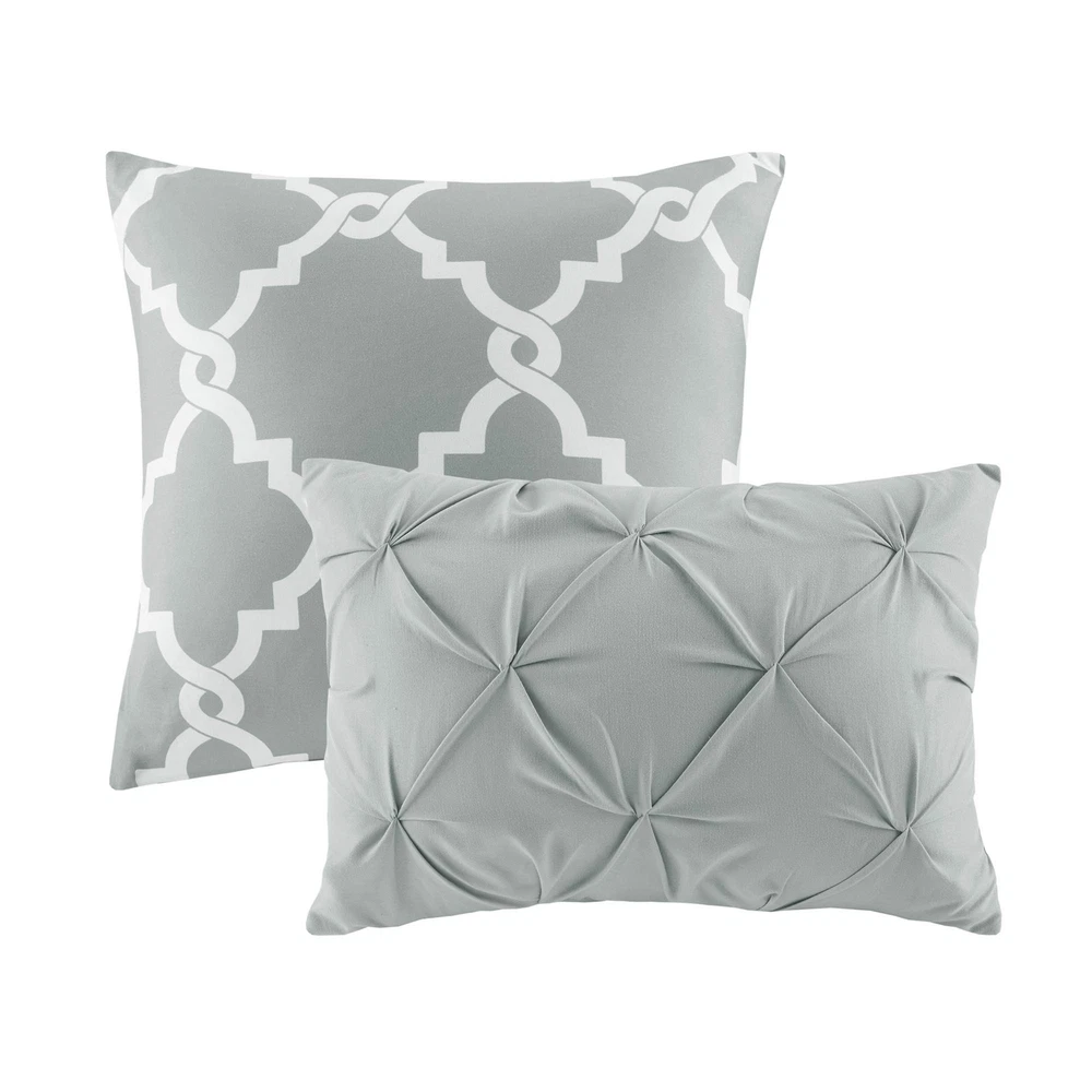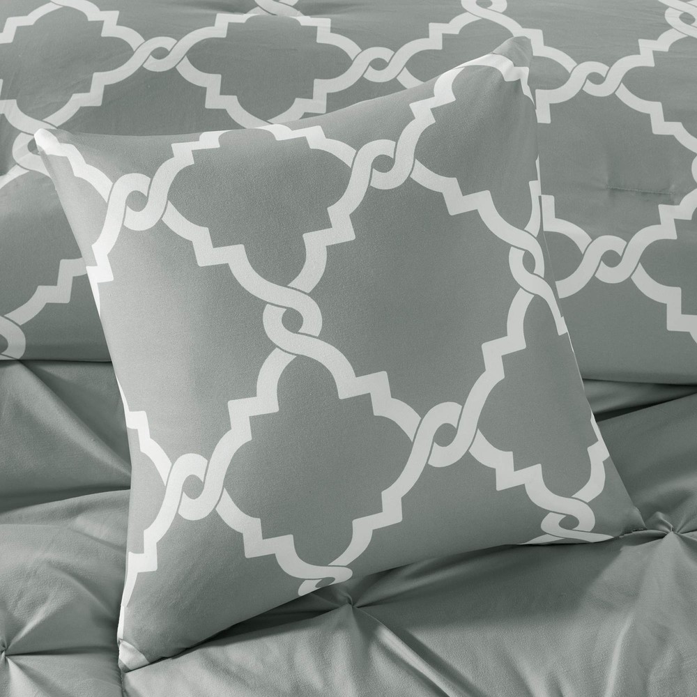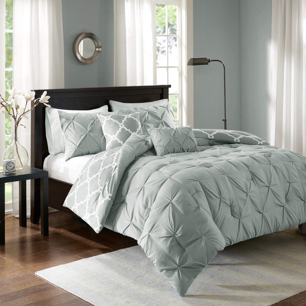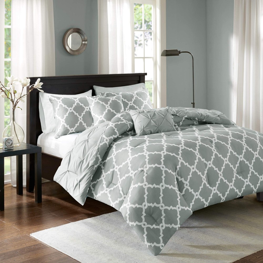 Madison Park Essentials Kasey Cozy Comforter Set - Fretwork Design, All Season Bedding with Matching Shams, Decorative Pillow, Queen (90in x 90 in), Diamond Grey Comforter 5 Piece ✓ Free 60 Day Returns ✓ Free Express Shipping Description: The Madison Park Essentials Kasey 5 Piece Reversible Comforter Set gives you the option to dress up your room depending on your mood! One side features a grey with a cast of green tufted look while the reverse is a grey and white printed fretwork design. Shams are fully reversible as well and two decorative pillows feature solid fabric manipulation and printing to match back to both options. Included in the set is one comforter, two shams, and two decorative pillows. Machine washable, items in the set may come in a rolled or compressed packaging, which will need to be fluffed up or steam ironed before use to remove wrinkles. Features: Reversible Fretwork design Tufted Comforter/Sham: 85gsm microfiber solid tufted and 85gsm microfiber printed back , 250g/m2 polyester filling Pillow: 100% polyester cover, polyester filling 1 Comforter:90x90" 2 Standard Shams:20x26" (2) 2 Decorative Pillows:12x18"/18x18" MACHINE WASH COLD, GENTLE CYCLE, AND SEPARATELY. DO NOT BLEACH. TUMBLE DRY LOW, REMOVE PROMPTLY, DO NOT IRON. IF THERE IS NO FREE MOVEMENT IN THE WASHER OR DRYER, USE LARGE CAPACITY COMMERCIAL WASHER/DRYER. Product Details: Size: Queen (90 in x 90 in) Included Components: COMFORTER (SET) Color: Diamond Grey Comforter 5pcs Style: Casual Brand: Madison Park Size: Queen (90 in x 90 in) Included Components: COMFORTER (SET) Color: Diamond Grey Comforter 5pcs Style: Casual Brand: Madison Park Theme: Love Pattern: Geometric Material: Polyester Fabric Type: 100% Polyester Number of Pieces: 5 Seasons: All Product Care Instructions: Machine Wash Manufacturer: Madison Park Essentials UPC: 675716878191 Global Trade Identification Number: 91 Product Dimensions: 23.62 x 18.5 x 9.84 inches Item Weight: 9.28 pounds Country of Origin: China Item model number: MPE10-348 Is Discontinued By Manufacturer: No Date First Available: October 28, 2016