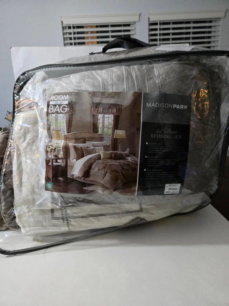 Madison Park Essentials Loretta 24 Piece Taupe King Room in a Bag Invigorate your space with the Madison Park Essentials Loretta 24 Piece Room in a Bag. The lavish tufted details flaunted on the comforter, shams, and window valances deliver an elegant statement in bold, natural hues. A large border frames the luxurious comforter, adding charm and dimension to the bedding set. Matching shams echo the motif seen on top of the bed, creating an elegant look in your space. Brand: Madison Park Size: King Set Includes: 1 Comforter, 1 bed skirt, 2 shams, 2 euro shams, 2 square and 2 oblong decorative pillows, 4-piece sheet set, 4 window curtains, 4 tiebacks, and 2 valances Material: Polyester Color: Taupe Condition: Transitional 24 piece room in a bag features faux silk polyoni tufted with border frame Hypoallergenic polyester filling in the comforter and pillow (filling contains no allergens and is treated to be dustproof) Each curtain panel is 42x84 inches with coordinating tieback and valance 15 inches drop bedskirt Fitted sheet fits up to 14 inches mattress depth (with additional 2 inch of stretch) Decorative pillows have embroidery and pleating details Solid coordinating Euro shams 26x26 with 2 inches flange Machine washable for easy care; Spot Clean decorative pillow Items in this set may come in rolled or compressed packaging and will need to be fluffed up Madison Park Essentials Loretta 20 Piece Taupe King Room in a Bag Click images to enlarge Description Madison Park Essentials Loretta 2 Piece Taupe King Room in a Bag Invigorate your space with the Madison Park Essentials Loretta 24 Piece 0d, natural hues. A large border frames the luxurious comforter, adding charm and dimension to the bedding set. Matching shams echo the motif seen on top of the bed, creating an elegant look in your space. Brand: Madison Park Size: King Set Includes: 1 Comforter, 1 bed skirt, 2 euro, 2 decorative pillows, 4-piece sheet set, 4 window curtains, 4 tiebacks, and 2 valances Material: Polyester Color: Taupe Transitional 20 piece room in a bag features faux silk polyoni tufted with border frame Hypoallergenic polyester filling in the comforter and pillow (filling contains no allergens and is treated to be dustproof) Each curtain panel is 42x84 inches with coordinating tieback and valance 15 inches drop bedskirt Fitted sheet fits up to 14 inches mattress depth (with additional 2 inch of stretch) Decorative pillows have embroidery and pleating details Solid coordinating Euro shams 26x26 with 2 inches flange Machine washable for easy care; Spot Clean decorative pillow Items in this set may come in rolled or compressed packaging and will need to be fluffed up Combined Shipping We charge full shipping & handling on the item with the highest shipping rate. Each additional items shipping & handling rate will be discounted 50% off. Please insert all items in the cart to show all applicable discounts. Items must be paid together to receive full discount Images sell! Get Supersized Images & Free Image Hosting Create your brand with Auctiva's Customizable Templates. Attention Sellers - Get Templates Image Hosting, Scheduling at Auctiva.com.