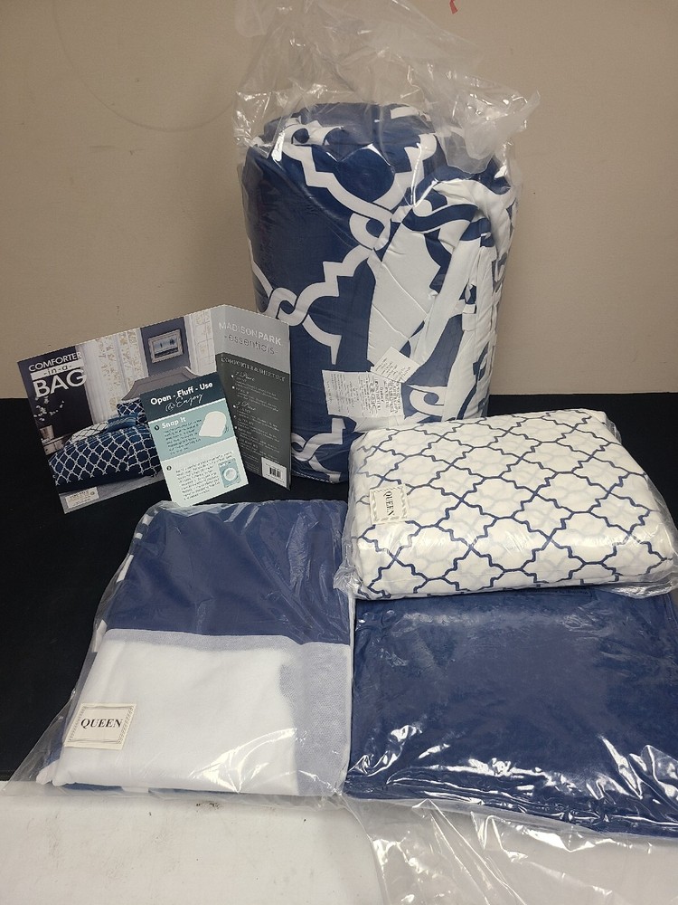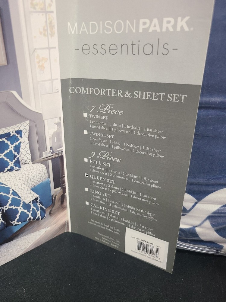 New Open Box Madison Park Essentials MPE10-091 Essentials Merritt Complete Bed and Sheet Set Queen 9 Piece Set Navy Box a little dirty from lost freight Ships in 2 business days Thanks for supporting small usa businesses