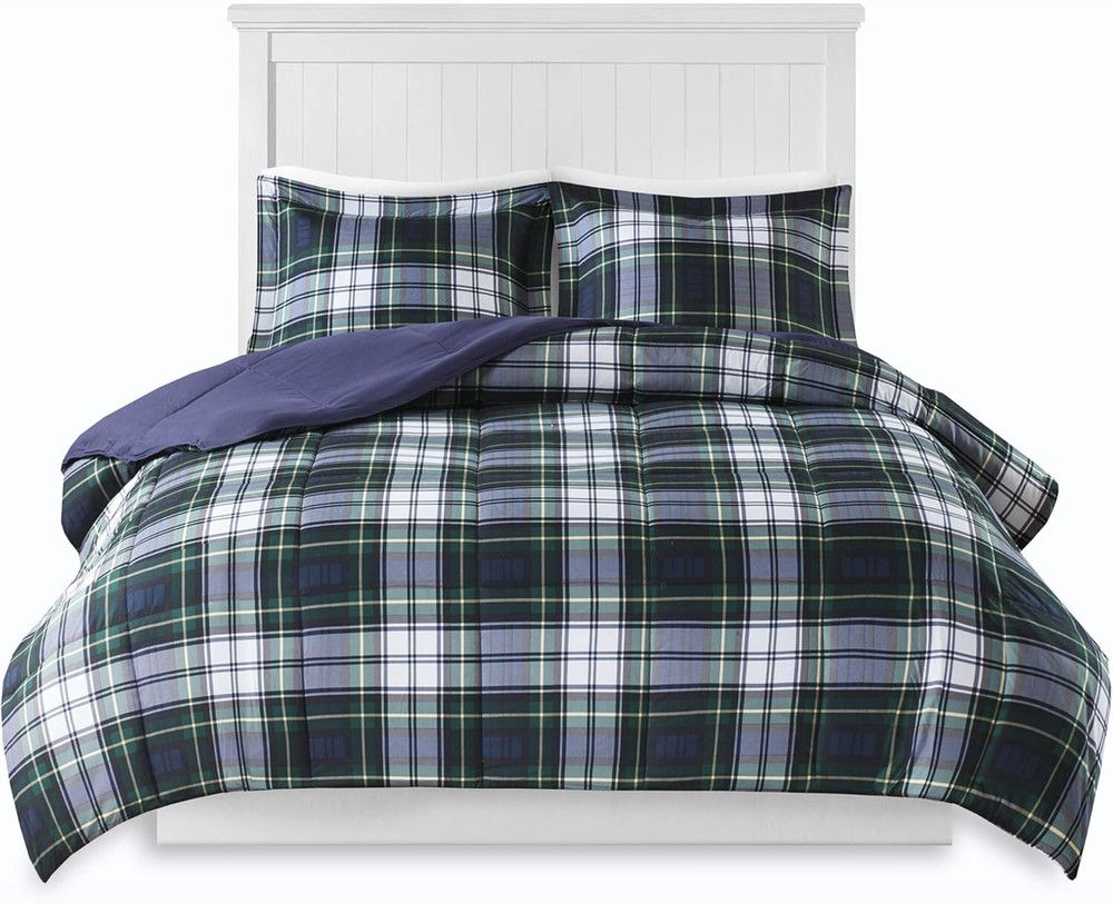 S-194-Top-675716529918 Madison Park Essentials Parkston Plaid Comforter Matching Sham Cozy up in the night with the Madison Park Essentials Parkston Plaid Comforter and matching sham. Designed to bring a touch of classic elegance and warmth to your bedroom, this full/queen-sized comforter features a timeless navy blue plaid pattern that effortlessly complements a variety of decor styles. The package dimensions of 18.5x8.39x8.19 inches ensure a perfect fit for your bedding needs. Crafted with care, the comforter and sham set boasts a cozy feel, ideal for snuggling up on chilly nights. The set's weight of 5.36 pounds adds to its substantial and lasting quality. Whether you're refreshing your own space or setting up a guest room, this Madison PARK set is an understated yet sophisticated choice that promises comfort and style.