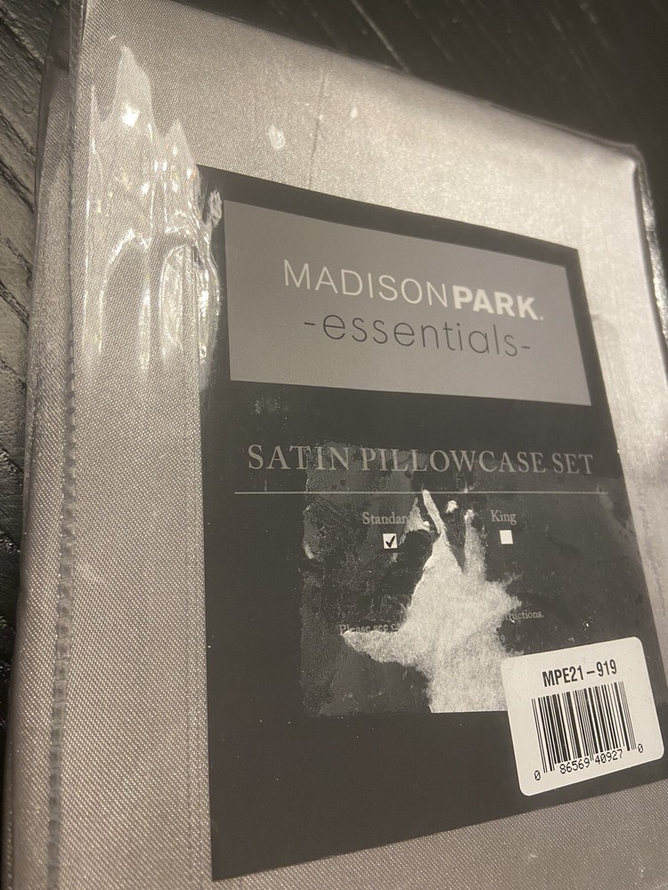 Madison Park Essentials Polyester Solid Satin Pillow Case MPE21-919 Standard New. Add a luxurious touch to your bed with the Madison Park essentials satin pillowcases. These silky high-luster satin pillowcases provide a smooth surface that reduces friction for your hair and skin, giving you a luxurious night's sleep. This pack includes 2 durable pillowcases which are wrinkle-free and ready to use without additional ironing or steaming. These pillowcases are also Oeko-Tex certified, meaning they do not contain any harmful substances or chemicals, ensuring quality comfort and wellness. Set of 2 luxurious silky satin pillowcases Provide smooth surface and reduce friction to sleep on - benefits for your hair and skin Wrinkle-free and durable Conveniently machine washable Oeko-Tex certification # 2019ok1325 aitex # Pieces In Set: 2 Included: 2 Pillowcase - 30x20-Inch Features: Wrinkle Resistant Warmth Factor: Lightweight Pillow Size: Standard Fabric Content: 100% Polyester Care: Machine Wash Decor Styles: Casual, Luxury + Glam Certifications And Listings: Standard 100 by Oeko-Tex Country of Origin: Imported