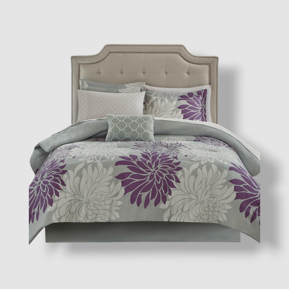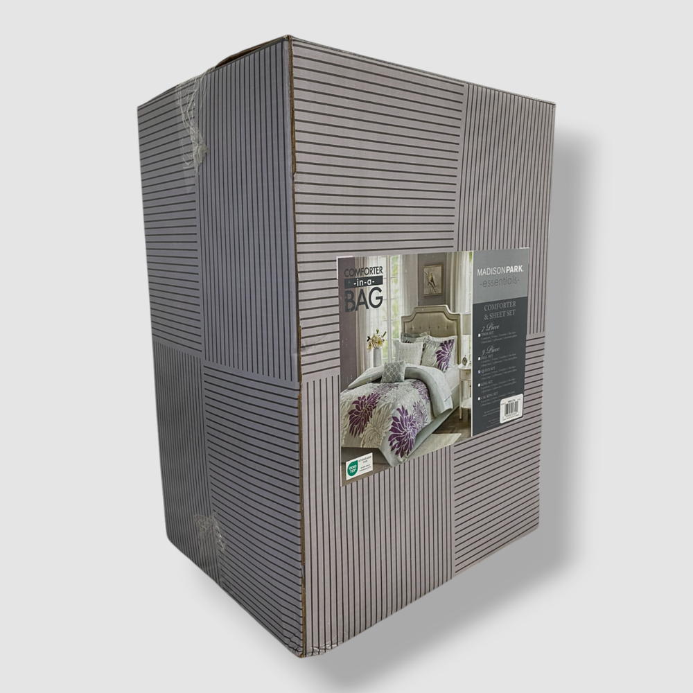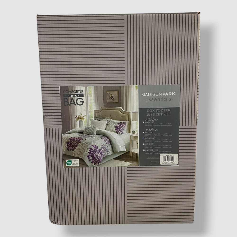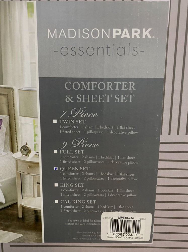 Madison Park Essentials Purple Maible 7-Piece King Size Comforter & Sheet Set Description Set includes: Comforter, 2 Standard Shams, , Flat Sheet, Fitted Sheet, 2 Standard Pillowcases, Decorative Pillow Set includes: comforter (90" x 90"), two standard shams (20" x 26"), bed skirt (60" x 80" + 15"), flat sheet (90" x 102"), fitted sheet (60" x 80" + 14"), two standard pillowcases (20" x 30") and one decorative pillow (12" x 18") Reversible Transitional printed floral comforters set with cotton sheets Features an anti-microbial treatment for odor and bacteria control, which enhances hygiene and keeps the fabric fresher, longer Embroidered decorative pillow detailing 100% cotton printed sheet set Fitted sheet fits up to a 16-inch (14-inch in Twin size) mattress Comforter/sham/bed skirt/pillow: polyester; sheet set: cotton; comforter/pillow fill: polyester 75 GSM Machine washable. Spot clean pillows. Imported About Us We sell only 100% authentic clothing from new with tags to gently used. We have a 100% authentic or money back guarantee on every item we sell. Items are listed daily so make sure to put us on your favorite! We have been in business for over 10 years selling tens of thousands of designer items. We strive to meet your designer needs at a quality price! Payment Shipping Returns Payment accepted via paypal, credit/debit card. Shipping is usually within 24 hours of purchase (M-F). Super fast service. Tracked delivery. 100% satisfaction guaranteed. Please review our eBay return policy for more details.