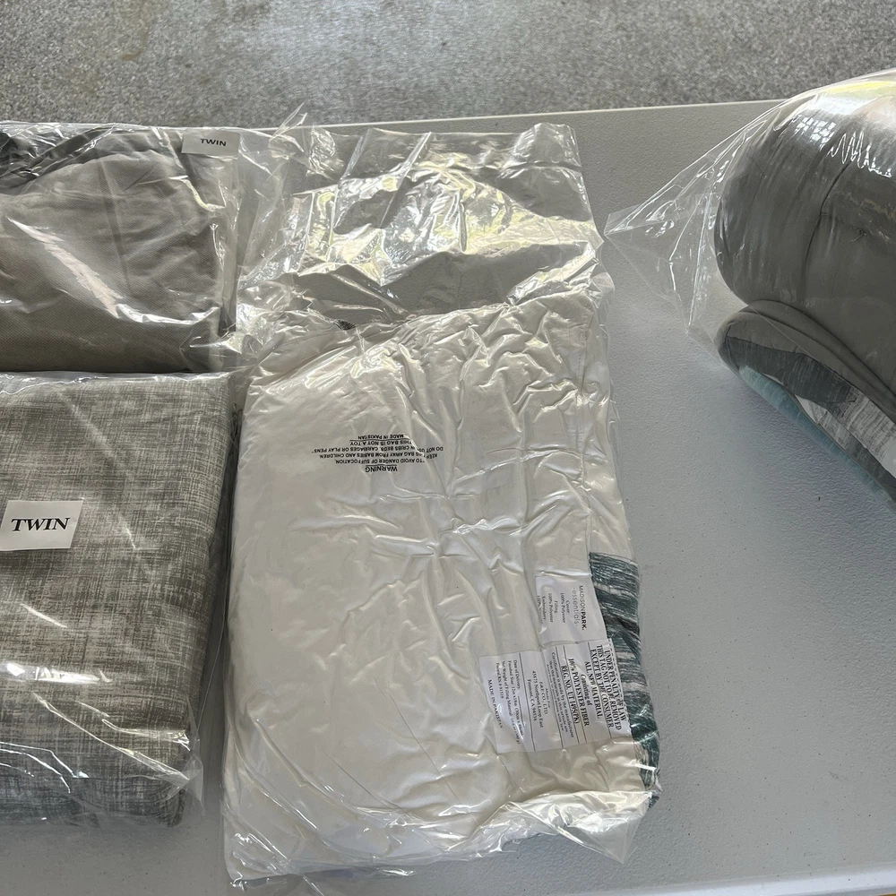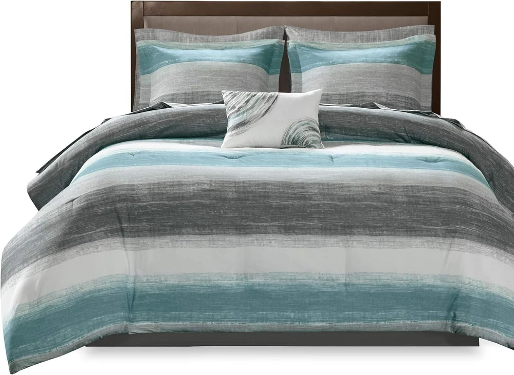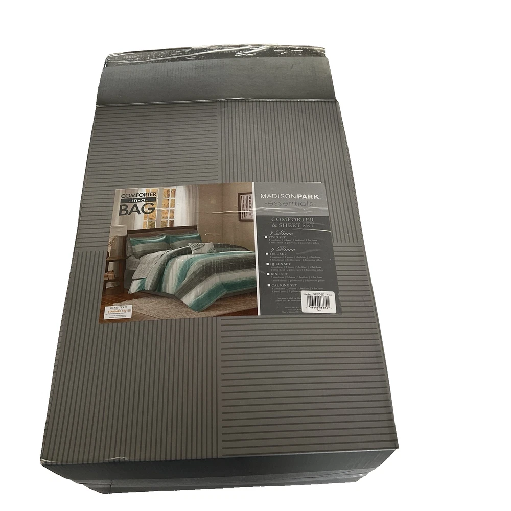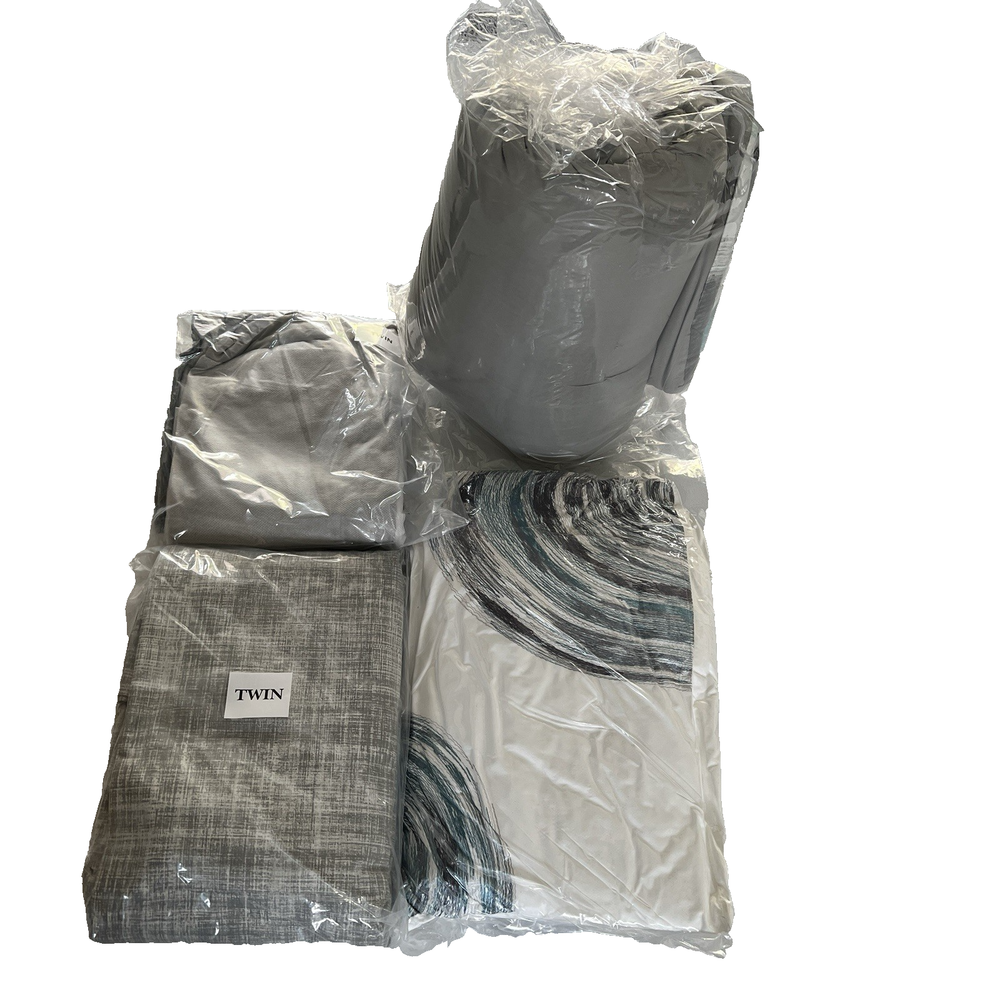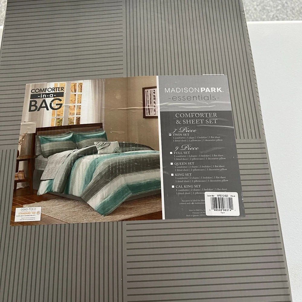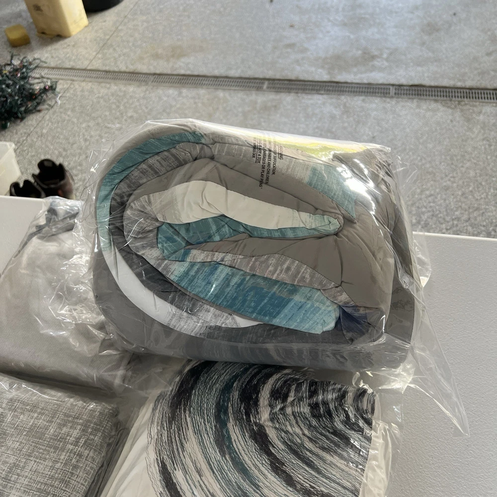 This comforter in a bag is brand new, never been used before. All of the contents are still in the vacuum sealed bags. This set includes a comforter, bed skirt, sham, decorative pillow, pillowcase, fitted sheet, and a flat sheet. You can get this set for a low price compared to other places! 100% Microfiber Comforter Set, 100% Cotton Sheet Set Elevate your bedroom with our comforter and sheet set. Featuring a coastal comforter with stunning watercolor prints and a chambray 100% cotton sheet set, it offers a complete and stylish makeover for a total refresh Coastal Bedding Set - The Saben Comforter Set features a charming watercolor print in aqua contrasts. Crafted with a soft brushed microfiber cover and lightweight, skin-friendly poly filling, it offers year-round comfort 100% Cotton Sheet Set - The Bed in a Bag includes a lightweight & breathable 100% muslin cotton sheet set. The grey chambray finish adds sophisticated contrast. The fitted sheet elastic pocket fits mattresses up to 14 inches (12 inches for Twin size) OEKO-TEX certified for superior COMFORT and WELLNESS, as they are free from any substances or chemicals that may compromise quality, and is hygienically treated for lasting freshness DURABLE & EASY CARE: Our microfiber comforter and cotton sheets offer durability to withstand daily wear and tear. Simply machine wash cold on LOW cycle. Do not bleach, Tumble dry LOW HEAT. Iron on medium heat if needed. Decor pillow spot clean only