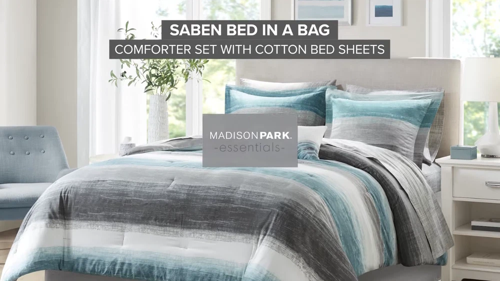 Store Categories Store Categories Bedding Comforters Decorative Pillows Duvet Covers Quilts & Coverlets Sheets Blankets & Throws Mattress Pads Pillows Home Decor Window Treatments Wall Art Home Accents Furniture Beds Dining Seating Ottomans & Benches Accent Chairs Accent Tables Dining Tables Sofas Bath Bath Robes Shower Curtains Towels Bath Rugs Bath Accessories Apparel Pajama Sets Nightgowns Rugs Rugs & Carpets Lighting Lamp Pendant Other Product Overview Details DESCRIPTION The Madison Park Essentials Saben Complete Comforter and Cotton Sheet Set provides a modern update to your bedroom. A watercolor stripe print is beautifully displayed on the ultra-soft microfiber comforter. The matching shams (1 in Twin Sizes) mirror the pattern of the comforter, while an embroidered decorative pillow and a solid grey bed skirt to complete the bedding set. A coordinating textured grey cotton sheet set is also included to complement the casual style of the comforter. Bringing the best in health and wellness, this bedding set also features an anti-microbial treatment that provides built-in freshness protection, reducing the growth of odor causing bacteria and keeps fabric lasting longer. This bedding set is also OEKO-TEX certified, meaning it does not contain any harmful substances or chemicals, ensuring quality comfort and wellness. This bedding set may come in rolled or compressed packing and will need to be fluffed up. Use a steam iron to help remove wrinkles easier. FEATURES • Casual bedding ensembles featuring water color stripe print comforter and cotton sheet set • Features an anti-microbial treatment for odor and bacteria control, which enhances hygiene and keeps the fabric fresher, longer • Set includes comforter, bedskirt (15" drop), 2 shams (1 in Twin), 1 oblong pillow, fitted and flat sheet and 2 pillowcases (1 in Twin) • Embroidered decorative pillow detailing • Hypoallergenic polyester filling in the comforter and pillows (filling contains no allergens and is treated to be dustproof) • Fitted sheet fits up to a 14-inch (12-inch in Twin size) mattress • OEKO-TEX certified, meaning it has no harmful substances or chemicals for quality comfort and wellness • Items in this set may come in rolled or compressed packaging and will need to be fluffed up • Machine Washable and steam iron for wrinkle removal MATERIAL Microfiber, printed sham and comforter, 7.3oz/square yard polyester filling, 100% cotton printed sheet set, embroidered decorative pillow Available Sizes: Twin Comforter Set includes: 1 Standard Sham: 20" x 26" + 2" 1 Fitted Sheet: 39" x 75" + 12" 1 Comforter: 68" x 86" 1 Bed Skirt: 39" x 75" + 15" 1 Pillowcase: 20" x 30" 1 Flat Sheet: 66" x 96" 1 Decorative Pillow: 12" x 18" Full Comforter Set includes: 2 Pillowcases: 20" x 30" 1 Comforter: 78" x 86" 1 Flat Sheet: 81" x 96" 1 Decorative Pillow: 12" x 18" 1 Bed Skirt: 54" x 75" + 15" 2 Standard Shams: 20" x 26" + 2" 1 Fitted Sheet: 54" x 75" + 14" Queen Comforter Set includes: 2 Standard Shams: 20" x 26" + 2" 1 Fitted Sheet: 60" x 80" + 14" 1 Decorative Pillow: 12" x 18" 1 Comforter: 90" x 90" 1 Bed Skirt: 60" x 80" + 15" 2 Pillowcases: 20" x 30" 1 Flat Sheet: 90" x 102" King Comforter Set includes: 1 Comforter: 104" x 92" 2 King Shams: 20" x 36" + 2" 1 Bed Skirt: 78" x 80" + 15" 1 Flat Sheet: 108" x 102" 1 Fitted Sheet: 78" x 80" + 14" 2 King Pillowcases: 20" x 40" 1 Decorative Pillow: 12" x 18" California King Comforter Set includes: 1 Comforter: 104" x 92" 2 King Shams: 20" x 36" + 2" 1 Bed Skirt: 72" x 84" + 15" 1 Flat Sheet: 108" x 102" 1 Fitted Sheet: 72" x 84" + 14" 2 King Pillowcases: 20" x 40" 1 Decorative Pillow: 12" x 18" Bedding Comforters Decorative Pillows Duvet Covers Quilts & Coverlets Sheets Blankets & Throws Mattress Pads Pillows Home Decor Window Treatments Wall Art Home Accents Furniture Beds Dining Seating Ottomans & Benches Accent Chairs Accent Tables Dining Tables Sofas Bath Bath Robes Shower Curtains Towels Bath Rugs Bath Accessories Rugs Rugs & Carpets Lighting Lamp Pendant Product Overview Product Details DESCRIPTION The Madison Park Essentials Saben Complete Comforter and Cotton Sheet Set provides a modern update to your bedroom. A watercolor stripe print is beautifully displayed on the ultra-soft microfiber comforter. The matching shams (1 in Twin Sizes) mirror the pattern of the comforter, while an embroidered decorative pillow and a solid grey bed skirt to complete the bedding set. A coordinating textured grey cotton sheet set is also included to complement the casual style of the comforter. Bringing the best in health and wellness, this bedding set also features an anti-microbial treatment that provides built-in freshness protection, reducing the growth of odor causing bacteria and keeps fabric lasting longer. This bedding set is also OEKO-TEX certified, meaning it does not contain any harmful substances or chemicals, ensuring quality comfort and wellness. This bedding set may come in rolled or compressed packing and will need to be fluffed up. Use a steam iron to help remove wrinkles easier. FEATURES • Casual bedding ensembles featuring water color stripe print comforter and cotton sheet set • Features an anti-microbial treatment for odor and bacteria control, which enhances hygiene and keeps the fabric fresher, longer • Set includes comforter, bedskirt (15" drop), 2 shams (1 in Twin), 1 oblong pillow, fitted and flat sheet and 2 pillowcases (1 in Twin) • Embroidered decorative pillow detailing • Hypoallergenic polyester filling in the comforter and pillows (filling contains no allergens and is treated to be dustproof) • Fitted sheet fits up to a 14-inch (12-inch in Twin size) mattress • OEKO-TEX certified, meaning it has no harmful substances or chemicals for quality comfort and wellness • Items in this set may come in rolled or compressed packaging and will need to be fluffed up • Machine Washable and steam iron for wrinkle removal MATERIAL Microfiber, printed sham 