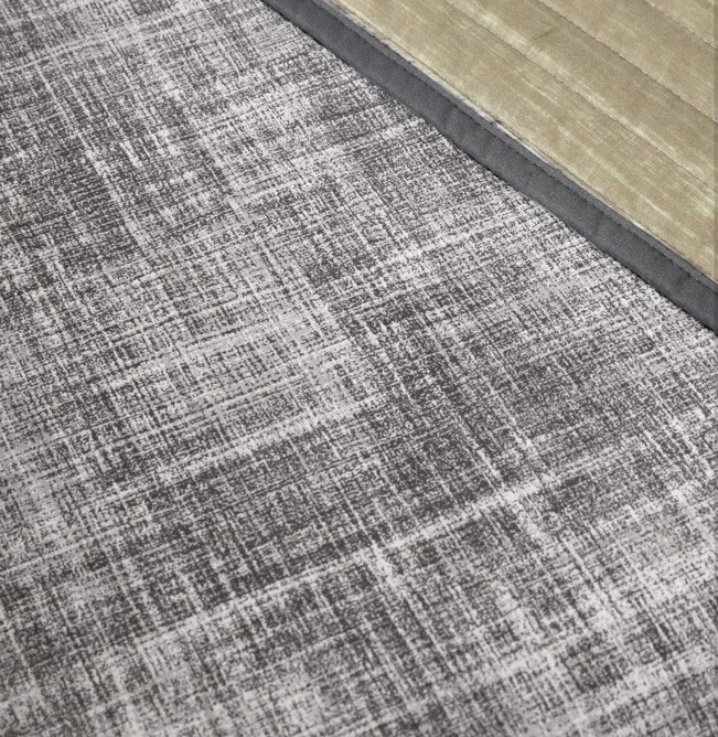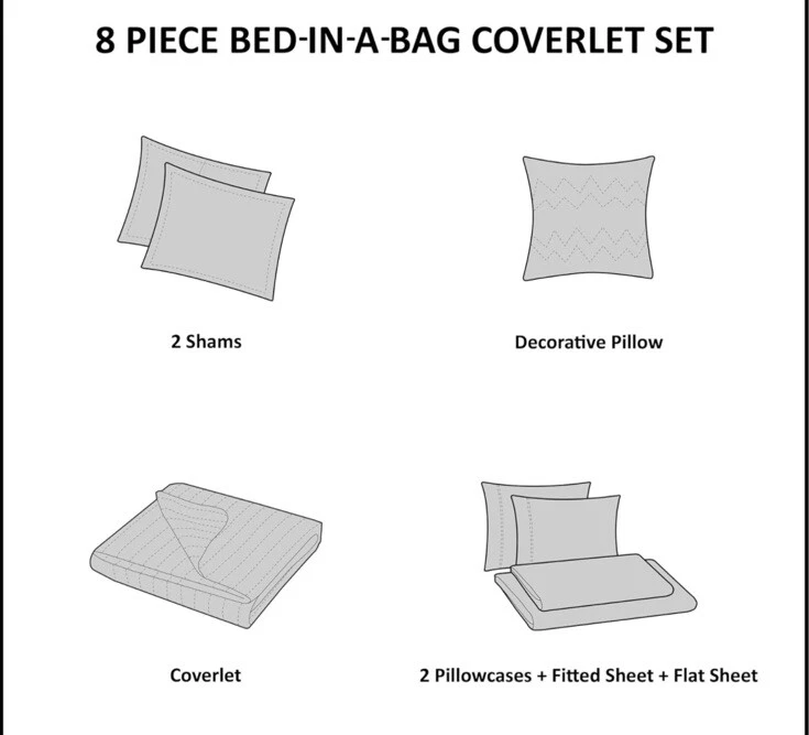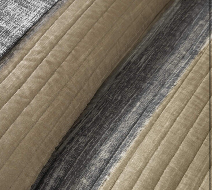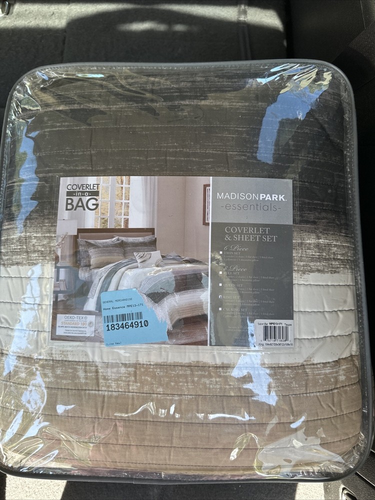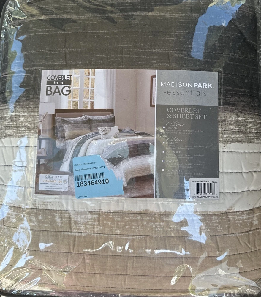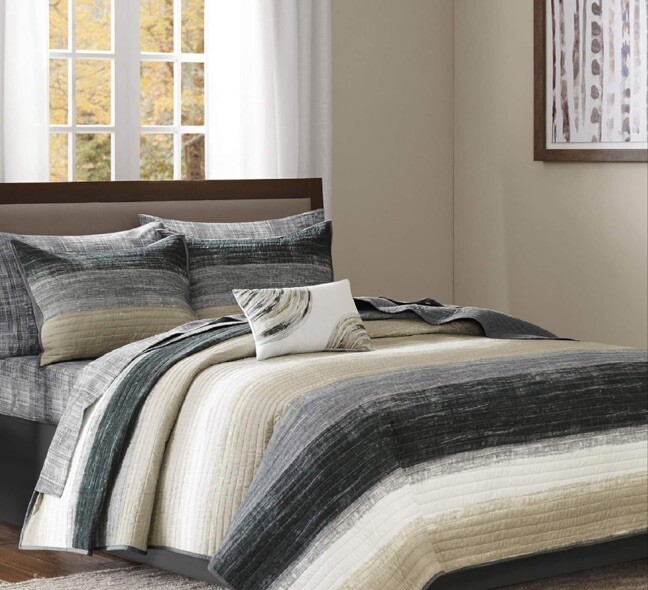 Size King (104 in x 92 in) Included Components 1 Coverlet, 2 King Shams, 2 Pillowcases, 1 Decorative Pillow, 1 Flat Sheet, 1 Fitted Sheet Color Stripes Taupe Coverlet Biab 8pcs Style Casual Brand Madison Park Theme Abstract Polyester, Cotton The Saben Complete Reversible Coverlet and Sheet Set provides a modern approach to the traditional stripe. A watercolor technique gives a textured look to the shades of grey and aqua stripes on the comforter and shams. Comforter is made of microfiber fabric, while Sheet set is made of 100% cotton. They are Oeko Tex Certified for not having any harmful chemical substance. Set includes: 1 Coverlet: 104"W x 92"L, 1 Fitted Sheet: 78"W x 80"L + 14"D, 2 King Shams: 20"W x 36"L, 2 Pillowcases: 20"W x 40"L, 1 Flat Sheet: 108"W x 102"L, 1 Decorative Pillow: 12"W x 18"L Care instructions: Machine wash cold, gentle cycle, and separately. Do not bleach. Tumble dry low, remove promptly. Do not iron. Spot clean pillows. If there is no free movement in the washer or dryer, use large capacity commercial washer/dryer