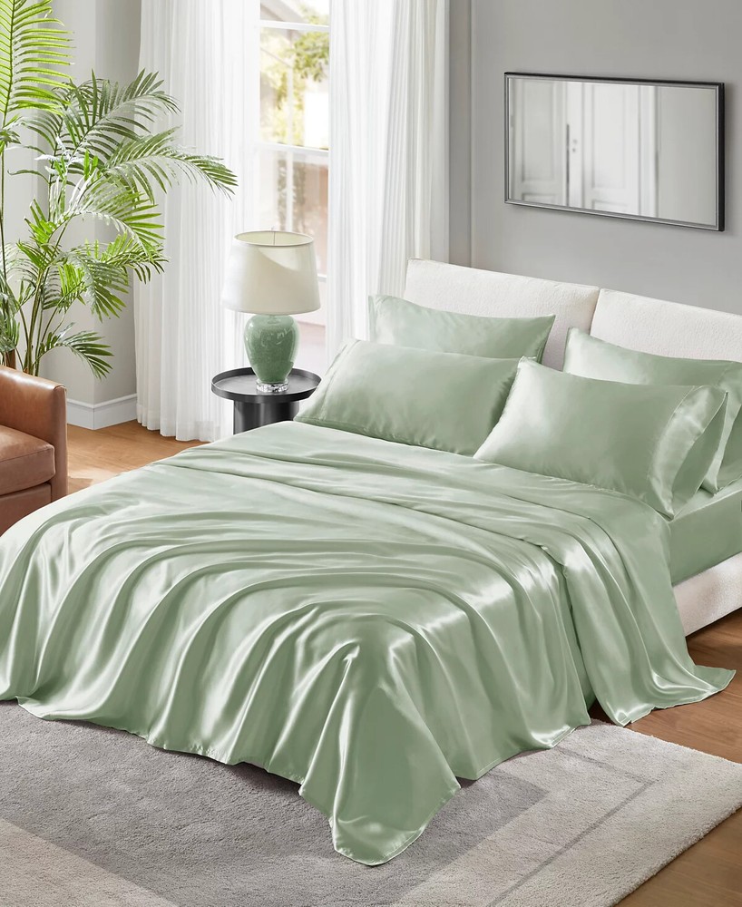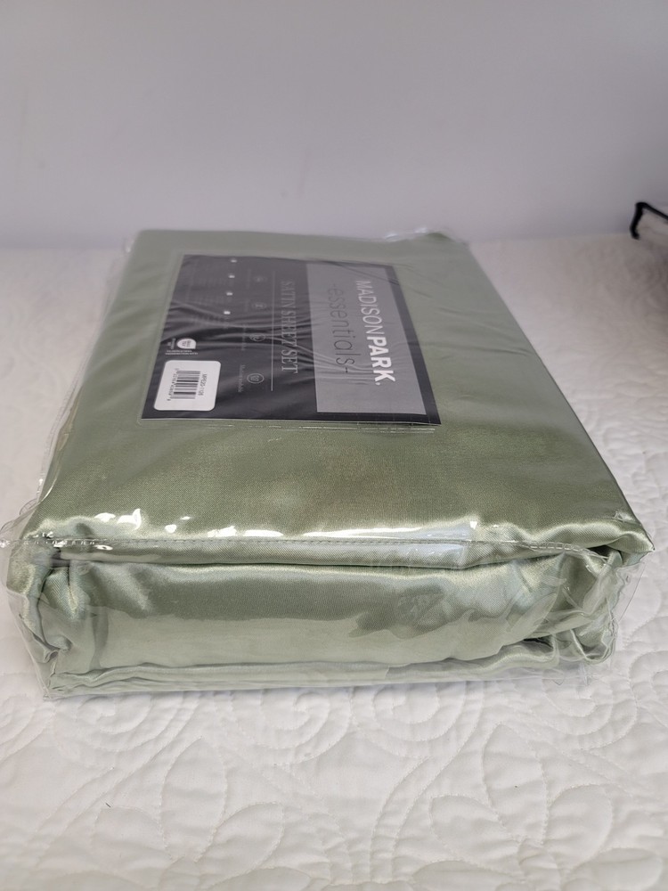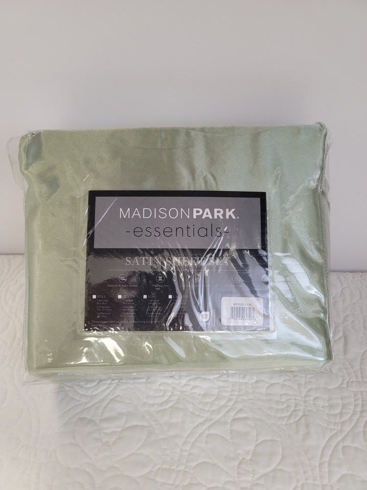 Madison Park King Satin Luxury Sheet Set Sage Put a high-gloss finish on your bedding ensemble with the lustrous shine and silky satin of this Madison Park Essentials sheet set. Dimensions - 1 flat sheet:108" W x 102" L, 4 king pillowcases:20" W x 40" L, 1 fitted sheet:78" W x 80" L x 14" D Luxurious silky satin sheets with 2 extra pillowcases included Wrinkle free and durable Fitted sheet fits up to 16-inch on the mattress depth Set includes 1 flat sheet, 1 fitted sheet, and 4 pillowcases Conveniently machine washable Asian American & Pacific Islander Owned, Woman Owned Polyester Machine washable Imported
