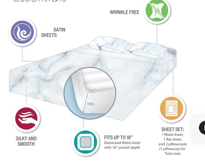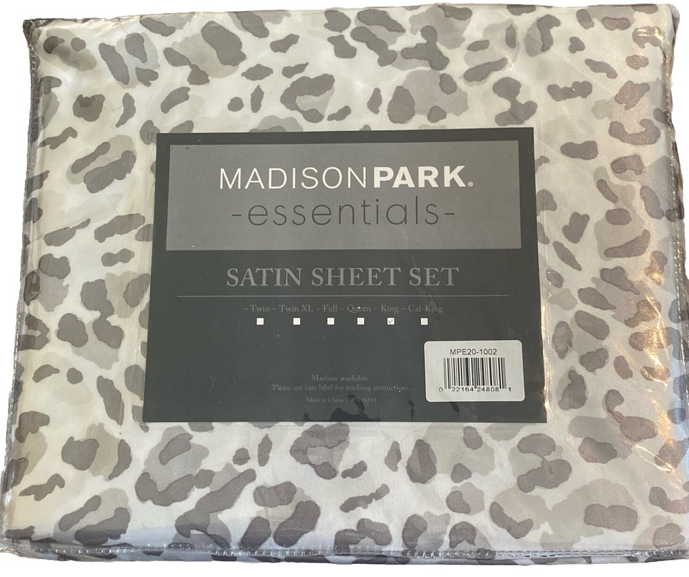 Madison Park Essentials Satin Luxury Print Sheet Set king size PRODUCT FEATURES • Wrinkle-free satin, smooth comfort • Fitted sheet fits most mattresses up to 16-in. deep • Helps to tame frizz & reduce hair breakage while sleeping • Smooth and silky texture gentle on skin and hair • Pillowcases are open ended on one side • Superior softness • Easy care • 4-piece set • Flat Sheet: 108" x 102" • Fitted Sheet: 78" x 80" x 14" • 2 King Pillowcases: 20" x 40" (each) Polyester • Machine wash • Imported SUSTAINABILITY FEATURES • Tested for harmful substances • STANDARD 100 by OEKO-TEX® CERTIFIED • Certification No. 2019OK1325 • Testing Institute: AITEX® • www.oeko-tex.com/standard100