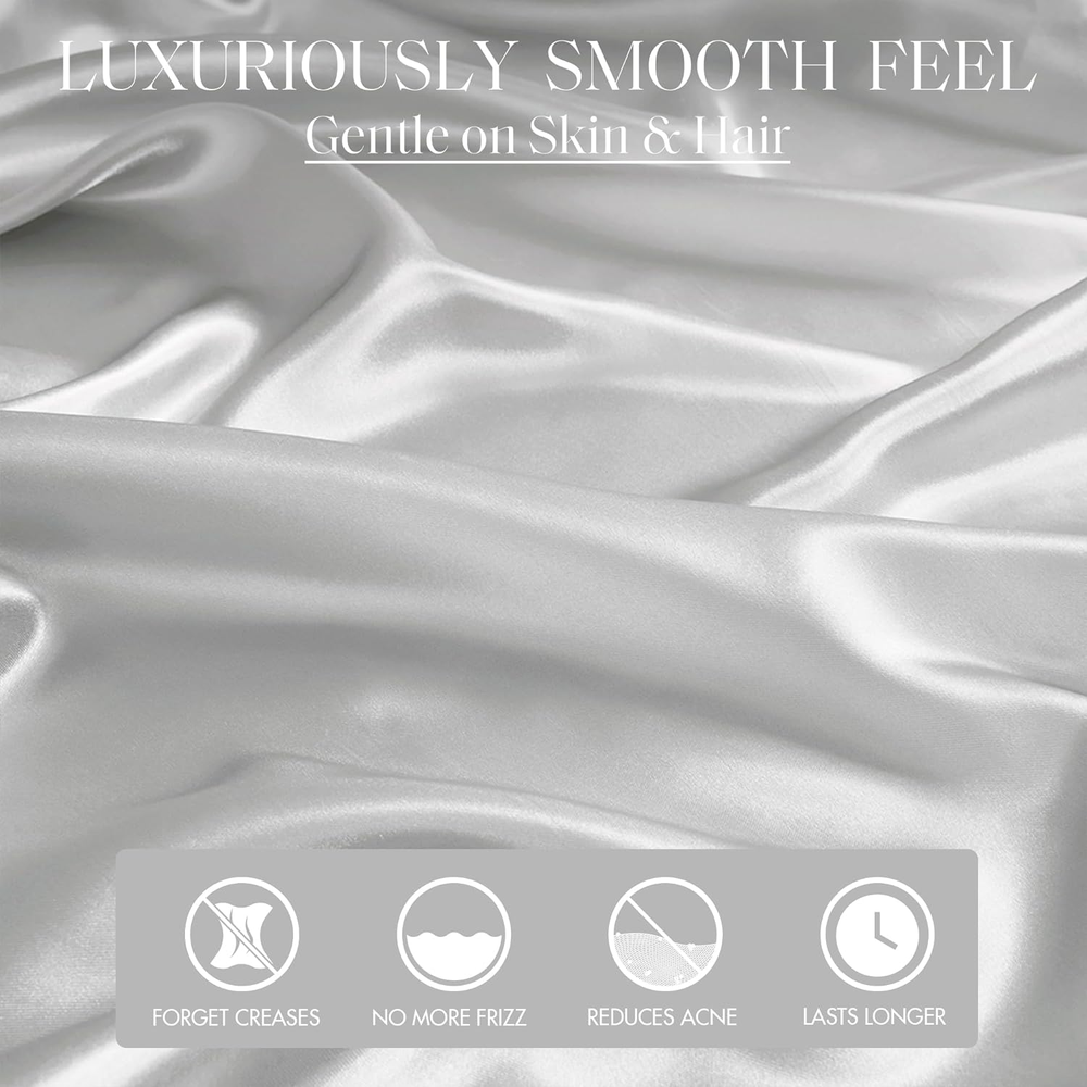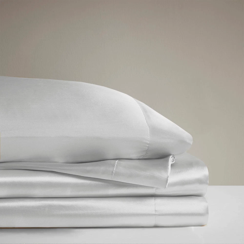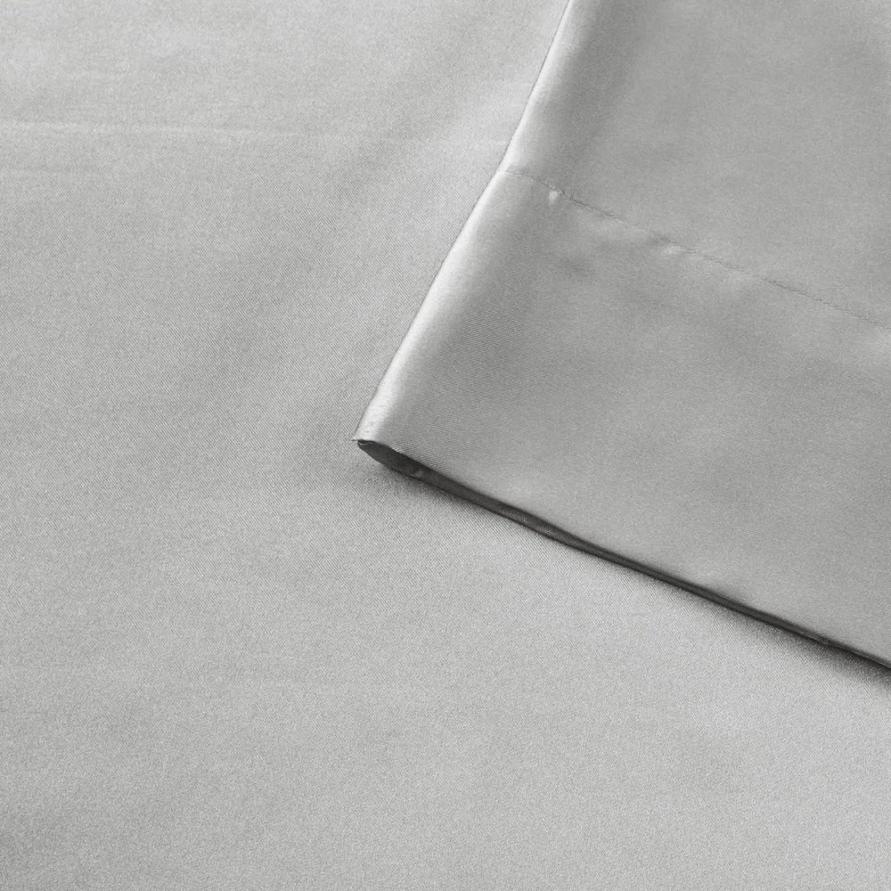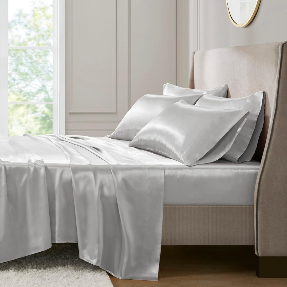Madison Park Essentials Satin Sheet Set Luxury and Silky with Natural Sheen, Elastic 14" Pocket fits up to 16" Mattress, All Around Elastic - Year-Round Bedding, Queen, Light Grey, 6 Piece 100% Polyester Solid Satin PRODUCT FEATURES - Satin luxury sheet set, wrinkle free and durable with 2 extra pillowcases included. This sheet set includes 1 flat sheet, 1 fitted sheet, and 4 pillowcases FIT - With elastic all around, the deep pocket fitted sheet can be stretched to fit snugly with your matress. Fits mattress up to 16" FABRICATION - 100% polyester microfiber with long lasting strength and fade resistant Set includes: 1 Flat Sheet: 90"W x 102"L, 1 Fitted Sheet: 60"W x 80"L + 14"D, 4 Standard Pillowcases: 20"W x 30"L EASY CARE - Machine washable and dries quick on tumble dry low Fall asleep in smooth and luxurious comfort with our wrinkle-free satin sheets. These satin sheets are gentle on your skin and hair, while helping reduce damage causing friction, making this set an essential for your beauty self-care routine. Also included are 2 additional pillowcases to complete your room into full luxury. These sheets are also OEKO-TEX certified, meaning they do not contain any harmful substances or chemicals, ensuring quality comfort and wellness.
