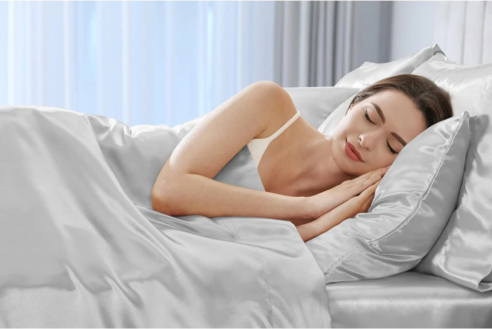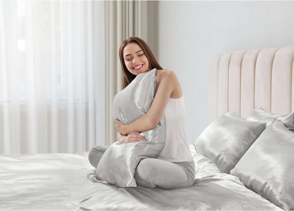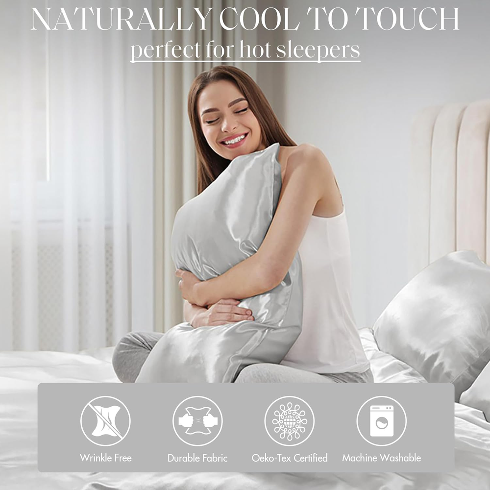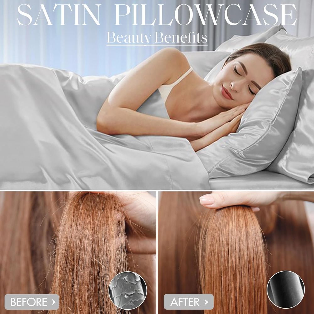 Madison Park Essentials Satin Sheet Set Luxury and Silky with Natural Sheen, Elastic 14" Pocket fits up to 16" Mattress, All Around Elastic - Year-Round Bedding, Queen, Light Grey, 6 Piece 100% Polyester Solid Satin PRODUCT FEATURES - Satin luxury sheet set, wrinkle free and durable with 2 extra pillowcases included. This sheet set includes 1 flat sheet, 1 fitted sheet, and 4 pillowcases FIT - With elastic all around, the deep pocket fitted sheet can be stretched to fit snugly with your matress. Fits mattress up to 16" FABRICATION - 100% polyester microfiber with long lasting strength and fade resistant Set includes: 1 Flat Sheet: 90"W x 102"L, 1 Fitted Sheet: 60"W x 80"L + 14"D, 4 Standard Pillowcases: 20"W x 30"L EASY CARE - Machine washable and dries quick on tumble dry low Fall asleep in smooth and luxurious comfort with our wrinkle-free satin sheets. These satin sheets are gentle on your skin and hair, while helping reduce damage causing friction, making this set an essential for your beauty self-care routine. Also included are 2 additional pillowcases to complete your room into full luxury. These sheets are also OEKO-TEX certified, meaning they do not contain any harmful substances or chemicals, ensuring quality comfort and wellness.