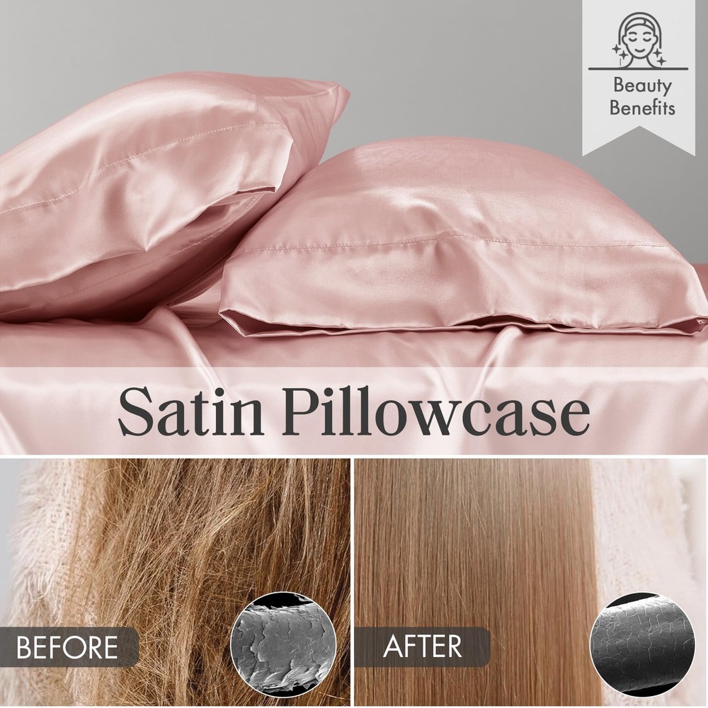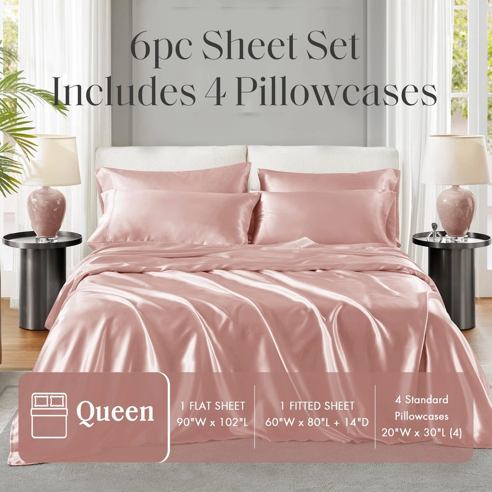 Product Page Madison Park Essentials Queen Free Luxurious 6 Piece Sheet Set MPE20-7 Kitchen Description: Fall asleep in smooth and luxurious comfort with our wrinkle-free satin sheets. These satin sheets are gentle on your skin and hair, while helping reduce damage causing friction, making this set an essential for your beauty self-care routine. Also included are 2 additional pillowcases to complete your room into full luxury. These sheets are also OEKO-TEX certified, meaning they do not contain any harmful substances or chemicals, ensuring quality comfort and wellness. Features: TRENDY - Sophisticated silky satin sheet set is luxuriously soft, feels smooth and naturally cool to touch perfect summer sheet set, and ideal for year-round comfort. It comes with natural sheen to complement your décor for an updated look SECURED FIT - Our queen size Satin Sheets set, features fitted sheet with all around elastic deep pocket to securely fits mattresses up to 16-inch thickness PREMIUM QUALITY - Our Queen satin sheet set is durable; fade, shrink and wrinkle resistant. Offers luxurious feel, smooth and silky texture gentle on skin and hair; cool to the touch to keep you comfortable during hot nights PACKAGE AND MEASUREMENTS - 1 Flat Sheet: 90"Wx102"L, 1 Fitted Sheet: 60"Wx80"L+14"D, 4 Standard Pillowcases: 20"Wx30"L (Includes two sets of pillowcase - total 4 pillowcases) EASY CARE - Conveniently machine washable to prevent pilling, wash in cold water and sun-dry or tumble dry in low