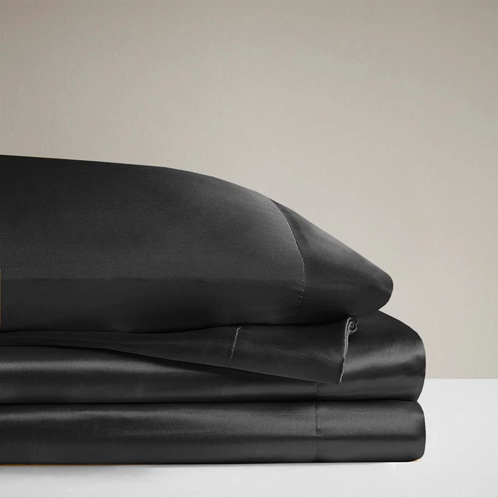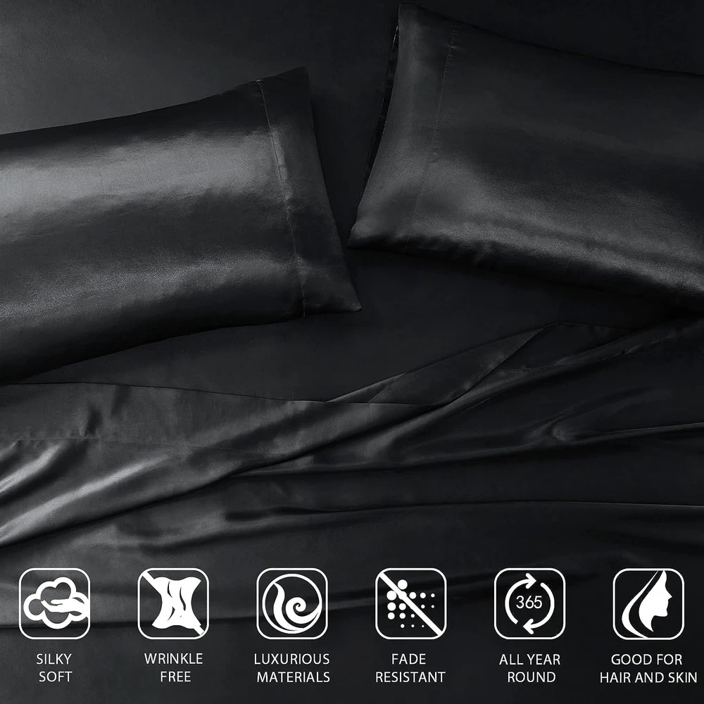 100% Polyester PRODUCT FEATURES - Satin luxury sheet set, wrinkle free and durable with 2 extra pillowcases included. This sheet set includes 1 flat sheet, 1 fitted sheet, and 4 pillowcases FIT - With elastic all around, the deep pocket fitted sheet can be stretched to fit snugly with your matress. Fits mattress up to 16" FABRICATION - 100% polyester microfiber with long lasting strength and fade resistant PACKAGE INCLUDES AND MEASUREMENTS - 1 Flat Sheet: 90"Wx102"L 4 Standard Pillowcases: 20"Wx30"L(4) 1 Fitted Sheet: 60"Wx80"L+14"D EASY CARE - Machine washable and dries quick on tumble dry low Fall asleep in smooth and luxurious comfort with our wrinkle-free satin sheets. These satin sheets are gentle on your skin and hair, while helping reduce damage causing friction, making this set an essential for your beauty self-care routine. Also included are 2 additional pillowcases to complete your room into full luxury. These sheets are also OEKO-TEX certified, meaning they do not contain any harmful substances or chemicals, ensuring quality comfort and wellness.