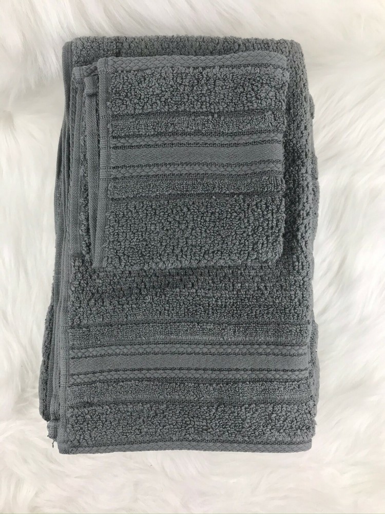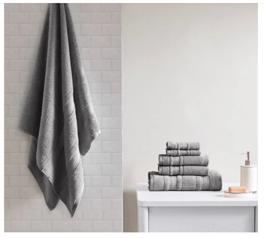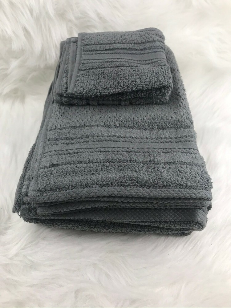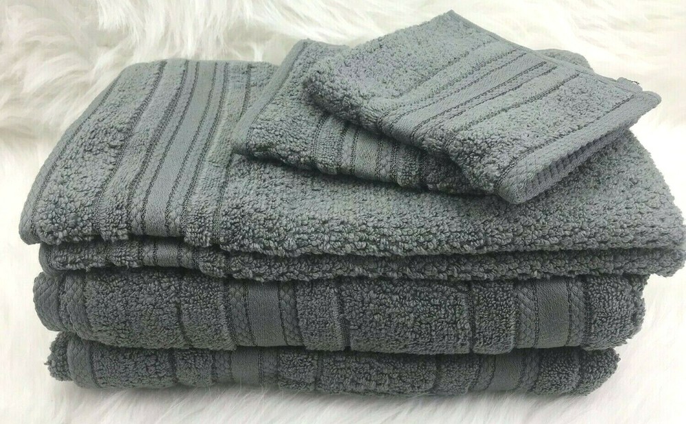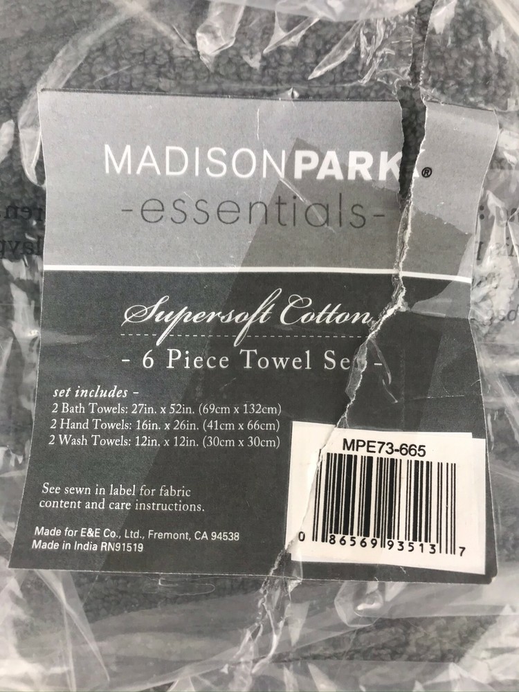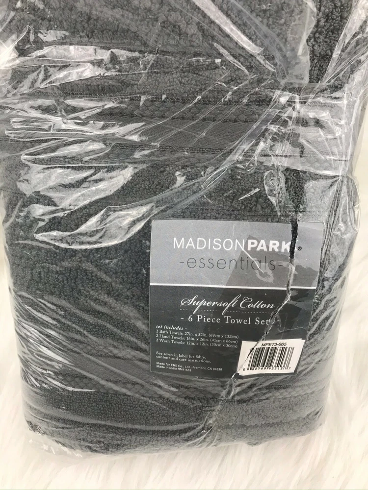 Madison Park Essentials Supersoft Cotton Solid 6-pc. Luxury Bath Towel Set NEW Color - Dark Grey/Gray New in Open Bag Adrien Super Soft 6 Piece Cotton Towel Set - Madison Park Essentials MPE73-665 The Madison Park Essentials Adrien Super Soft 6 Piece Cotton Towel Set introduces a one-of-a-kind softness These zero twist towels are much stronger and softer compared to your average towel. Other towels twist the yarns to add extra strength, but zero twist does not. This is because the luxurious cotton yarns that make up our towels are naturally strong and soft, creating a rich plush feel that is also lightweight. These zero twist cotton towels are also absorbent, but they do not soak up moisture. They are quick-drying to give you the feeling that the moisture is simply being removed from your skin. Made from 100% cotton, these lavish towels offer a superior softness that pairs well with any setting and are machine washable for easy care. Set includes 2 bath towels, 2 hand towels, 2 wash towels. MPE73-665 Features: 100% cotton 6-piece cotton towel set 2 bath towels (27x52), 2 hand towels (16x26) and 2 wash towels (12x12) Zero twist cotton yarn that is super absorbent Machine washable Material/Fabrication: 100% cotton Style: Casual Primary Color: Dark Gray 2 Bath Towels:27"W x 52"L (2) 2 Hand Towels:16"W x 26"L (2) 2 Wash Towels:12"W x 12" L (2) Approx. Weight: 3 lbs.