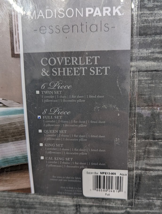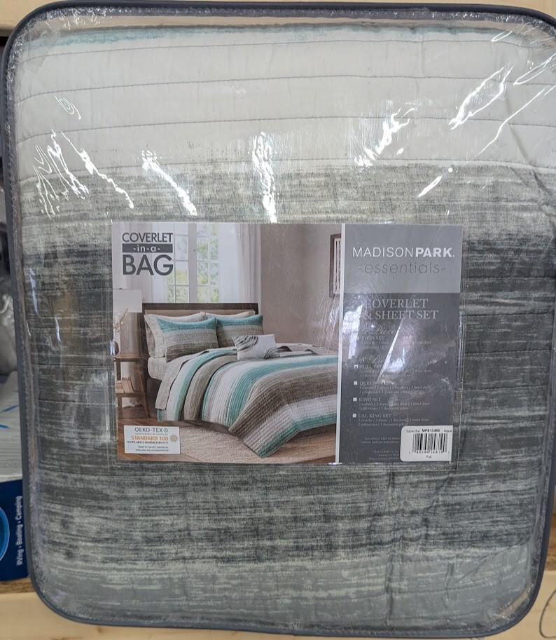Madison Park Essentials Saben Cozy Bed in A Bag Reversible Quilt with Complete Cotton Sheet Set-Geometric Design All Season Cover, Decorative Pillow, Full(78"x86"), Stripes Aqua 8 Piece(G3) In stock and ships fast New Item USA Seller See pictures to see exactly what you get 100% Microfiber The Saben Complete Reversible Coverlet and Sheet Set provides a modern approach to the traditional stripe. A watercolor technique gives a textured look to the shades of grey and aqua stripes on the comforter and shams. Comforter is made of microfiber fabric, while Sheet set is made of 100% cotton. They are Oeko Tex Certified for not having any harmful chemical substance. Set includes: 1 Coverlet: 78"W x 86"L, 2 Standard Shams: 20"W x 26"L, 1 Flat Sheet: 81"W x 96"L, 1 Fitted Sheet: 54"W x 75"L + 14"D, 2 Standard Pillowcases: 20"W x 30"L, 1 Decorative Pillow: 12"W x 18"L Care instructions: Machine wash cold, gentle cycle, and separately. Do not bleach. Tumble dry low, remove promptly. Do not iron. Spot clean pillows. If there is no free movement in the washer or dryer, use large capacity commercial washer/dryer.