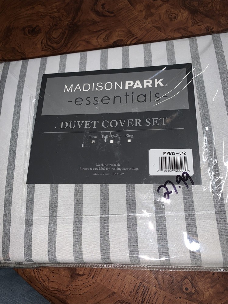 Brand new Madison Park Essentials Twin Duvet Cover Set Machine Washable. Gray stripe. Very nice.