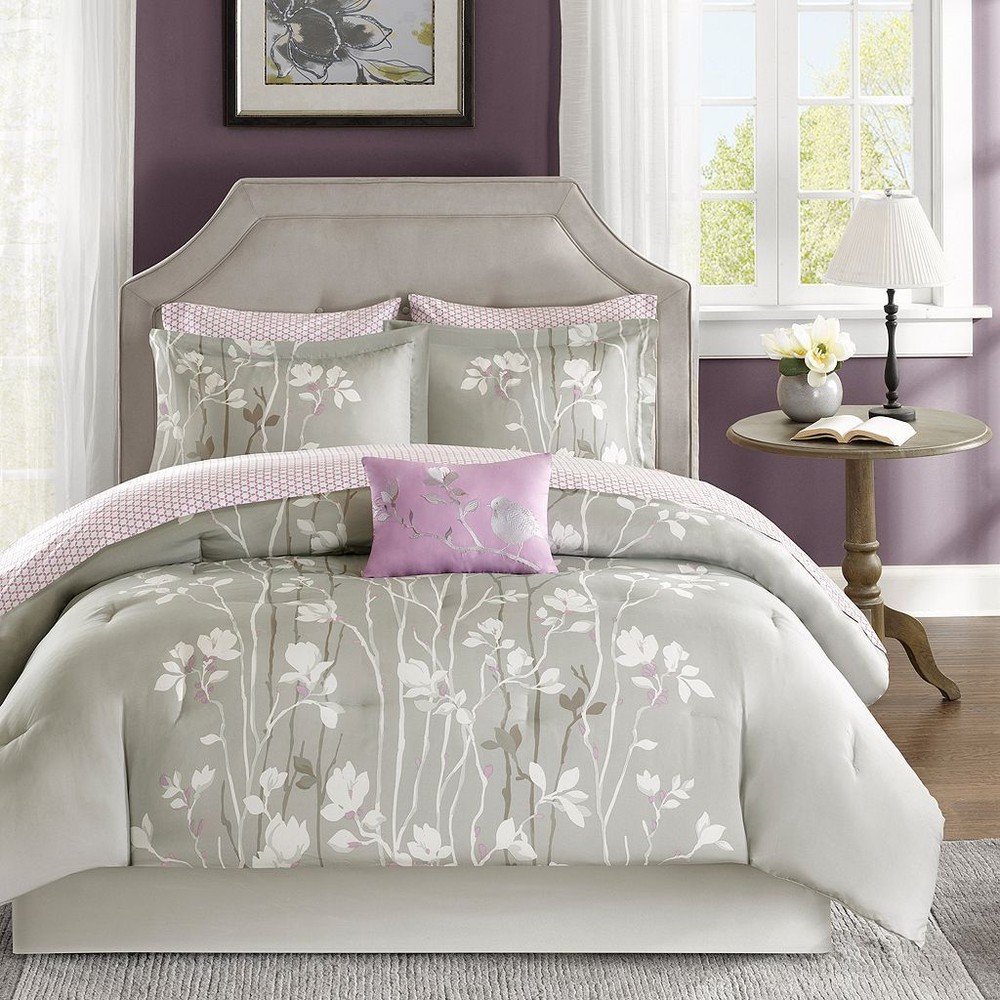 A classic motif and muted color palette make this Fulton bed set a fresh and fashionable choice. In gray. FEATURES Soft microfiber fabric Floral & branch motif Embroidered pillow TWIN 7-PIECE SET 68'' x 86'' comforter Standard sham Bed skirt: 15'' drop Fitted sheet: fits most mattresses up to 12'' deep Flat sheet Standard pillowcase Throw pillow: 12'' x 18''