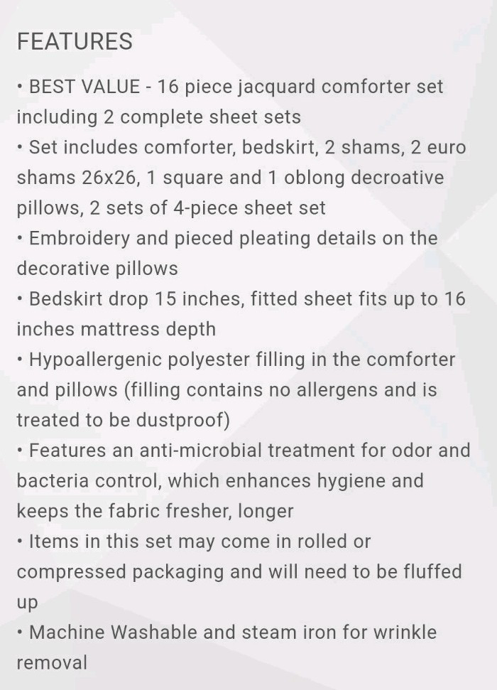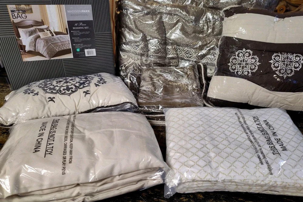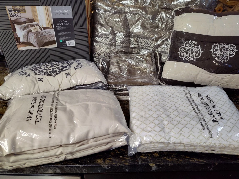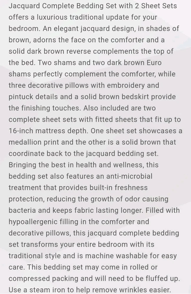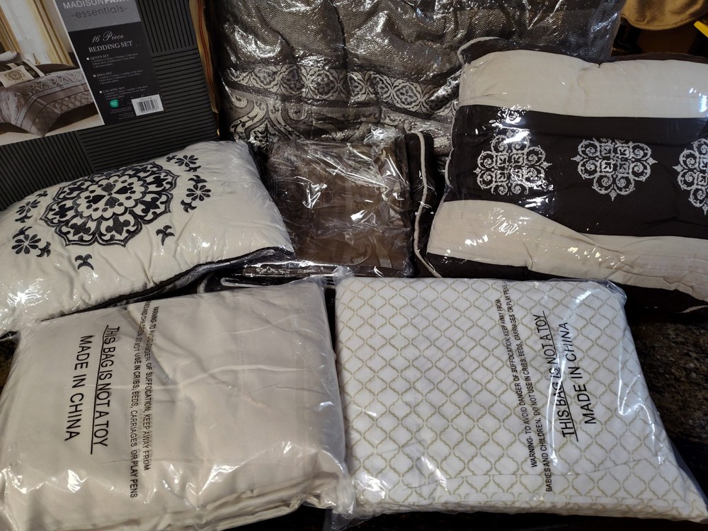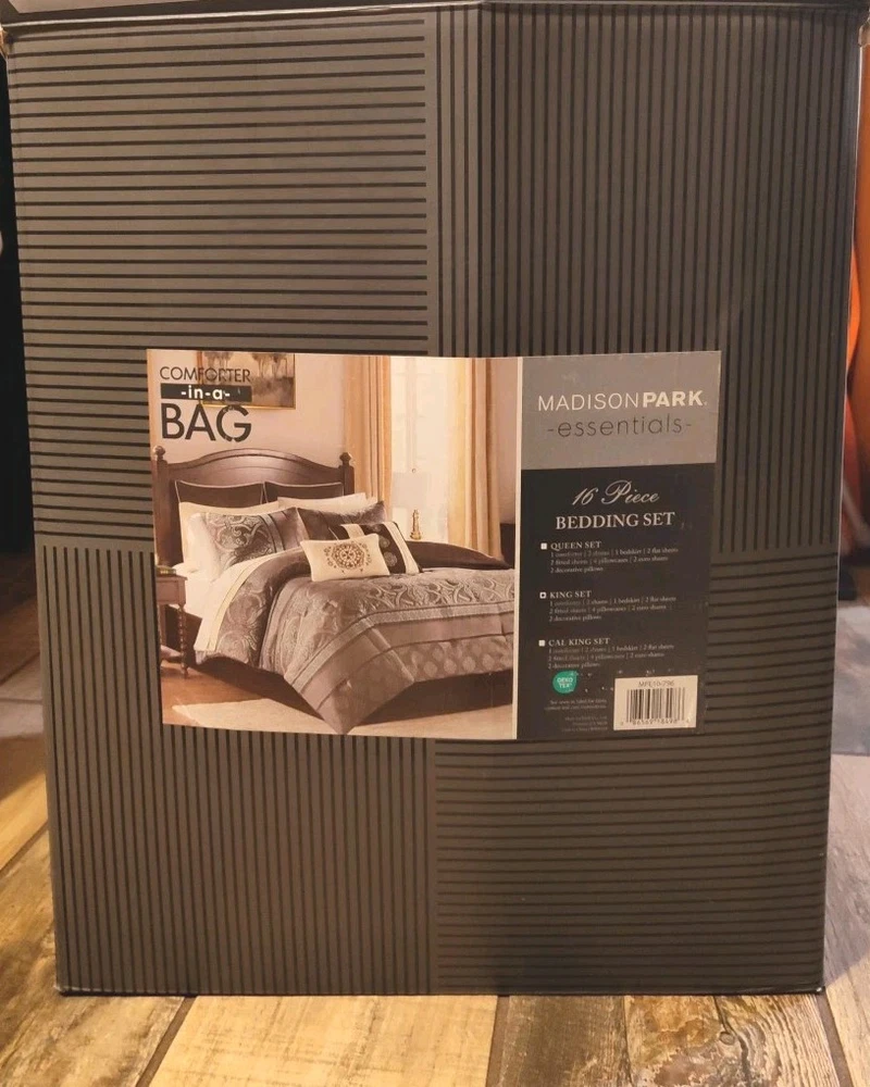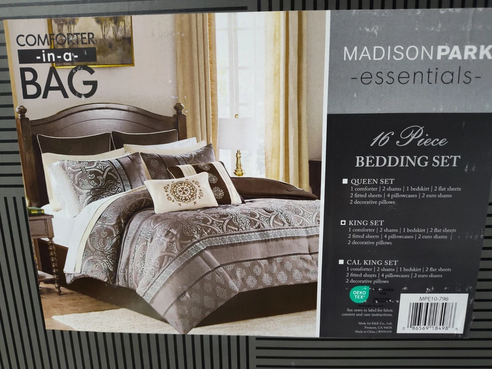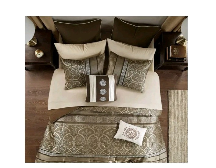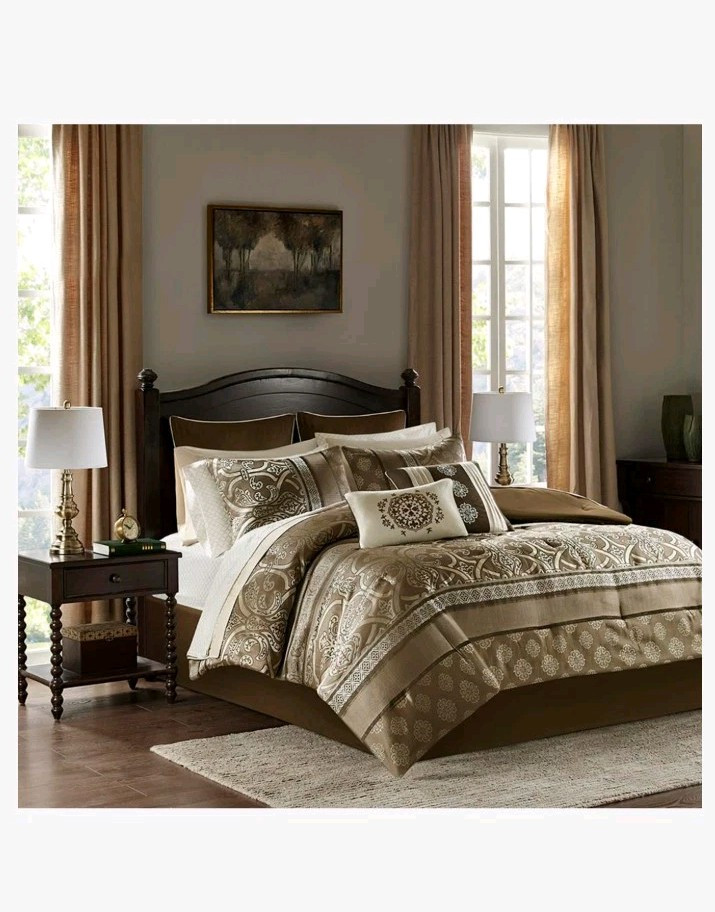 New in the box complete King size comforter set. The Zara 16 Piece Jacquard Bedding Set with 2 Complete Sheet Sets, offers a luxurious traditional update for your bedroom. An elegant jacquard design, in shades of brown, adorns the face on the comforter and a solid dark brown reverse complements the top of the bed. I opened the box for photos. The comforter bag was opened also to show the true colors. This is a very large box. I have placed the comforter in a brand new vacuum bag for shipping. It's a heavy set all together and I will vacuum bag as many components to save space for shipping. Doing that will likely cause additional wrinkling and the comforter will need to be fluffed. Im happy to send the box folded as well(if buyer wants it). We can communicate after purchase. All measurements and additional descriptions may be found in photos provided. All photos are part of description. **The smaller pillow displayed in stock photos is a different color in the set. I photographed to show its more of a silver brown than depicted. PLEASE READ FULL DESCRIPTION *** ALL SALES FINAL ***RETURNS NOT ACCEPTED*** Whether I offer free shipping or charge a shipping fee, USPS GROUND Advantage is what I use. It's fast and economical. If I see a faster and/or more affordable option, I will switch carriers to benefit the buyer. If a buyer chooses a different shipping method and it's faster but more expensive, I will not automatically change shipping methods. Shipping is not cheap. If you choose priority mail without notifying me in advance and agree to pay the additional costs, it will be shipped by my preferred carrier without notice. Simply choosing priority doesn't work. I insure any item over $100.00. ***All sales final***I do not accept returns***please read everything before buying I've done everything possible to describe this item so you make an informed decision. My photos are included as part of a description of this item. If the photos do not give enough information, please reach out BEFORE you buy. *** NO RETURNS ACCEPTED*** means please do your research on the item I'm offering before you submit an offer. Buyers remorse is not a valid reason to return. It doesn't fit, not my size, I don't like the color now, are not valid reasons to return. Misrepresentation is. eBay offers a money back guarantee if I misrepresent an item or if for some reason it is damaged during shipping. I also photograph every item before shipping. I insure any item over $100.00 Please make sure it's what you want before you buy. Message me with any questions before you buy. Thanks for stopping by my shop. I appreciate every visit!