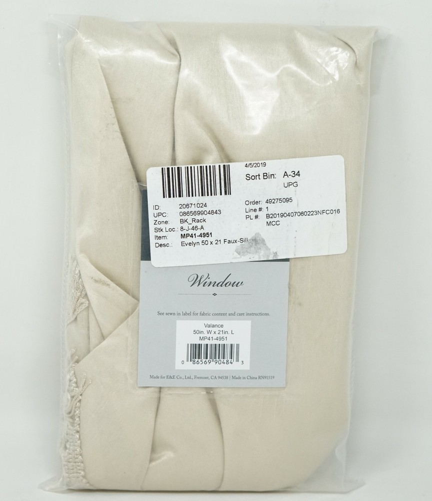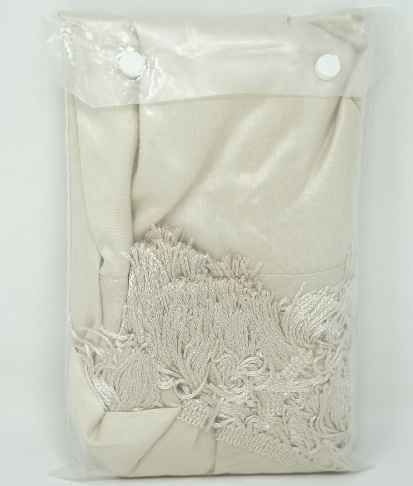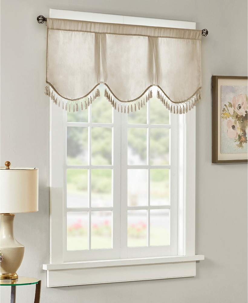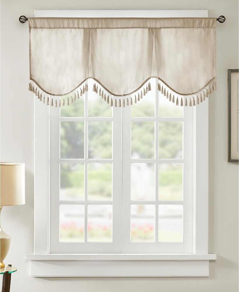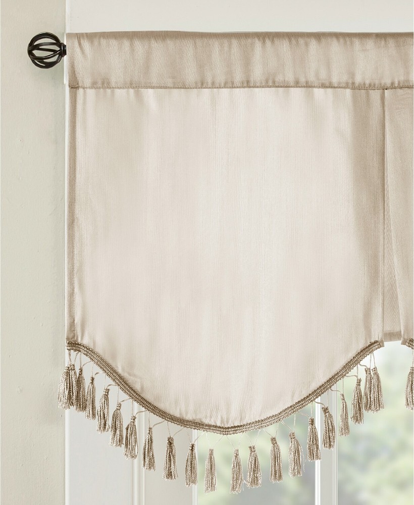 Brand New - Refolded Color: Champagne Size: 50" x 21" Soft, feminine, and sophisticated makes the Evelyn Scallop Embellished Valance the perfect finishing touch to your window. This classy valance features a 3 tier scallop design with a beautiful tassel trim. Approx. dimensions: 50" x 21" Faux-silk fabric and lining: polyester Rod pocket top header Fits rod up to 1.25" diameter 3-tiered scallop design Lined ALL polyester Machine washable Imported