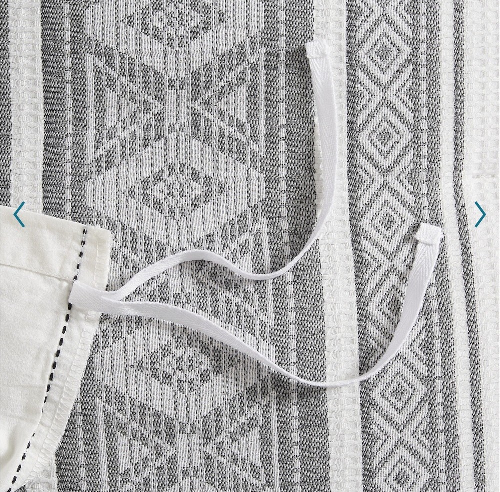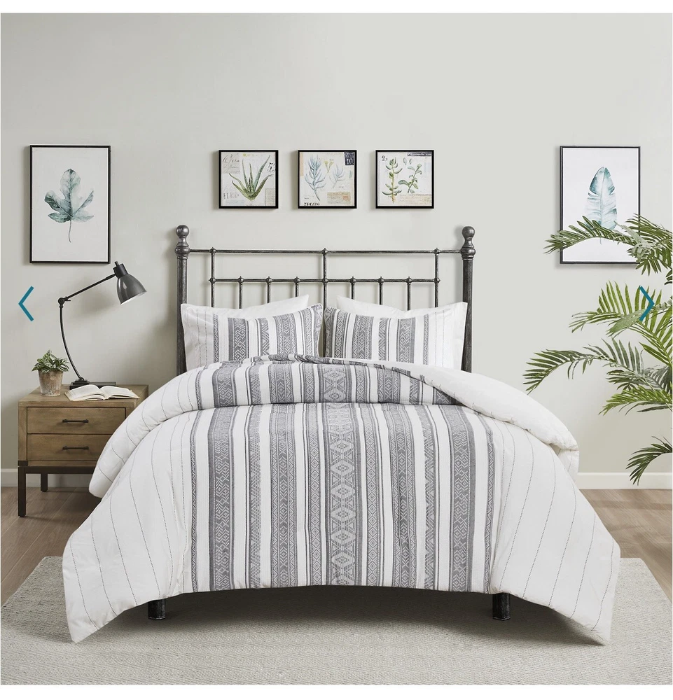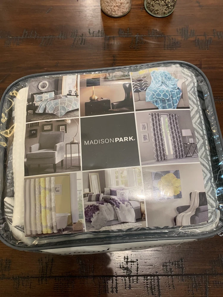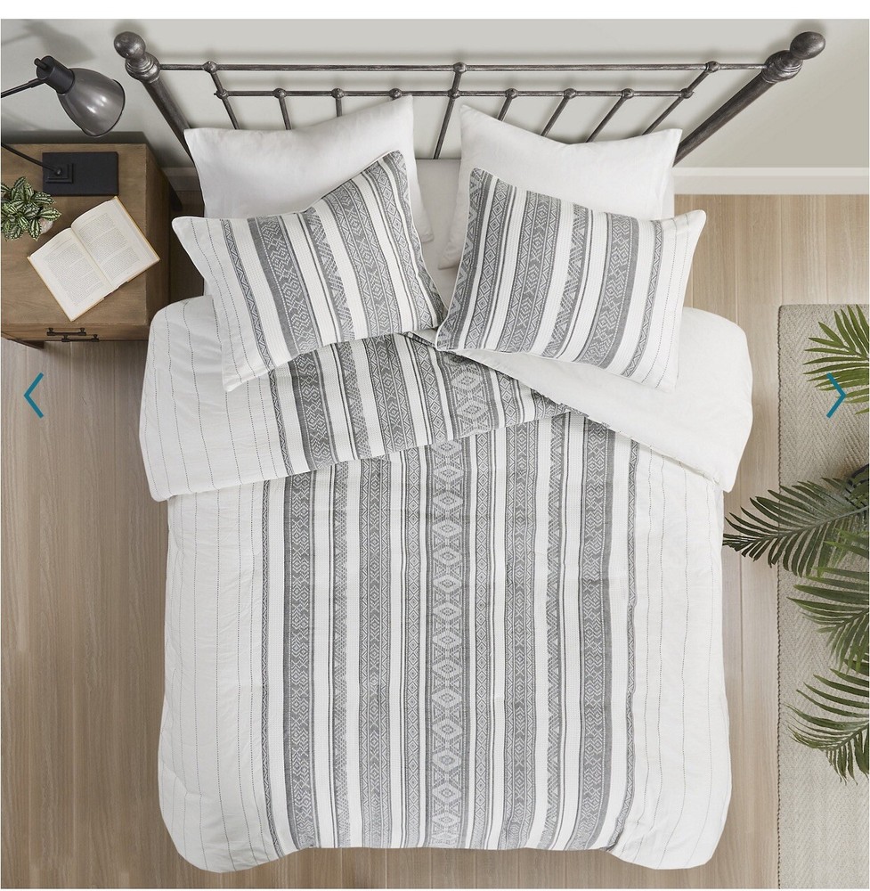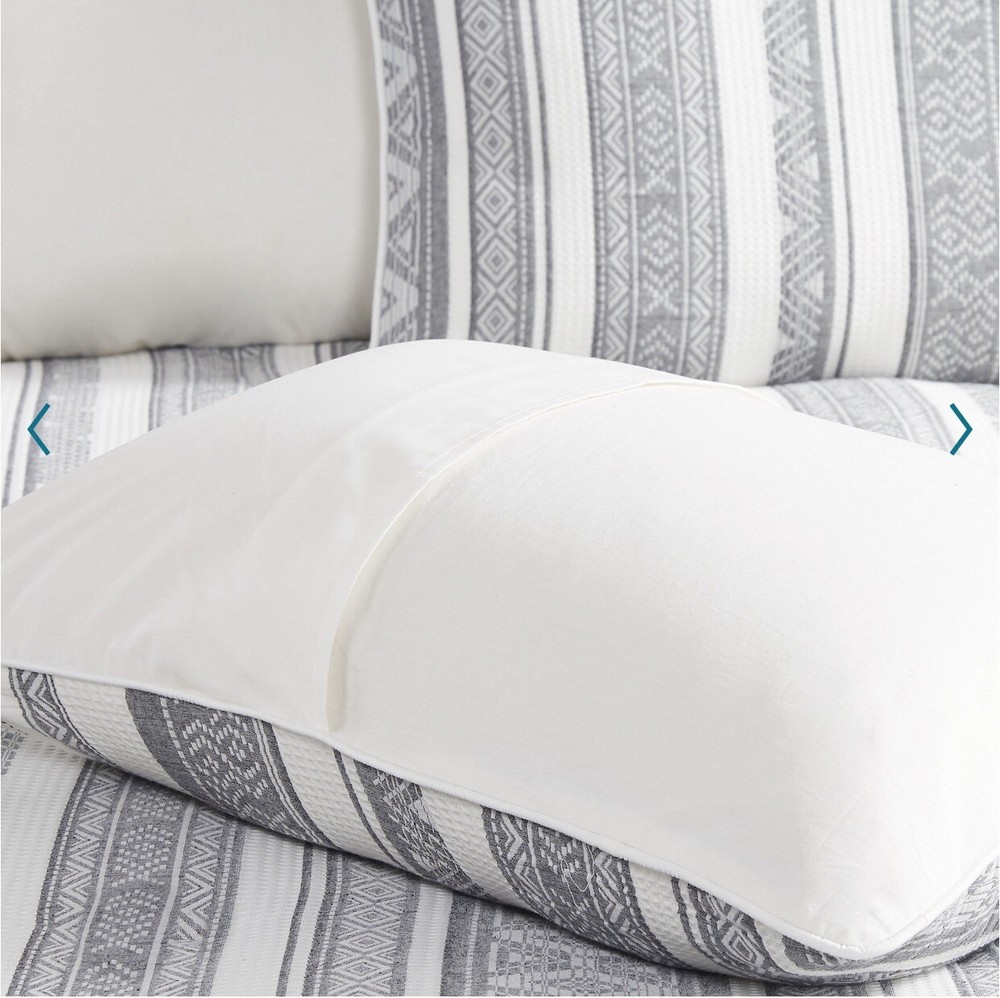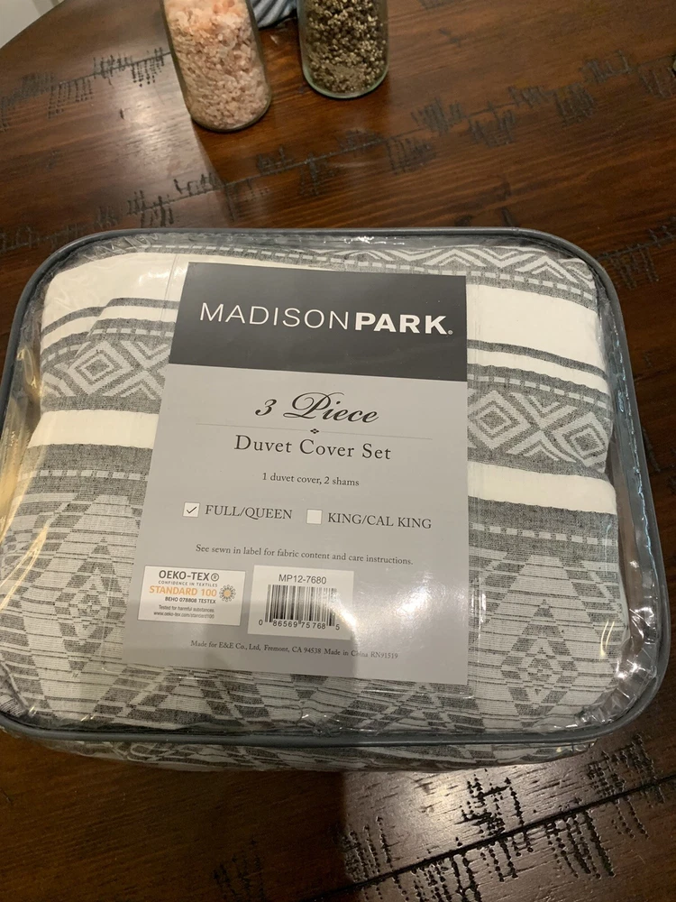 This design was sold under the name Ezra or Kaiden depending on retailer. Hard to Find since sold out on most websites Elevate the look and feel of your space with this stylish Madison Park Ezra Cotton Waffle Jacquard Duvet Cover Set with Shams. PRODUCT FEATURES •Soft •Antimicrobial •Waffle jacquard fabrication •Feature striped design with geometric details •Inside corner ties to secure an insert (not included), button closure FULL/QUEEN SET •3-piece set •Duvet Cover: 90"W x 90"H •2 Standard Shams: 20"W x 26"H CONSTRUCTION & CARE •Cotton •Machine wash •Imported This product was never used but was removed from packaging for viewing only and repackaged.