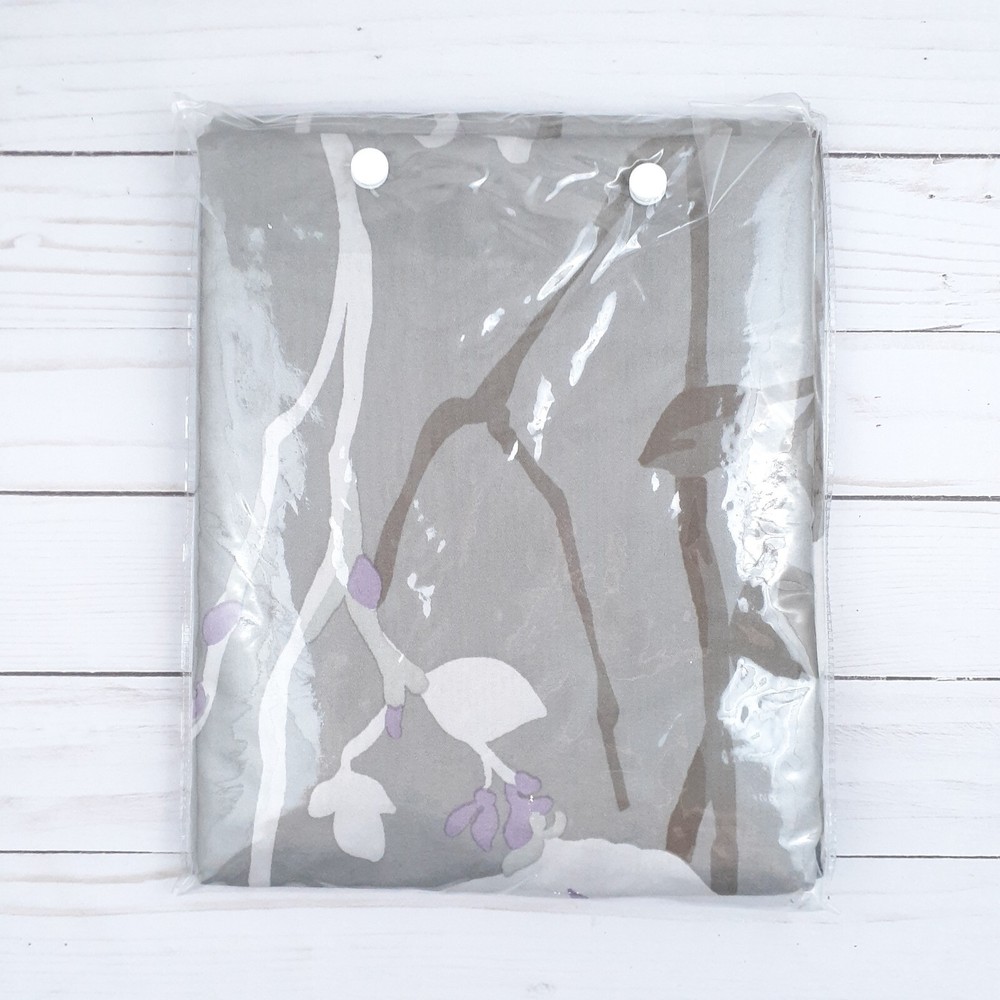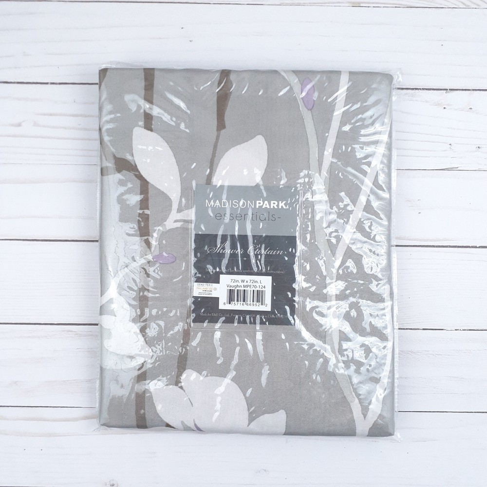This is a new fabric shower curtain It's gray with vines and flowers and small purple leaves Measures 72 x 72 in 100% Polyester Visit my shop for a larger selection Thank you!