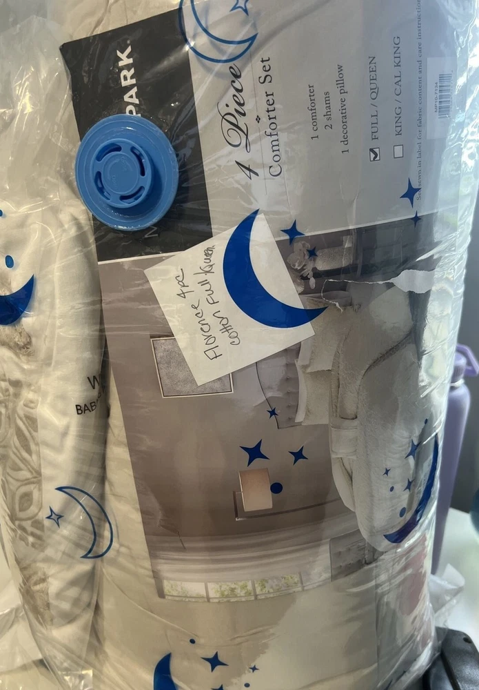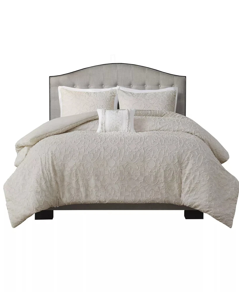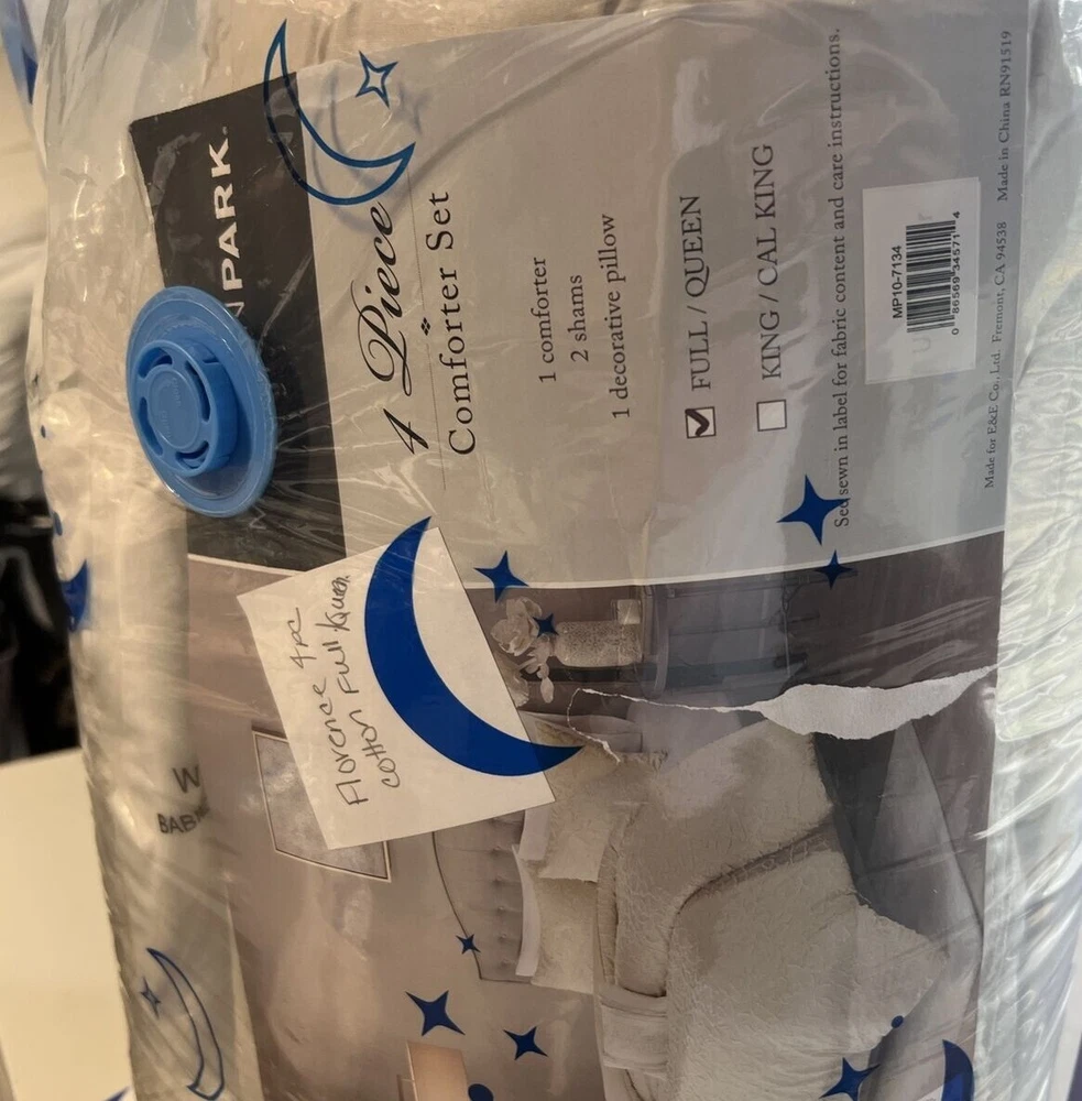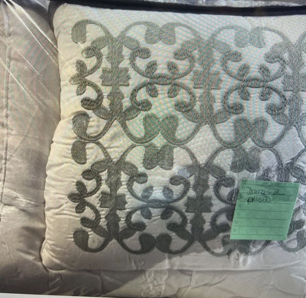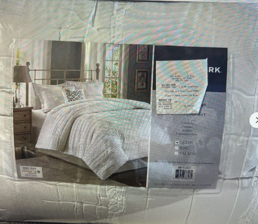 Celeste 5-Pc. Comforter Set, Queen, White: please look close at the photos- the pillow has damage- use the photos as part of the discription: Breathe new life into your bedroom's decor with the classic charm of this Celeste comforter set from Madison Park, featuring ruffled piecing, cozy quilted accents and a refreshing tone. Set includes: queen comforter (90" x 90"), queen bedskirt (60" x 80" + 15"), two standard shams (20" x 26" + 2") and one decorative pillow (16" x 16") Comforter and sham face: microfiber from polyester 85 grams per square meter; polyester reverse; Bedskirt drop and platform: polyester; Decorative pillow: microfiber from polyester; polyester fill; Comforter fill: polyester 80 grams per square meter Machine washable. Spot clean pillows. Imported Florence Cotton 4-Pc. Comforter Set, Full/Queen: The Madison Park Florence 4 Piece Comforter Set offers charming transitional update to your bedroom. Made from 100% cotton, the light taupe comforter and matching shams feature a clipped jacquard face that creates a rich textural look and feel. Full/Queen comforter dimensions- 90" L x 90" W Standard shams dimensions- 20" L x 26" W Decorative pillow dimensions- 12" L x 16" W Set includes 1 comforter, 2 shams, 1 decorative pillow Hidden bartacking to secure the comforter filling Comforter and Sham- Cotton Clipped Jacquard Face and Cotton Back, Comforter- Polyester Filling, Pillow- Cotton Cover, Polyester Filling Machine Washable Imported