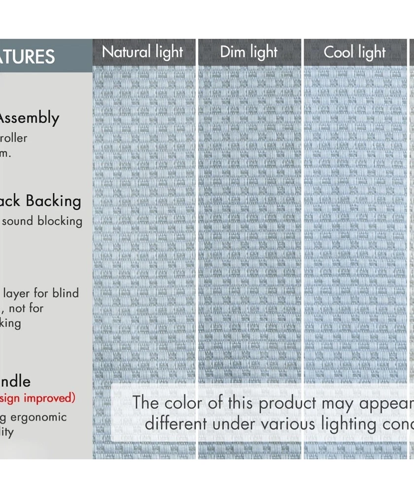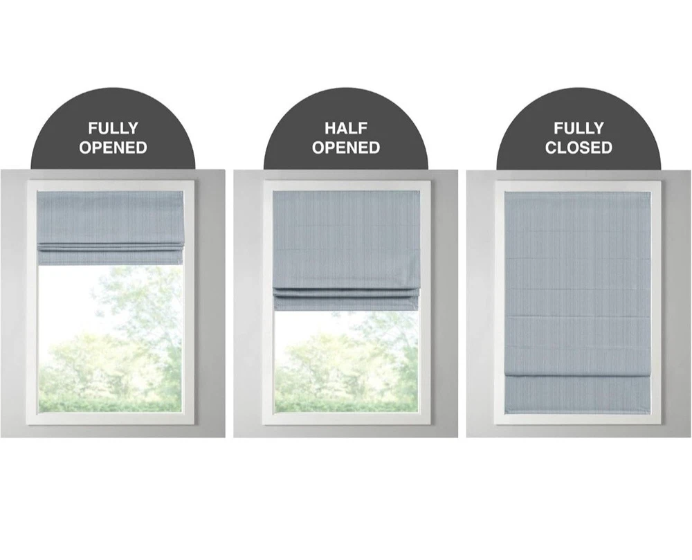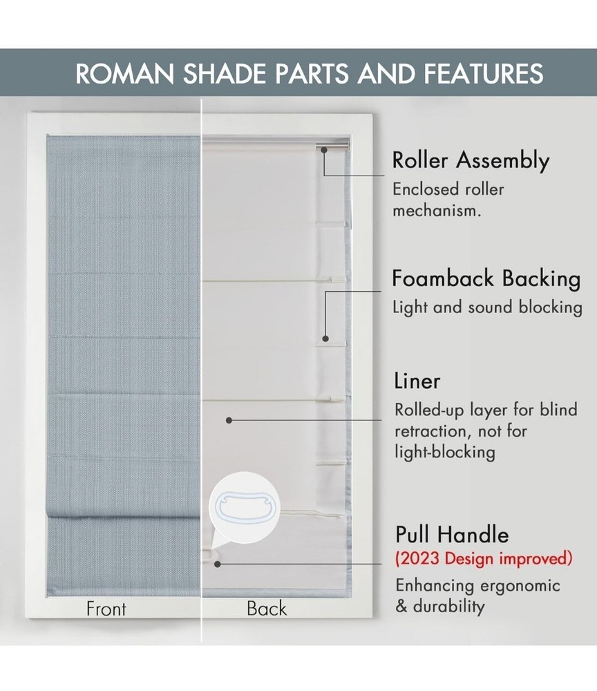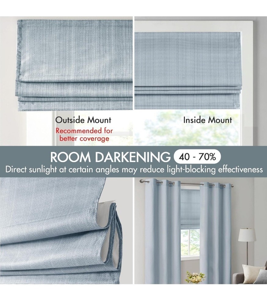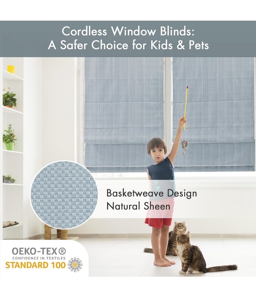 Madison Park Galen Roman Shade in a modern style, featuring a solid basket weave design in a light filtering blue polyester material. This cordless shade is 23 inches wide and 64 inches long, designed to be mounted on the window frame. Ideal for any room, this shade provides privacy and light control while adding a touch of contemporary elegance to your space.