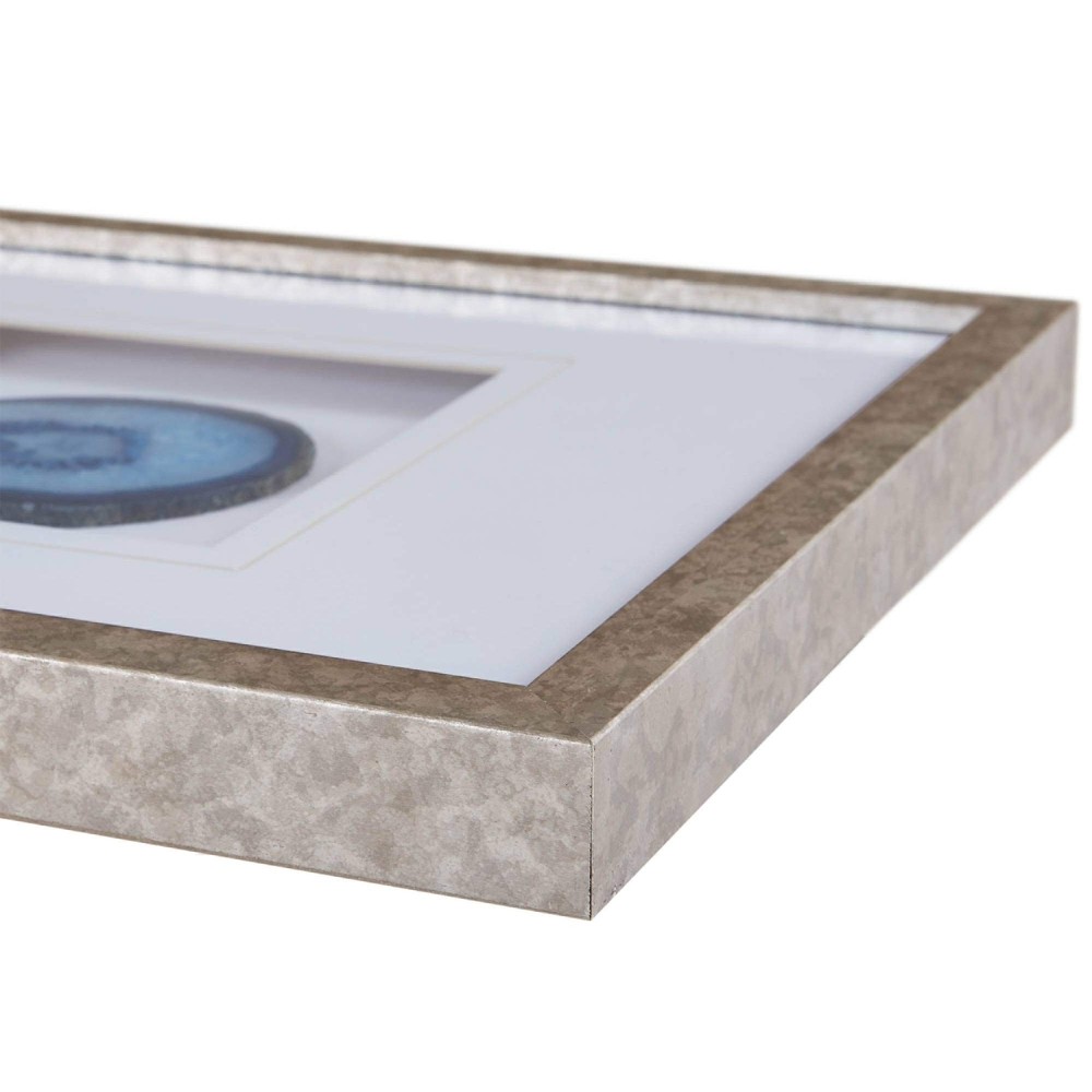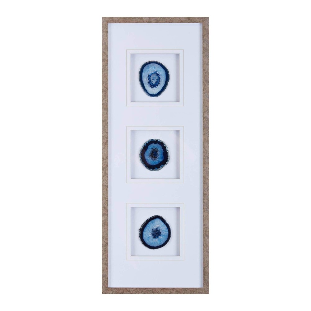Madison Park Genuine Agate Wall Art Living Room Décor - Glass Framed 4 Inch Real Geode Stone Modern Lifestyle Entry Way Decoration, Ready to Hang Panel for Bedroom, 34"W x 13"H x 1.25"D, Blue Product Details Color: Blue Style Name: Trio Brand: Madison Park MPN: MP95G-0006 UPC: 675716680824 EAN: 0675716680824 Recommended Uses For Product: Home Seasons: spring, summer, autumn, winter Color Family: blue Orientation: Landscape Color: Blue Item Shape: Rectangular Style: Trio Theme: Modern Wall Art Form: Wall Hanging Decor Room Type: Bedroom,Home,Living,Living Room,Office Mounting Type: Wall Mount Frame Type: Framed Special Features: Unique Framing Global Trade Identification Number: 24 UPC: 675716680824 Package Type: Standard Packaging Manufacturer: Madison Park Number of Items: 1 Brand Name: Madison Park Paint Type: Oil Material: Glass Paper Finish: Matte Frame Material: Glass Cover Material: Glass Item Weight: 5.9 Pounds Size: 34"W x 13"H x 1.25"D Item Dimensions L x W: 34"L x 13"W Unit Count: 1 Count 34"W x 13"H x 1.25"D Product Features - High quality 100% real 3 agate stones come in glass framed panel.(Color variations may occur from the image due to the natural state of each agate stone) Lifestyle - Modern classic beautiful natural agate stones will create the perfect accent for your living space Placement - This wallart has a flexible placement, perefect in semi-formal setting to accent your home office, wall art for living room Clean - Spot clean only do not use bleach or any harsh chemical solution to maintain original color quality Elevate your space with the Madison Park Blue Agate Trio by Artist Studio 5. Featuring 100% real 4" agate stones in rich blue hues, each geode stone is cut into a one of a kind piece. The stones are settled on a single matte white ground and placed under glass for a gallery look and feel, while a unique warm frame provides the finishing touch. With 3 D-rings on the reverse; easily display this 34x13" singe wall art vertically or horizontally for a natural and modern update to fit space or decor. Due to the natural properties of each agate stone, colors and shapes of agate may vary from image. Spot clean only.