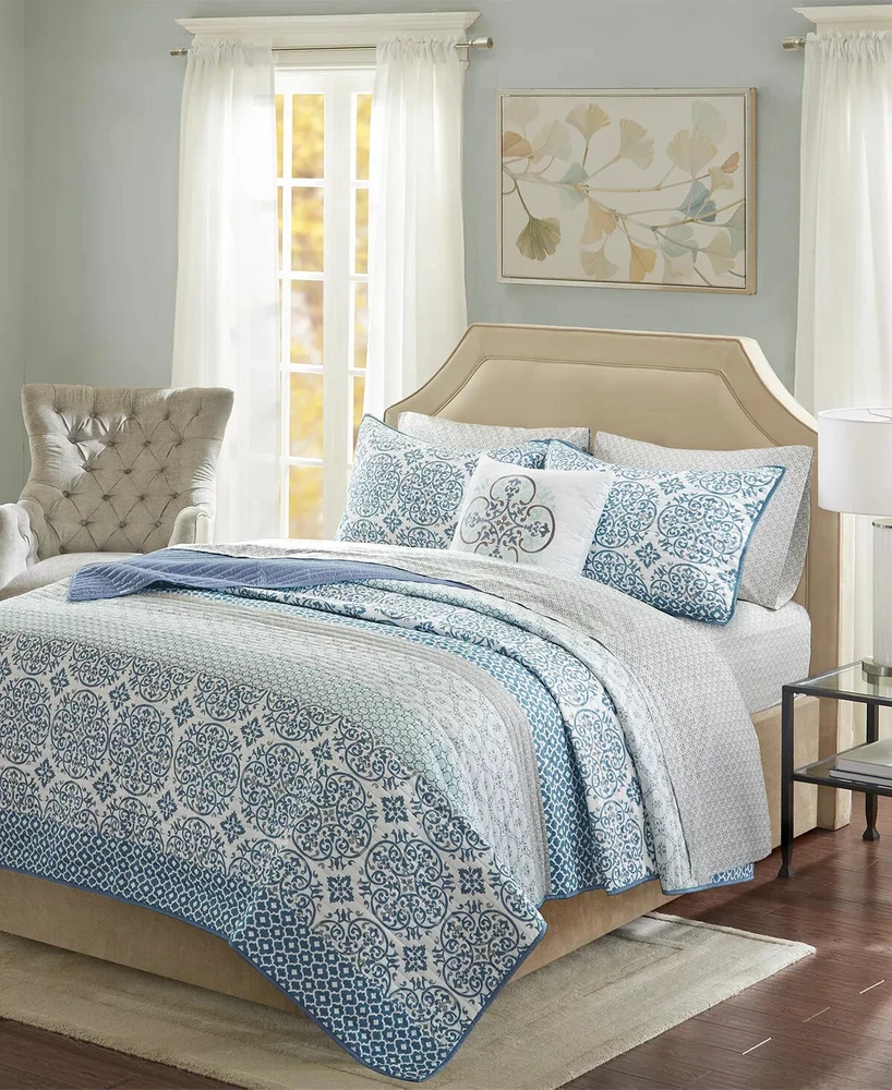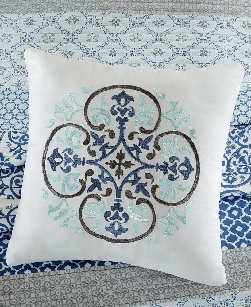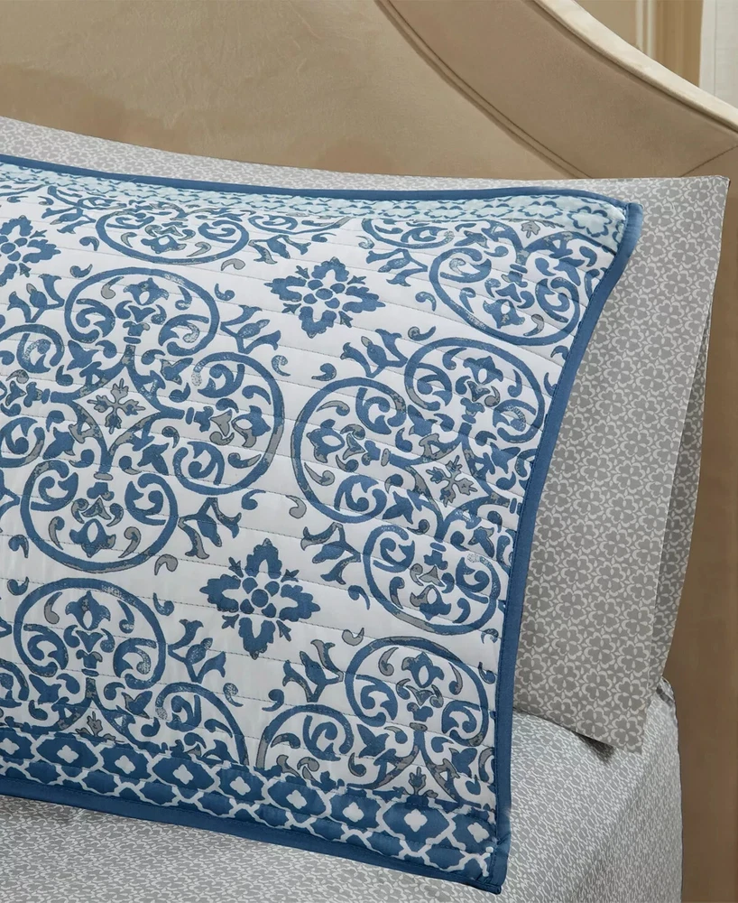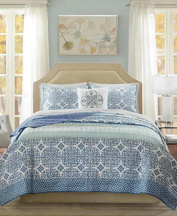 Color: Blue Size: Full Bring a unique and refreshing style to your bedroom with the Essentials Sybil coverlet set from Madison Park. The beautiful coverlet features a globally-inspired geometric motif in subtle, gorgeous hues, with two coordinating shams that complement the pattern to pull the look together. A printed sheet set provides the soft touch of cotton, and a decorative pillow completes the look with intricate embroidery, adding texture and dimension to the top of the bed. Set includes: coverlet (78" x 86"), two standard shams (20" x 26"), flat sheet (81" x 96"), fitted sheet (54" x 75" x 14"), two pillowcases (20" x 30") and one decorative pillow (18" x 18") Geometric motif Coverlet/sham: polyester 85 grams per square meter; pillow (cover): polyester; sheets: cotton; Thread count: 180; pillow fill: polyester; coverlet fill: cotton/polyester/other 240 grams per square meter Machine washable. Spot clean pillows. Imported