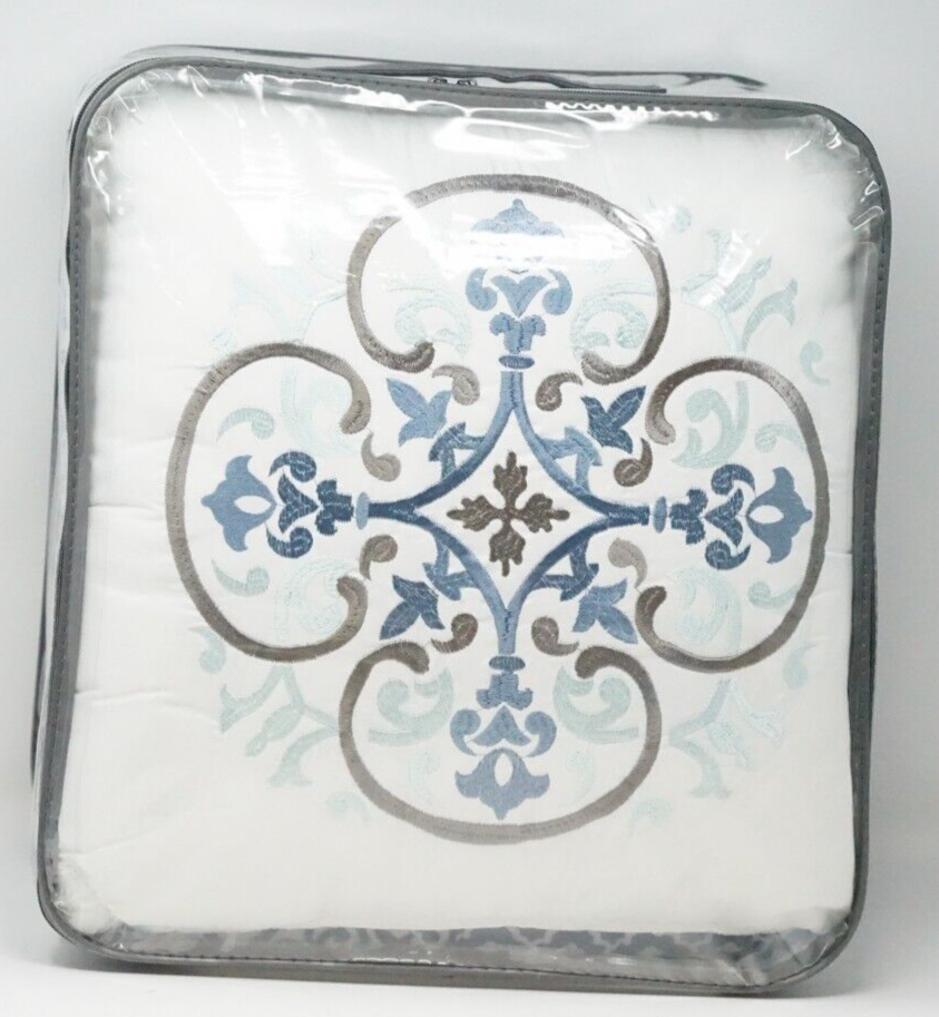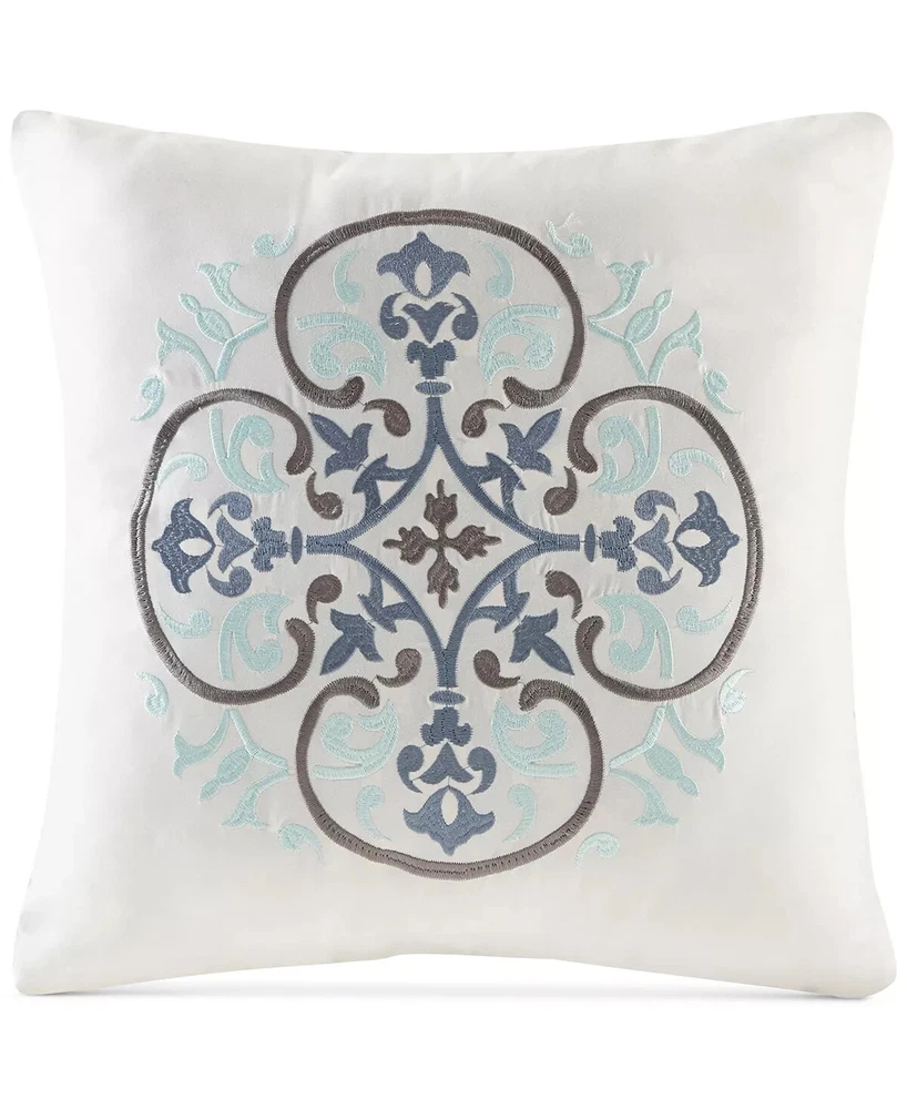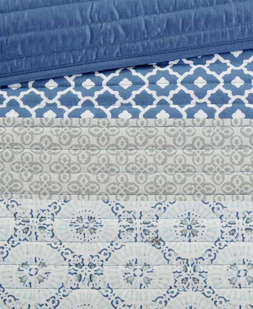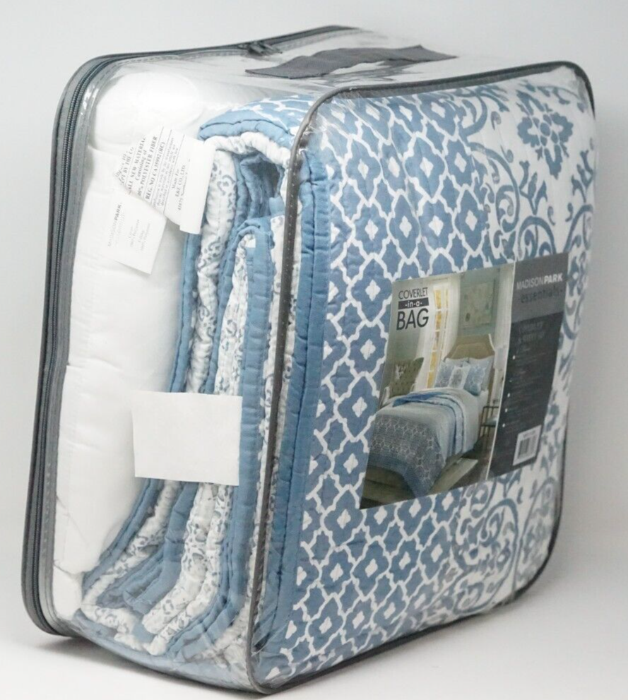 Color: Blue Size: Full Bring a unique and refreshing style to your bedroom with the Essentials Sybil coverlet set from Madison Park. The beautiful coverlet features a globally-inspired geometric motif in subtle, gorgeous hues, with two coordinating shams that complement the pattern to pull the look together. A printed sheet set provides the soft touch of cotton, and a decorative pillow completes the look with intricate embroidery, adding texture and dimension to the top of the bed. Set includes: coverlet (78" x 86"), two standard shams (20" x 26"), flat sheet (81" x 96"), fitted sheet (54" x 75" x 14"), two pillowcases (20" x 30") and one decorative pillow (18" x 18") Geometric motif Coverlet/sham: polyester 85 grams per square meter; pillow (cover): polyester; sheets: cotton; Thread count: 180; pillow fill: polyester; coverlet fill: cotton/polyester/other 240 grams per square meter Machine washable. Spot clean pillows. Imported