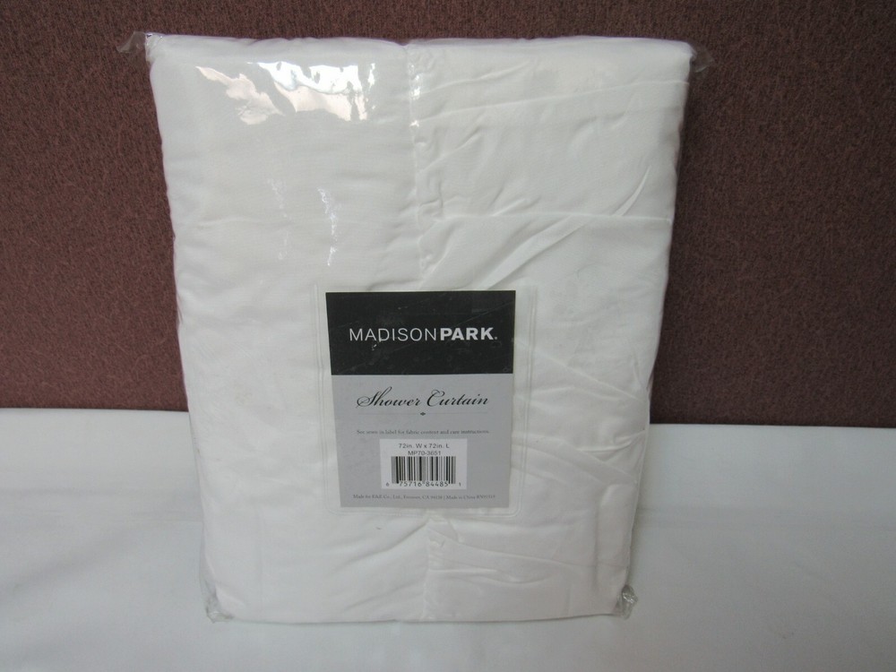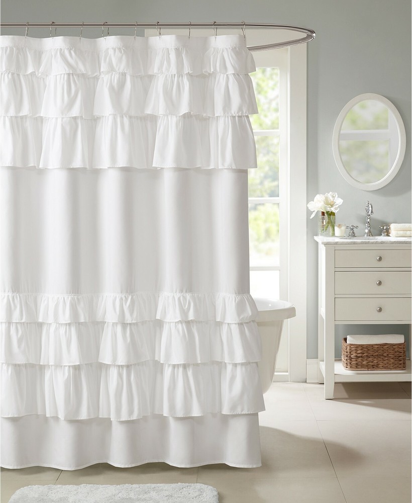 Madison Park Grace 72" x 72" Ruffled Shower Curtain-White T4101613 The Madison Park Grace shower curtain provides the perfect shabby chic update in your space. The solid color fabric features oversize ruffles at the top and bottom of the curtain, creating the perfect delicate look to soften your decor. One shower curtain Dimensions: 72" x 72" Shabby chic style: solid color with layered ruffle detailing Does not include hooks Polyester microfiber Machine Washable Imported