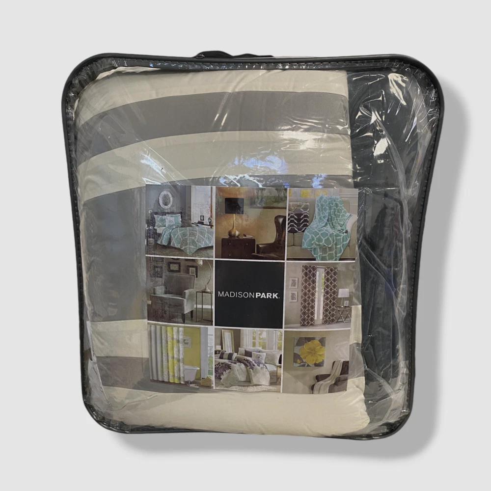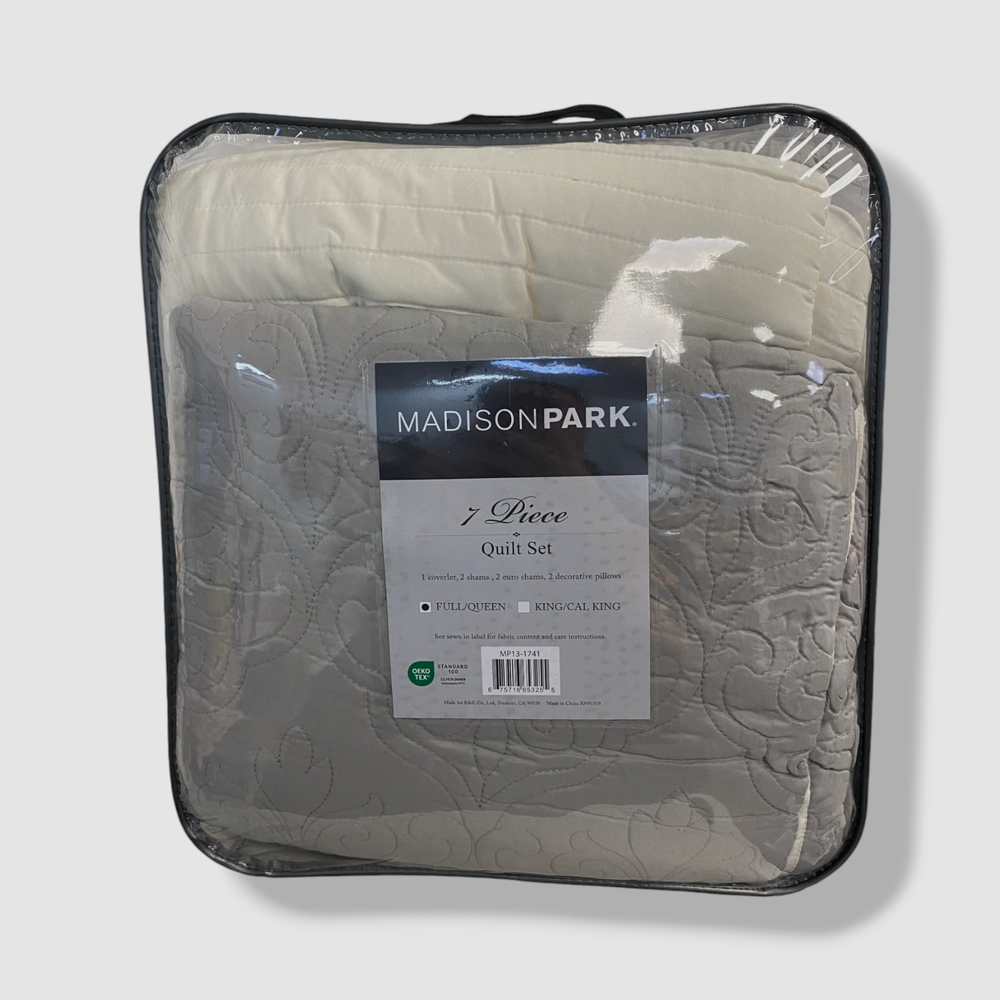 Madison Park Gray Attingham 7-Piece Reversible Full/Queen Coverlet Set Description Set includes: coverlet (90" x 90"), two European shams (26" x 26"), two standard shams (20" x 26") and two pillows (16" x 16", 12" x 18") Quilted Reversible Coverlet/pillows: polyester; shams: polyester; coverlet fill: cotton/polyester; pillow fill: polyester Machine washable. Spot clean pillows. Imported About Us We sell only 100% authentic clothing from new with tags to gently used. We have a 100% authentic or money back guarantee on every item we sell. Items are listed daily so make sure to put us on your favorite! We have been in business for over 10 years selling tens of thousands of designer items. We strive to meet your designer needs at a quality price! Payment Shipping Returns Payment accepted via paypal, credit/debit card. Shipping is usually within 24 hours of purchase (M-F). Super fast service. Tracked delivery. 100% satisfaction guaranteed. Please review our eBay return policy for more details.