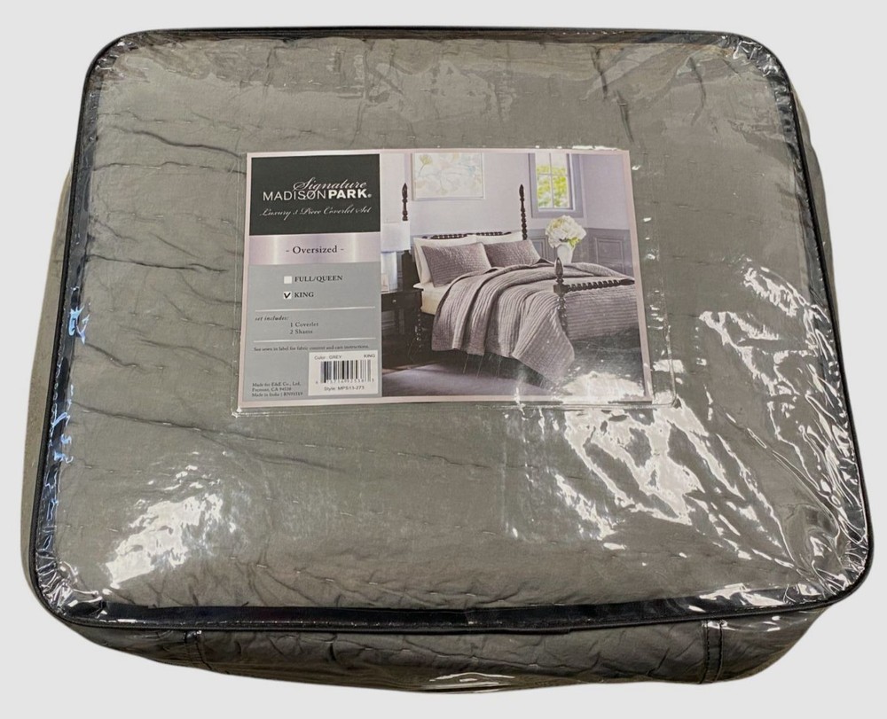 Madison Park Gray Signature Serene Hand Quilted 3-Pc. Coverlet Set Size King Description Coverlet - 110" x 96", 2 Shams - 20" x 36" Includes - Coverlet, 2 Shams Bedding is oversized for better draping coverage in high depth mattress Fabric Pattern - Solid Coverlet/Sham - 100% Cotton Volie, Coverlet Fill - 250Gram 100% Cotton Machine Washable Imported About Us We sell only 100% authentic clothing from new with tags to gently used. We have a 100% authentic or money back guarantee on every item we sell. Items are listed daily so make sure to put us on your favorite! We have been in business for over 10 years selling tens of thousands of designer items. We strive to meet your designer needs at a quality price! Payment Shipping Returns Payment accepted via paypal, credit/debit card. Shipping is usually within 24 hours of purchase (M-F). Super fast service. Tracked delivery. 100% satisfaction guaranteed. Please review our eBay return policy for more details.