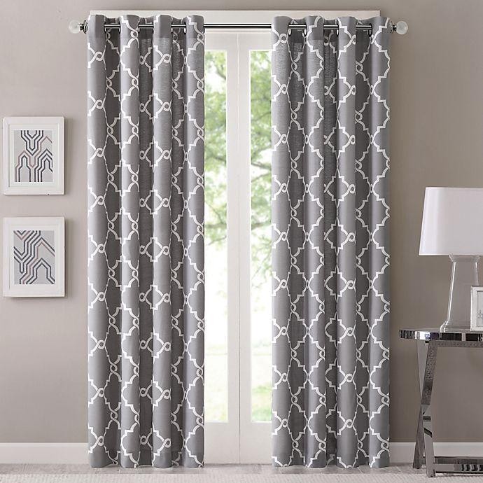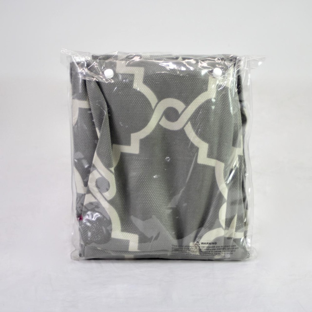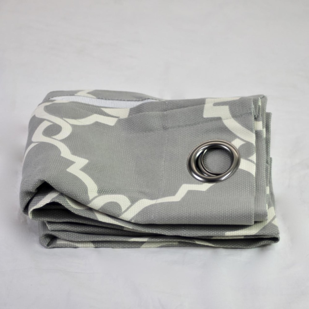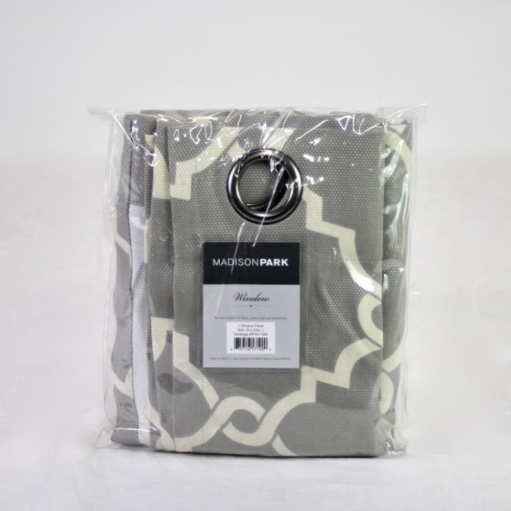 Opened Package. The Madison Park Window Curtain Panel features a scrolled, geometric pattern set against a neutral background. Printed on a Poly/Cotton blend basket weave fabric that softly filters light. This panel will be a trendy addition to your home. Measurements: 160cm L x 127cm W (63" x50"). Care Instructions: Machine wash cold, gently and separately. Do not bleach. Tumble dry low. Remove promptly. Do not iron.