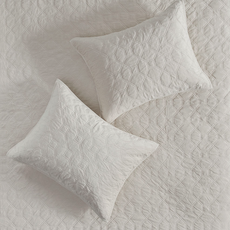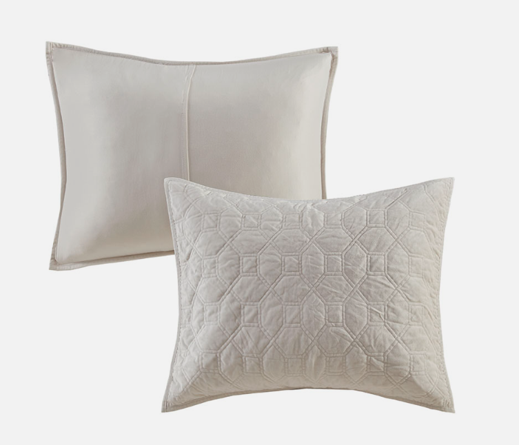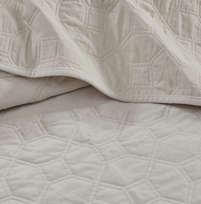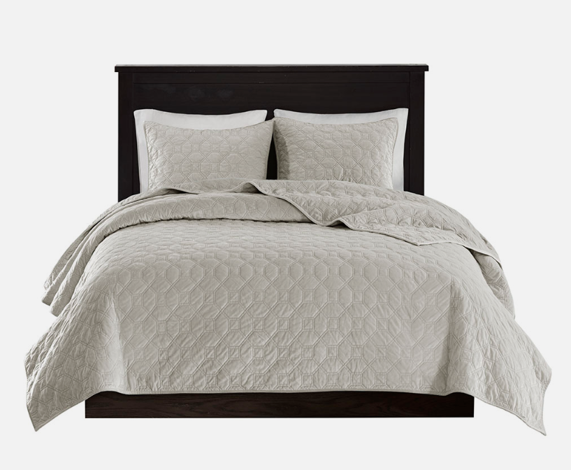 The Madison Park Harper Velvet 3 Piece Quilt Set offers a casual and comfortable update to your bedroom. The polyester velvet quilt features a soft texture with a geometric quilted design, for a rich look and feel. Matching shams pair beautifully with the quilt to complete the quilt set. Providing a charming layering piece to your bed, this quilt has an antimicrobial treatment that helps reduce bacteria buildup and odors, keeping the fabric fresh longer. FEATURES • Elegant and soft velvet quilt set in geometric quilting technique • Great for added layer for extra warmth in cold season • Set includes 1 quilt and 2 matching shams • Cotton filling for comfort and durability • Anti-microbial treatment for health and wellness - helps reduce the growth of odor causing bacteria and keeps fabric lasting longer • Machine washable for easy care MATERIAL Quilt/Sham: 100% Polyester velvet with quilted face, microfiber reverse Fill: 90% Cotton, 10% other fiber filling Prewash Finish King/California King Quilt Set includes: 1 Quilt: 104"W x 94"L 2 King Shams: 20"W x 36"L + 0.5"D