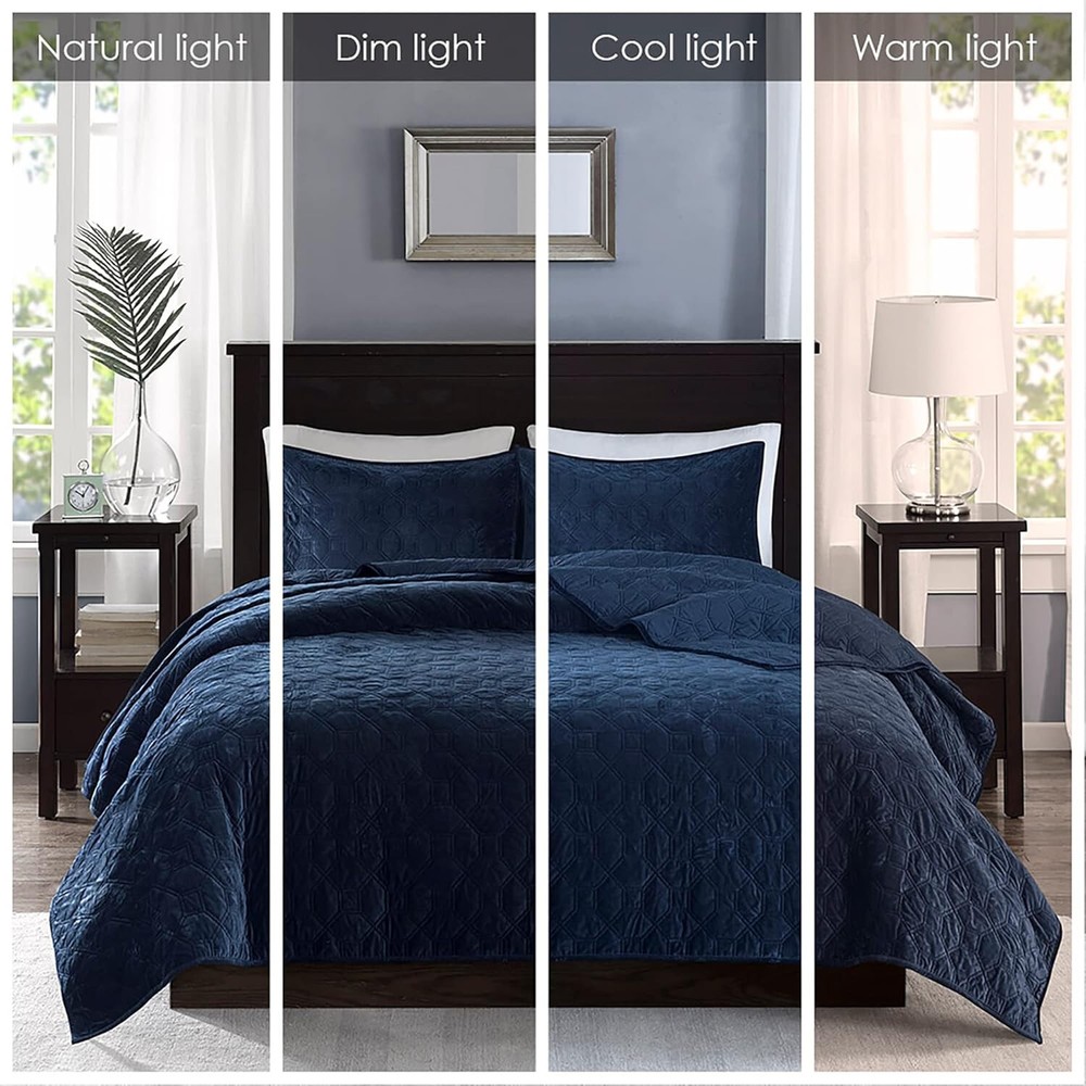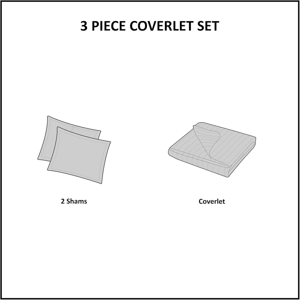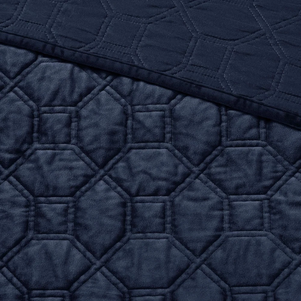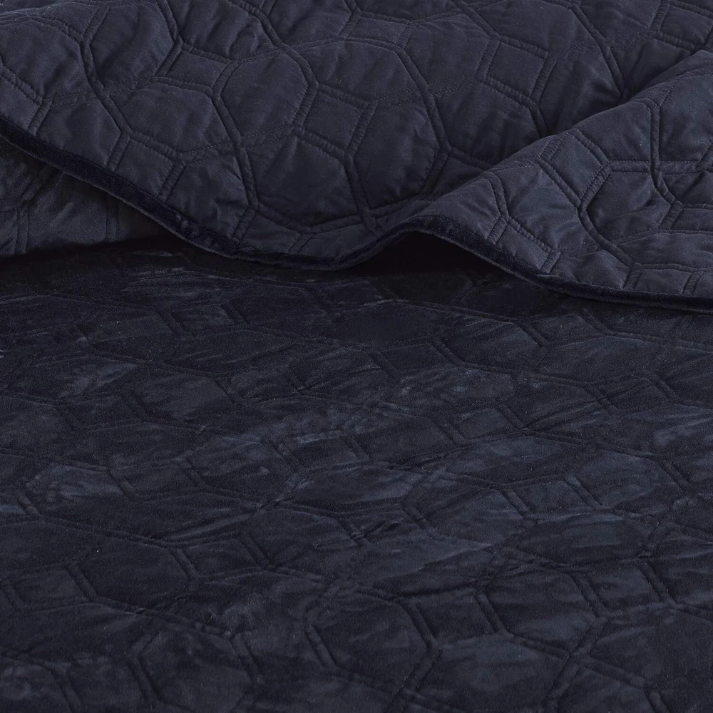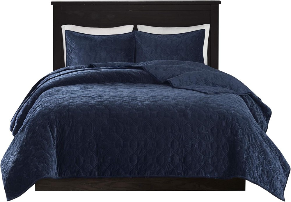 ***Item Description:*** 100% Polyester Imported Elegant and soft velvet coverlet set in geometric quilting technique Great for added layer for extra warmth in cold season Set includes coverlet and 2 matching shams Cotton filling for comfort and durability Coverlet/Shams: 100% polyester velvet with quilted face, 85gsm microfiber back, 240gsm 90%cotton, 10%other fiber filling, prewash. 1 Coverlet:104x94" 2 King Shams:20x36+0.5"(2) MACHINE WASH COLD, GENTLE CYCLE, AND SEPARATELY. DO NOT BLEACH. TUMBLE DRY LOW, REMOVE PROMPTLY, DO NOT IRON. IF THERE IS NO FREE MOVEMENT IN THE WASHER OR DRYER, USE LARGE CAPACITY COMMERCIAL WASHER/DRYER.