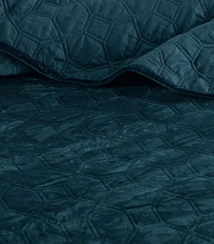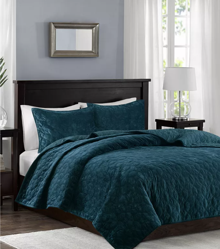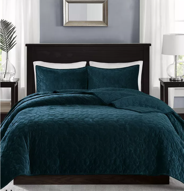 Madison Park Harper Teal Velvet Coverlet Quilt 3 Piece Set Includes: Quilt and 2 King Pillow Covers No holes or stain. Never used, never washed. Not in plastic packaging but in box that it was shipped in. Please feel free to as any questions. The Madison Park Harper Velvet 3 Piece Quilt offers a casual and comfortable update to your bedroom. The polyester velvet quilt features a soft texture with a geometric quilted design, for a rich look and feel. Features: • Great for added layer for extra warmth in cold season • Set includes 1 quilt and 2 matching shams • Cotton filling for comfort and durability • Anti-microbial treatment for health and wellness - helps reduce the growth of odor causing bacteria and keeps fabric lasting longer • Machine washable for easy care Fast Shipping!!! Thank you for looking!!!