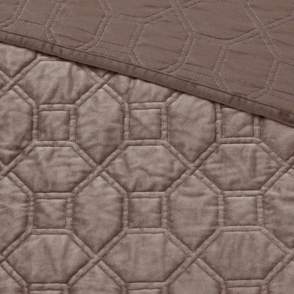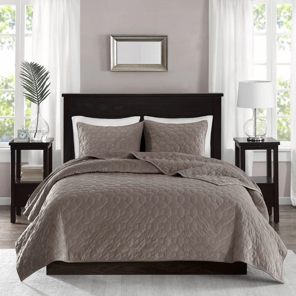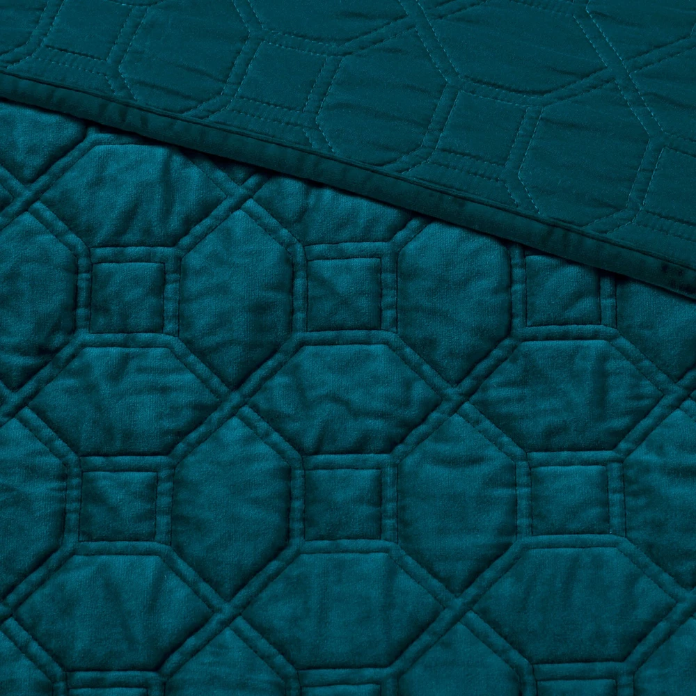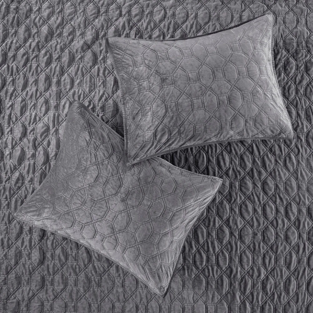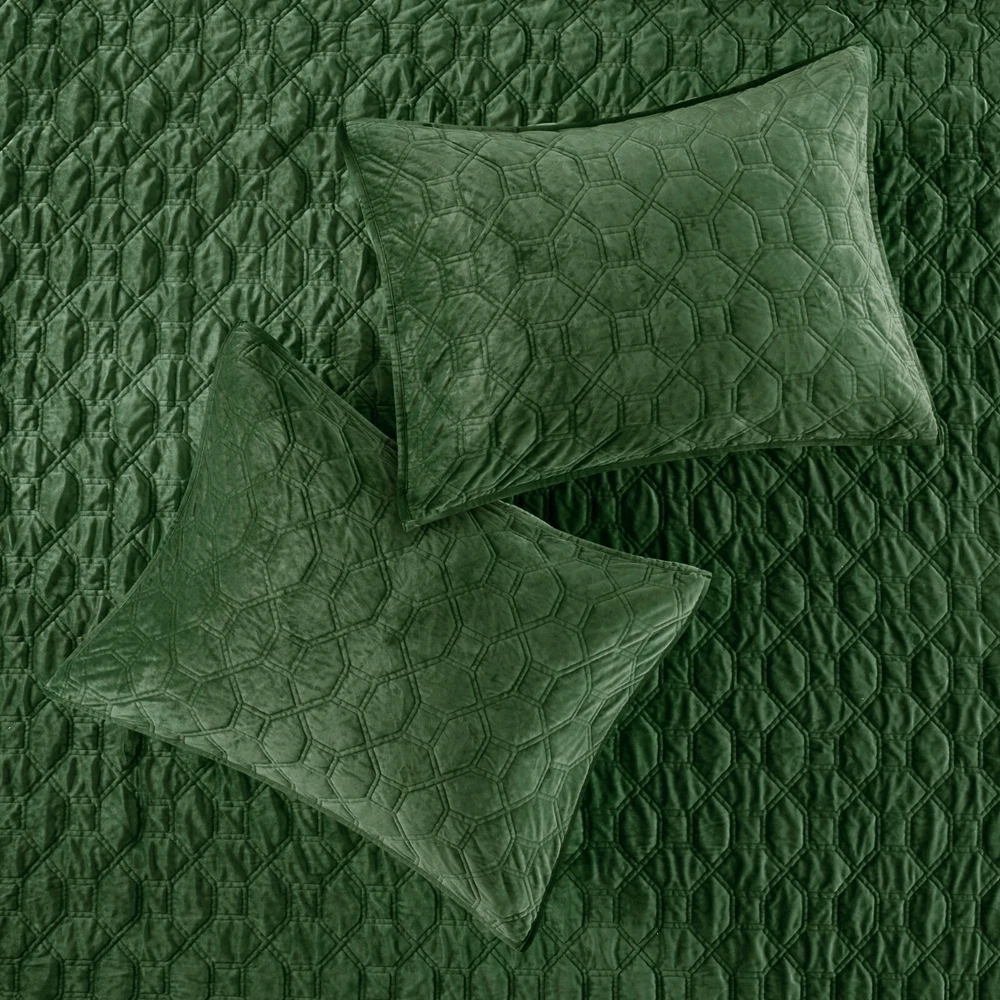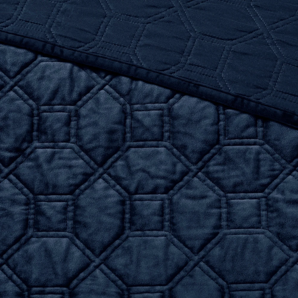 Store Categories Store Categories Bedding Comforters Decorative Pillows Duvet Covers Quilts & Coverlets Sheets Blankets & Throws Mattress Pads Pillows Home Decor Window Treatments Wall Art Home Accents Furniture Beds Dining Seating Ottomans & Benches Accent Chairs Accent Tables Dining Tables Sofas Bath Bath Robes Shower Curtains Towels Bath Rugs Bath Accessories Apparel Pajama Sets Nightgowns Rugs Rugs & Carpets Lighting Lamp Pendant Other Product Overview Details DESCRIPTION The Madison Park Harper Velvet 3 Piece Quilt Set offers a casual and comfortable update to your bedroom. The polyester velvet quilt features a soft texture with a geometric quilted design, for a rich look and feel. Matching shams pair beautifully with the quilt to complete the quilt set. Providing a charming layering piece to your bed, this quilt has an antimicrobial treatment that helps reduce bacteria buildup and odors, keeping the fabric fresh longer. FEATURES • Elegant and soft velvet quilt set in geometric quilting technique • Great for added layer for extra warmth in cold season • Set includes 1 quilt and 2 matching shams • Cotton filling for comfort and durability • Anti-microbial treatment for health and wellness - helps reduce the growth of odor causing bacteria and keeps fabric lasting longer • Machine washable for easy care MATERIAL Quilt/Sham: 100% Polyester velvet with quilted face, microfiber reverse Fill: 90% Cotton, 10% other fiber filling Prewash Finish Available Sizes: Full/Queen Quilt Set includes: 1 Quilt: 90"W x 90"L 2 Standard Shams: 20"W x 26"L + 0.5"D King/California King Quilt Set includes: 1 Quilt: 104"W x 94"L 2 King Shams: 20"W x 36"L + 0.5"D DESCRIPTION The Madison Park Harper Velvet 3 Piece Quilt Set offers a casual and comfortable update to your bedroom. The polyester velvet quilt features a soft texture with a geometric quilted design, for a rich look and feel. Matching shams pair beautifully with the quilt to complete the quilt set. Providing a charming layering piece to your bed, this quilt has an antimicrobial treatment that helps reduce bacteria buildup and odors, keeping the fabric fresh longer. FEATURES • Elegant and soft velvet quilt set in geometric quilting technique • Great for added layer for extra warmth in cold season • Set includes 1 quilt and 2 matching shams • Cotton filling for comfort and durability • Anti-microbial treatment for health and wellness - helps reduce the growth of odor causing bacteria and keeps fabric lasting longer • Machine washable for easy care MATERIAL Quilt/Sham: 100% Polyester velvet with quilted face, microfiber reverse Fill: 90% Cotton, 10% other fiber filling Prewash Finish Available Sizes: Full/Queen Quilt Set includes: 1 Quilt: 90"W x 90"L 2 Standard Shams: 20"W x 26"L + 0.5"D King/California King Quilt Set includes: 1 Quilt: 104"W x 94"L 2 King Shams: 20"W x 36"L + 0.5"D